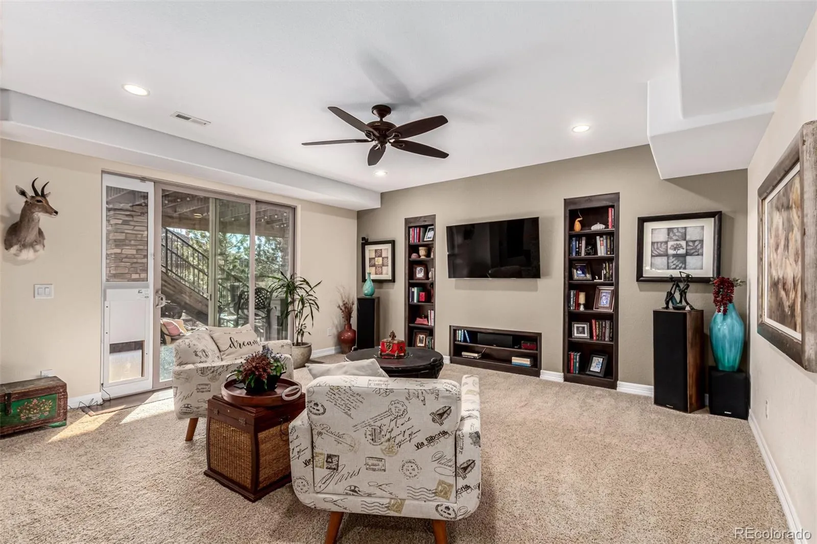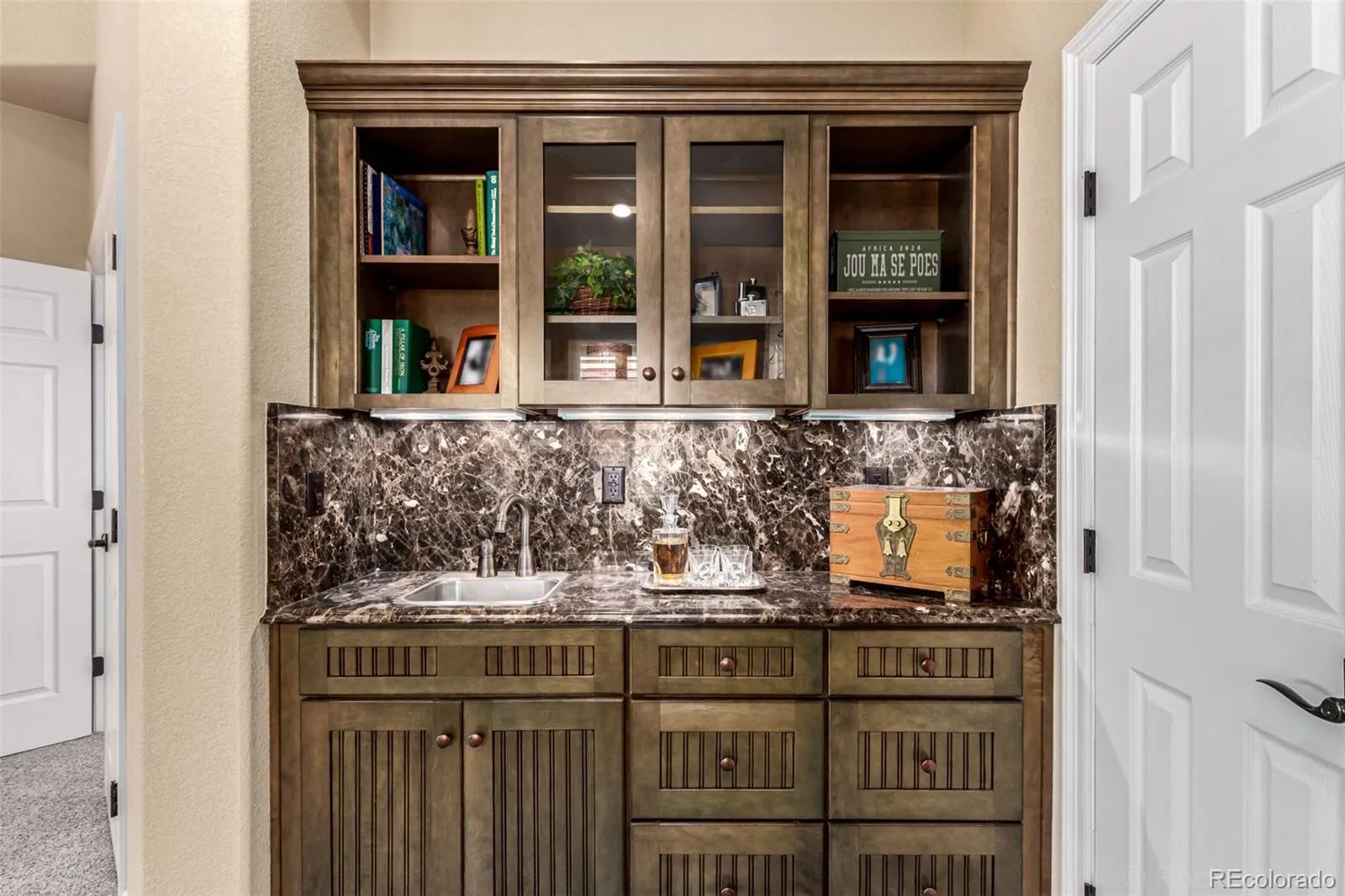 Toll Brother’s Model home for the highly sought after Pine Bluffs Community. This home is absolutely amazing! Striking stone-accented façade & exceptional design throughout! An inviting entry welcomes you into a thoughtfully designed split floor plan featuring a carpeted living room, surround sound speakers in select rooms, plantation shutters on the right windows, a private den with French doors, & formal dining room w/tray ceiling & Roman pillars. Gourmet kitchen enjoys a large center breakfast bar island with custom granite countertops, a walk-in pantry, gorgeous cabinetry, stone backsplash, SS appliances, & a bright breakfast nook. A versatile bonus room w/wet bar, powder room, & family room centered around a charming fireplace completes the main level! The main retreat has a vaulted ceiling, its own wet bar, & a spa-like ensuite w/separate tub/shower, dual vanities, & walk-in closet. Every bedroom offers the comfort & privacy of its own bathroom! Downstairs, the walk-out basement expands the living space with incredible amenities, including a two-way fireplace, kitchenette, media room, sunny breakfast/poker room, bar and thermostatically controlled wine cellar. Plus, a well-equipped laundry room w/sink & cabinetry. Outside, discover a covered area off the main floor with million dollar views, a covered patio below, a cozy fire pit area, beautiful paver accents, & mature trees galore. Do not miss the 3-car garage for your vehicles! The pride of ownership and the Crown Jewel of Pine Bluffs. This highly desired neighborhood features dense, heavily treed topography literally minutes from all that Parker, Colorado has to offer. See it, love it, live it!