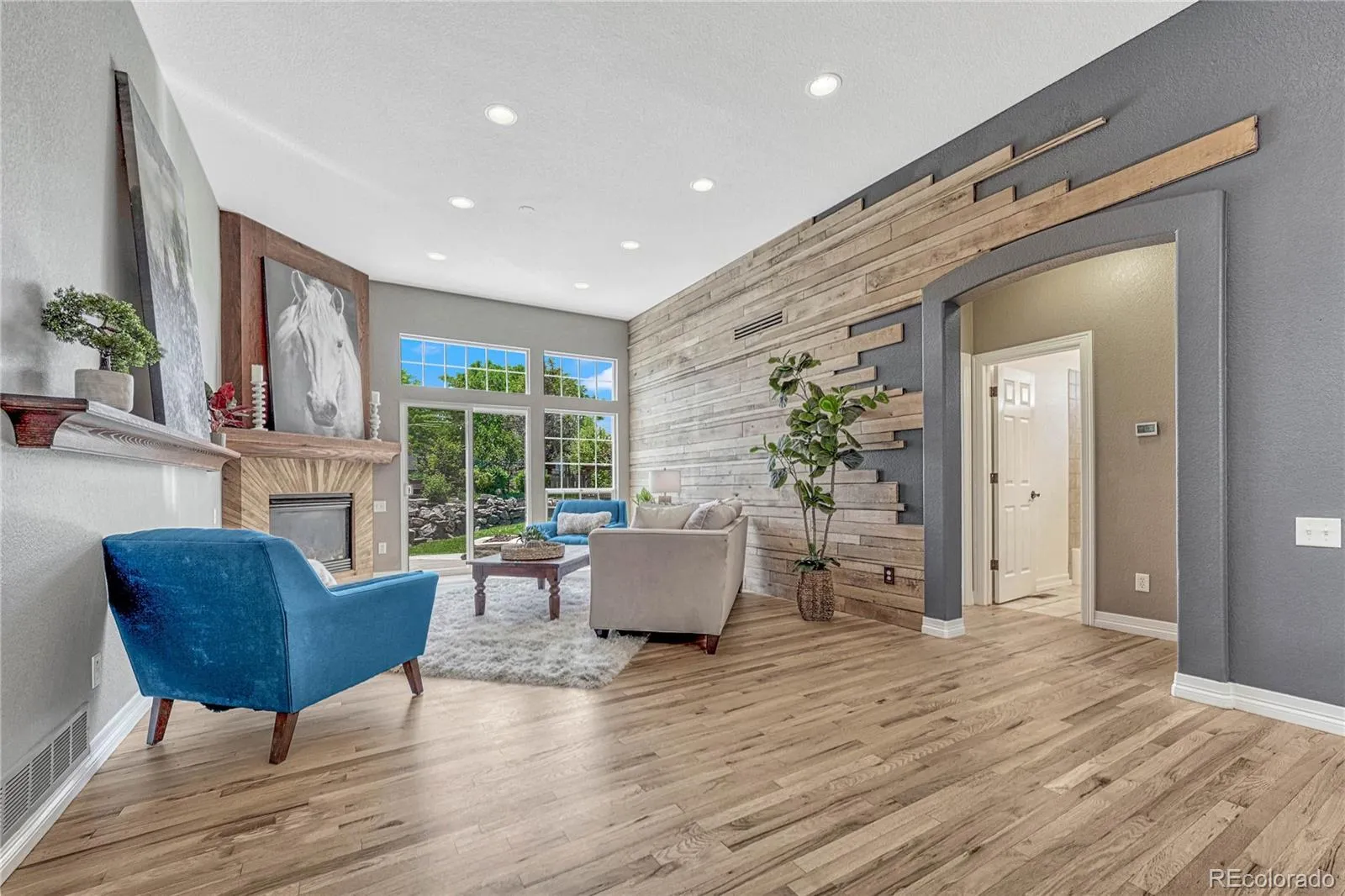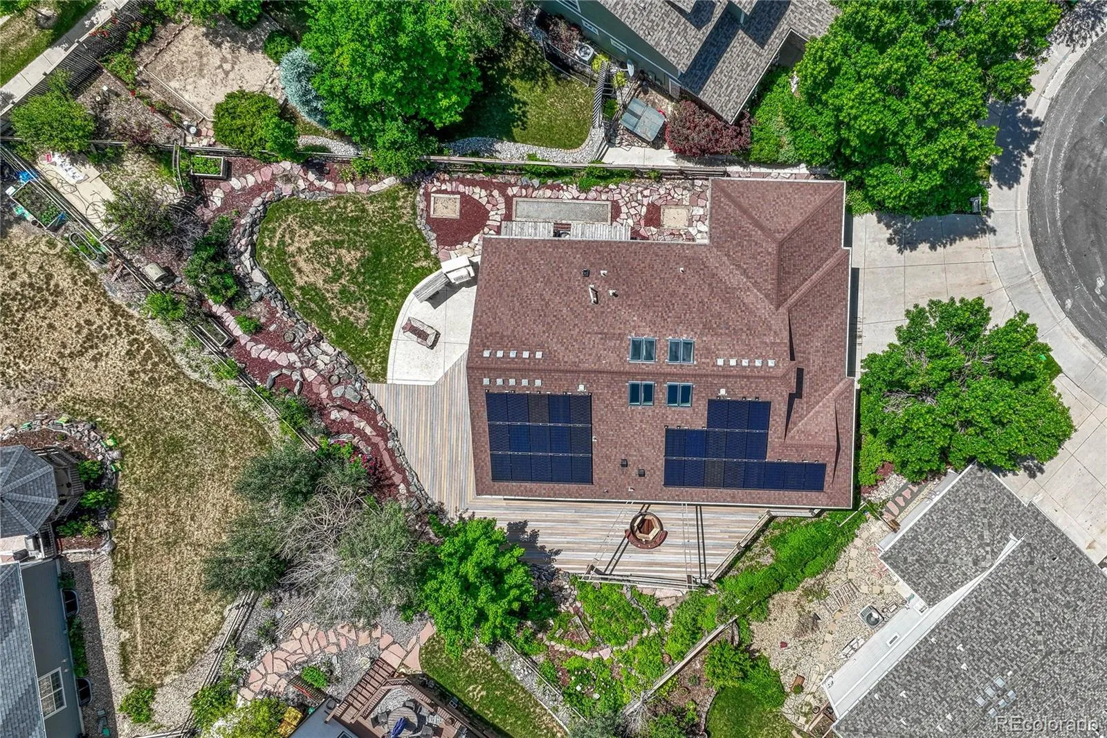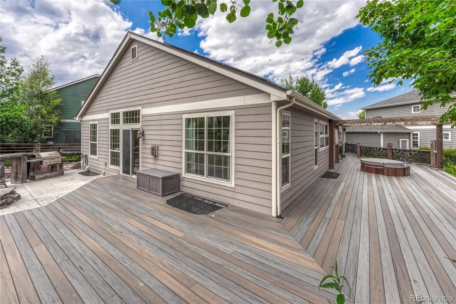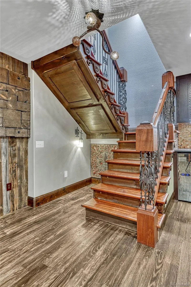 Don’t Live in a Boring Home! Exquisite Home by Internationally Acclaimed Master Craftsman – Unique Design Throughout with Custom Flooring and Artistic Living Spaces. Sought after ranch style home on a well-maintained cul-de-sac offers 5BR/3BA/3CAR and a paid off solar system! KITCHEN: Spacious kitchen includes a large center island, gas cooktop and 8 dramatic skylights on the roof peaks to bring Colorado’s blue sky into the space. Kitchen opens to family room featuring a gas fireplace, vaulted ceilings, warm wood wall treatments, and tons of natural light PRIMARY BR/BATH: Private retreat with gorgeous hardwood flooring and handcrafted barn door to ensuite bath. Bathroom features in-floor heat, floating double sink, custom shower with large rain head shower, separate water closet and built-in closet organizers. Two additional bedrooms (one could be an office with built-ins), and a full bath complete the main floor. BASEMENT: Potential for In-Law Suite with two bedrooms and an oversized walk-through closet. Kitchen/wet bar area (check out the custom wood table!), second laundry room (washer/dryer stay) and bath with walk-in shower. Two separate living areas are perfect for a family room, exercise area, etc. BACKYARD OASIS: Retreat to your beautifully landscaped backyard featuring a gated garden area, mature landscaping, hot tub and outdoor TV, gas fire pit, horseshoe pit, wraparound 1200 sq ft deck and outdoor kitchen with smoker and grill – so many spaces to entertain and relax. STORAGE: Custom locker-style cabinets in mud/laundry off the garage, additional storage and cabinets in basement laundry room, and storage room. HOME EXTRAS: 3 Car Garage. NO Carpet, solid hardwood throughout. New furnace (2022) with whole house humidifier. Attic fan. CANTERBERRY HOA: Community pool, tennis, hiking/biking trails throughout, trash/recycling. All within half mile of Legend feeder schools. So many upgrades and custom features that you’ll need to come check it out! Welcome Home.