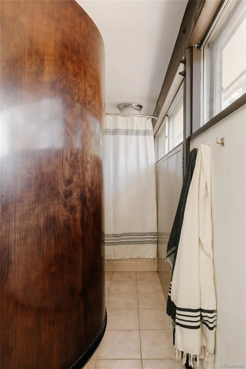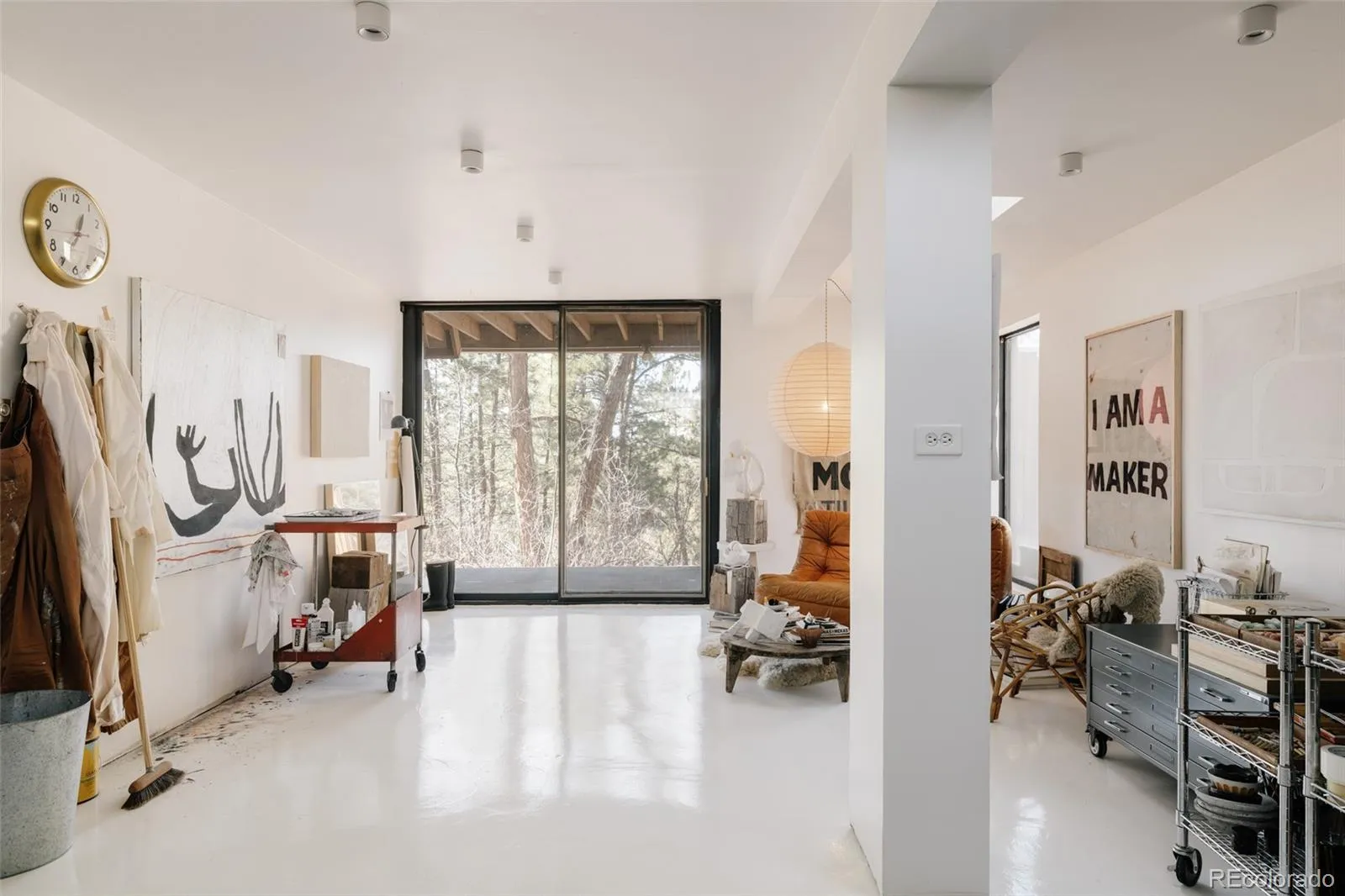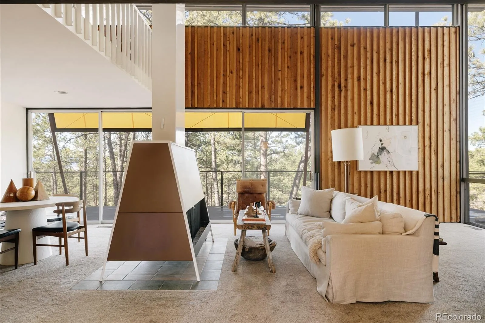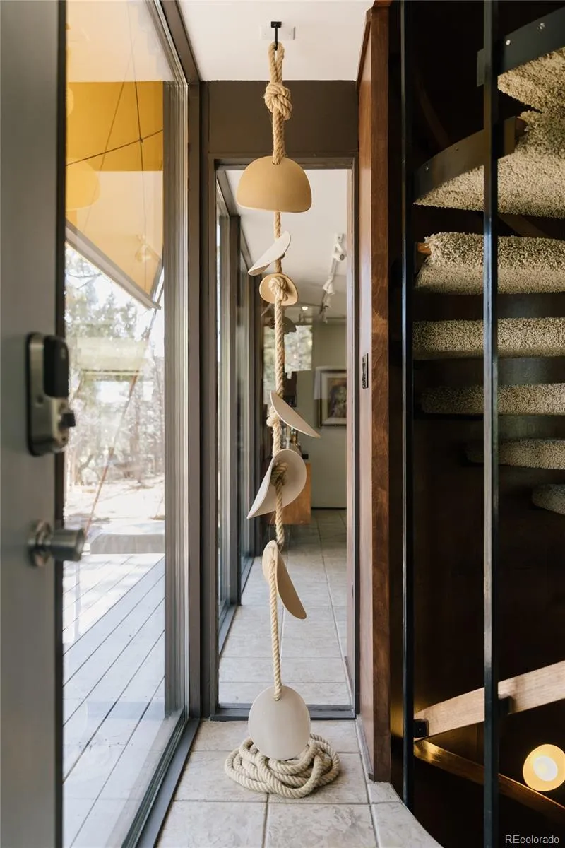 As you approach, colorful built-in awnings interact with the home’s floor-to-ceiling glass. Stained board-and-batten cedar siding wraps the exterior and continues inside, creating visual continuity. A walnut-paneled spiral staircase serves as a sculptural focal point, adding both architectural drama and a playful design element. The main living space is anchored by a central fireplace and surrounded by floor-to-ceiling glazing and sliding glass doors that integrate the indoors with the landscape. The original kitchen is beautifully crafted, complete with distinctive leather pulls. A spacious dining area or flexible den offers additional built-ins and warmth from the combination of cedar, walnut, and glass. The primary suite features a loft area with doors that can be opened or closed to define the private space as desired. It features two closet areas and access to a private upper deck with panoramic mountain views. The spiral staircase continues into the upstairs bathroom, creating a striking architectural detail. The walk-out basement includes a large flexible living space and half bath. A separate artist studio with radiant heat provides an ideal space for creative work, a workshop, or additional flex use. Opportunities to own a home with this level of architectural significance, privacy, and land are exceptionally rare.
