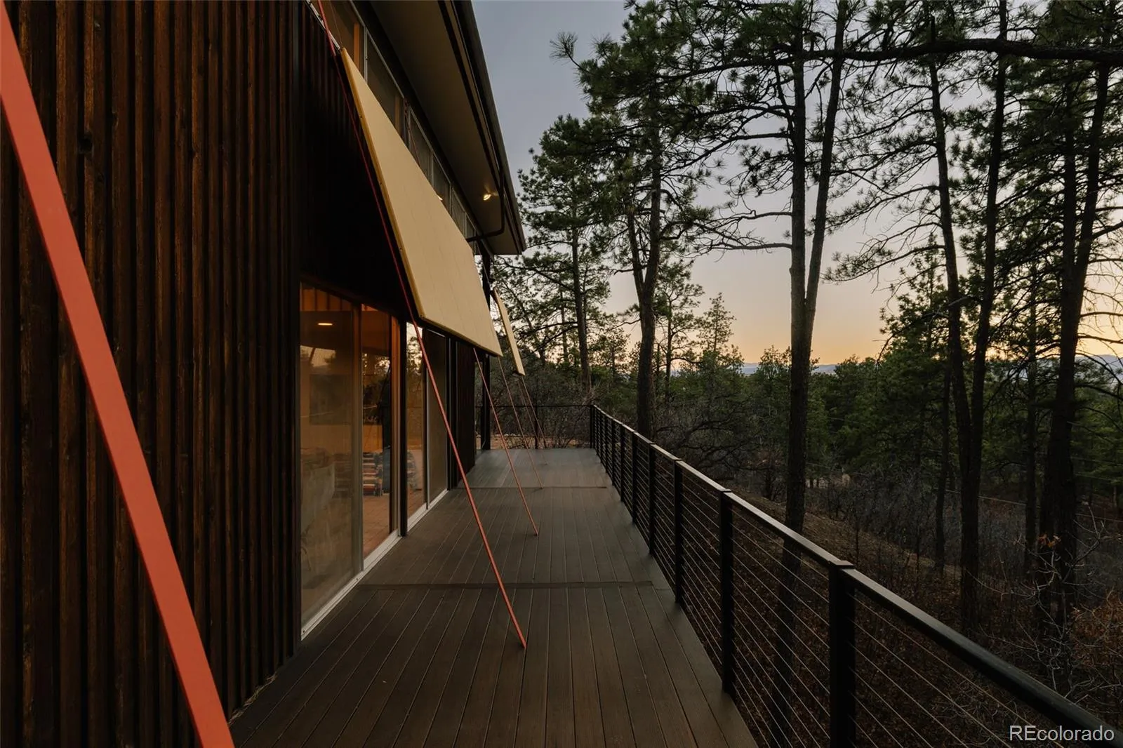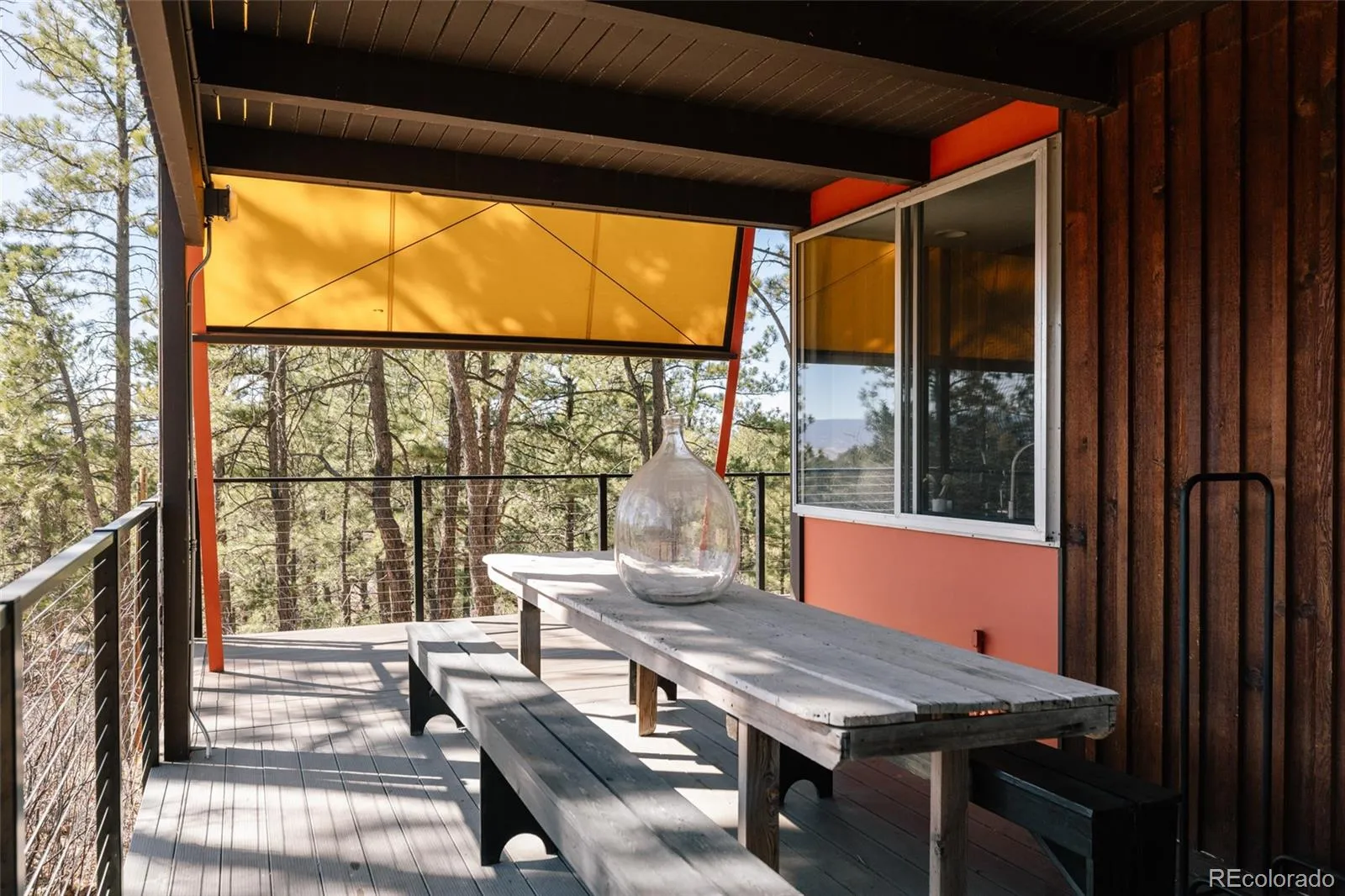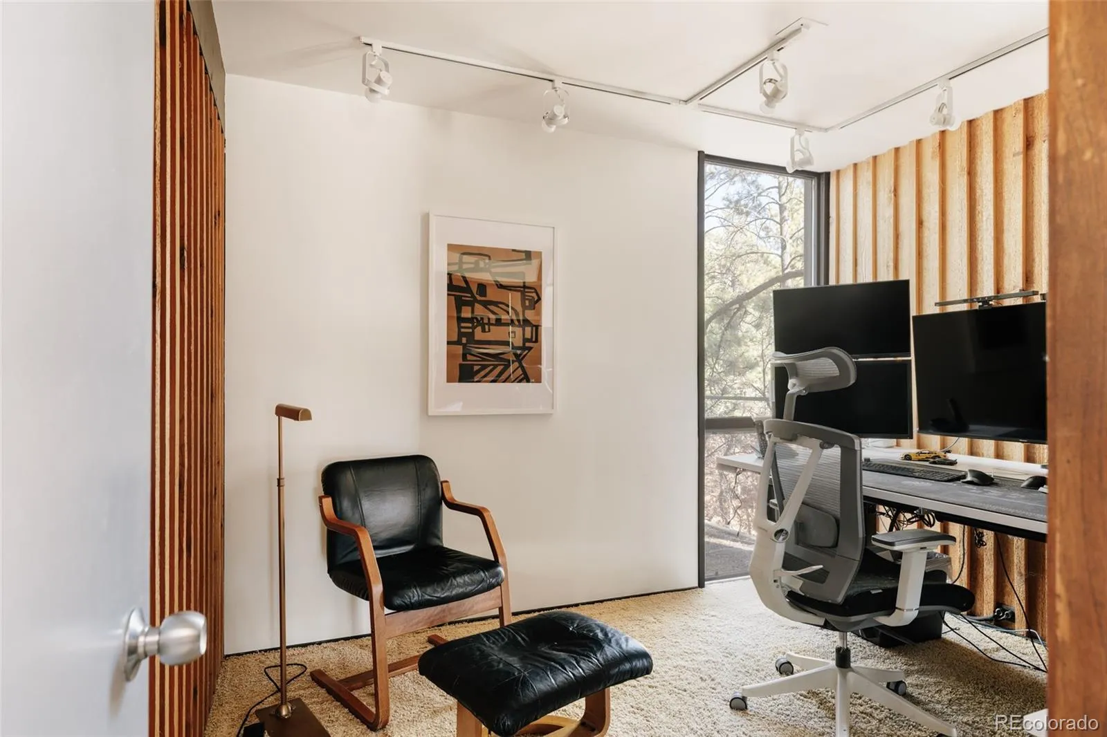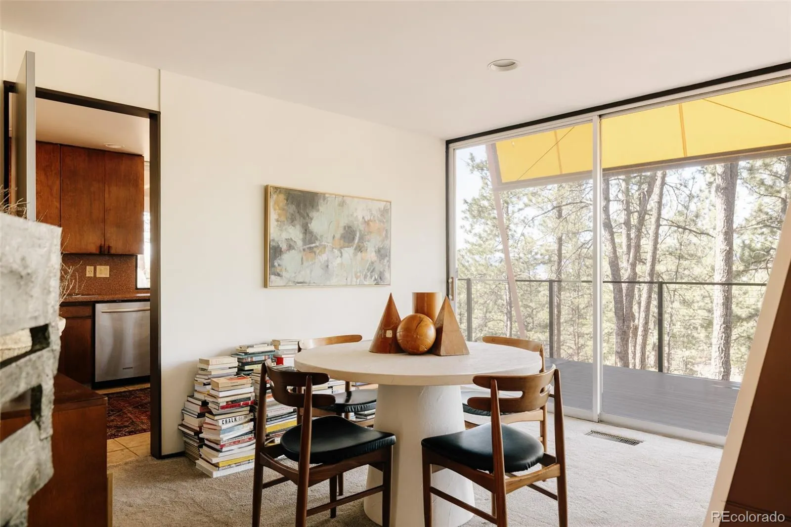As you approach, colorful built-in awnings interact with the home’s floor-to-ceiling glass. Stained board-and-batten cedar siding wraps the exterior and continues inside, creating visual continuity. A walnut-paneled spiral staircase serves as a sculptural focal point, adding both architectural drama and a playful design element. The main living space is anchored by a central fireplace and surrounded by floor-to-ceiling glazing and sliding glass doors that integrate the indoors with the landscape. The original kitchen is beautifully crafted, complete with distinctive leather pulls. A spacious dining area or flexible den offers additional built-ins and warmth from the combination of cedar, walnut, and glass. The primary suite features a loft area with doors that can be opened or closed to define the private space as desired. It features two closet areas and access to a private upper deck with panoramic mountain views. The spiral staircase continues into the upstairs bathroom, creating a striking architectural detail. The walk-out basement includes a large flexible living space and half bath. A separate artist studio with radiant heat provides an ideal space for creative work, a workshop, or additional flex use. Opportunities to own a home with this level of architectural significance, privacy, and land are exceptionally rare.