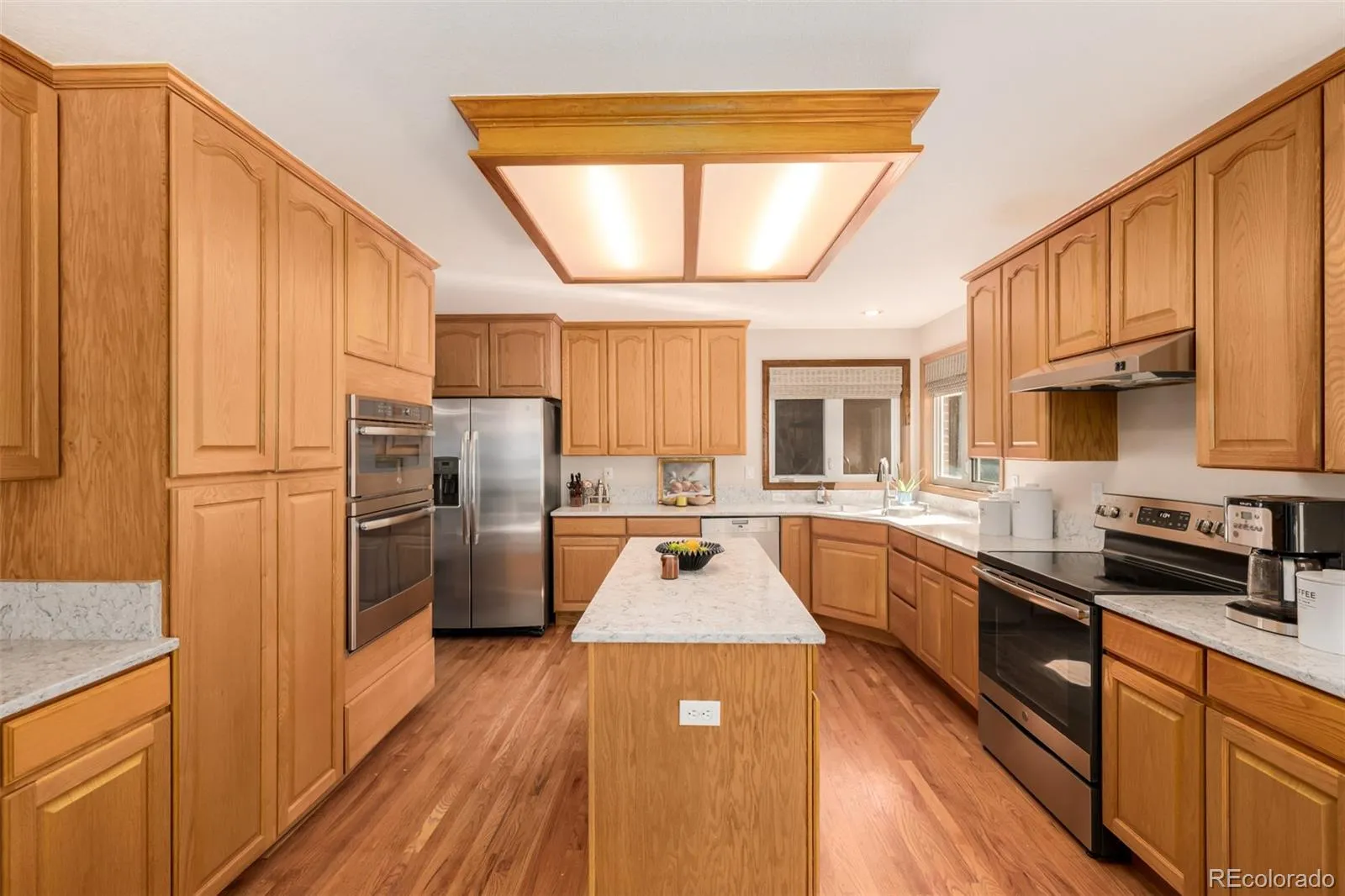 The eat-in kitchen is well-appointed with granite countertops, abundant wood cabinetry, stainless steel appliances, and a center island that naturally becomes the gathering place of the home.