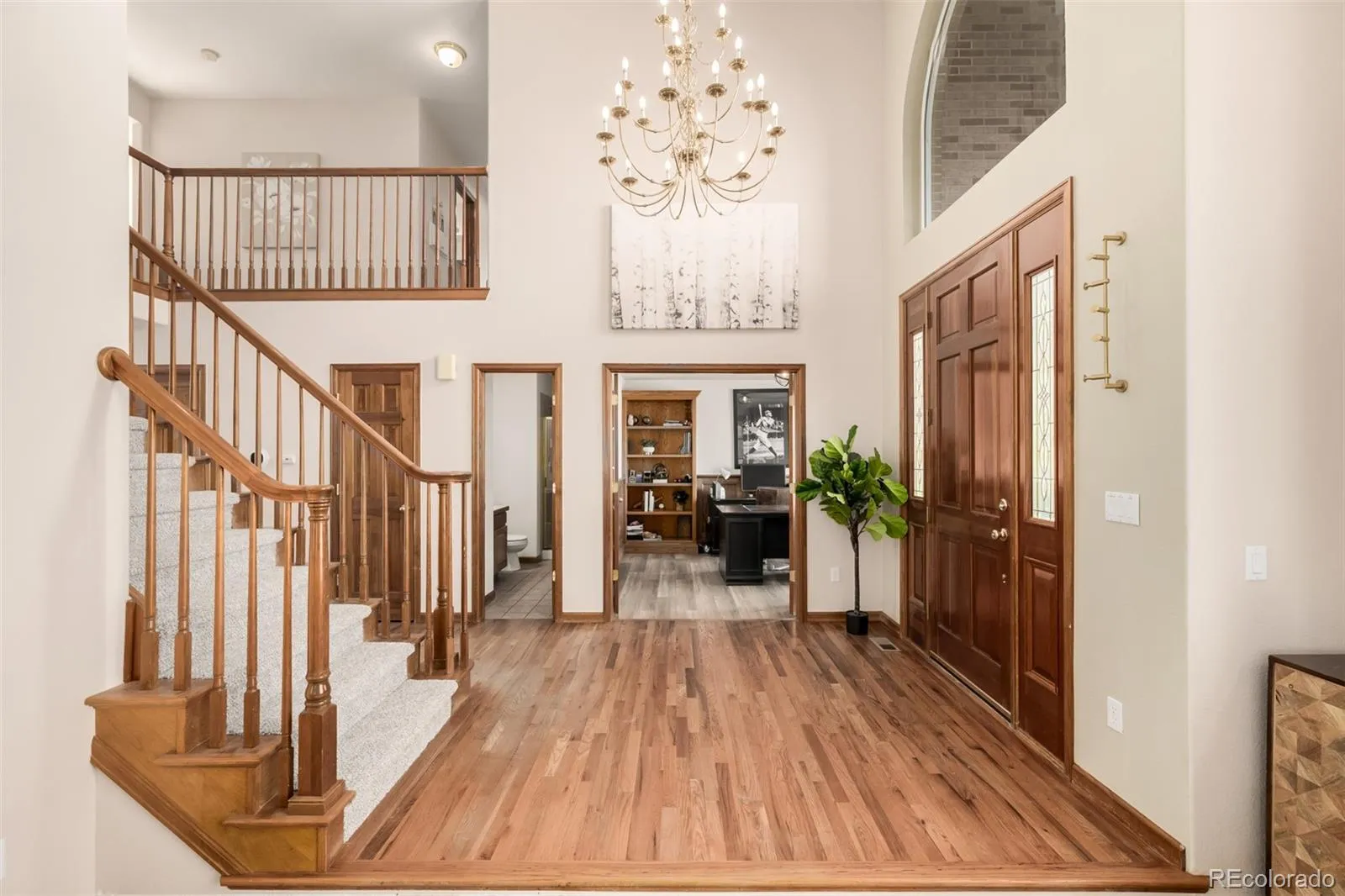 Inside, soaring vaulted ceilings and warm wood flooring welcome you into a bright, open layout designed for both everyday living and entertaining. A private den with French doors, built-in bookcases, and a sunlit bay window offers the perfect home office or library. The main level also features a sunken living room, formal dining room, and a spacious family room anchored by a brick-accented fireplace.