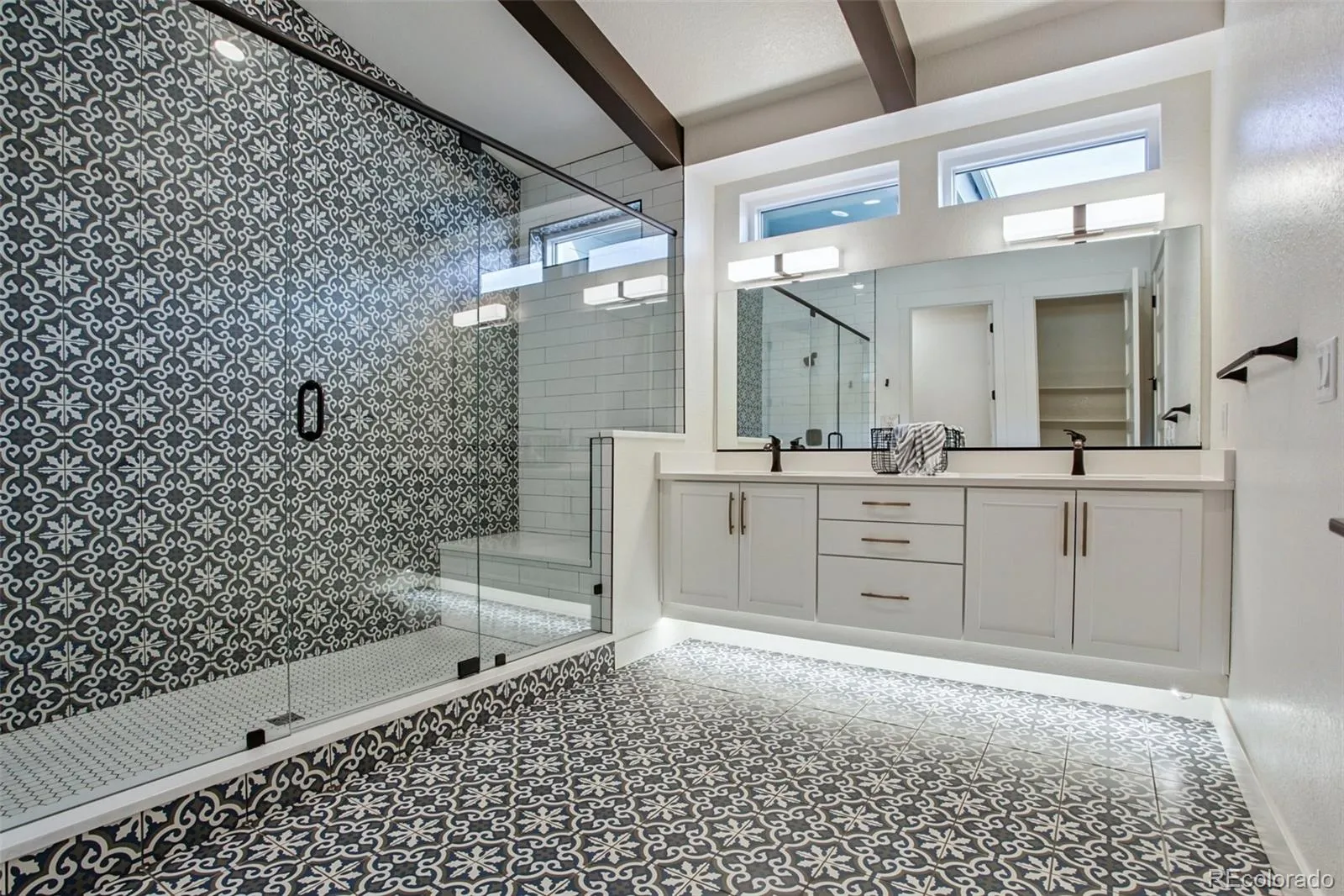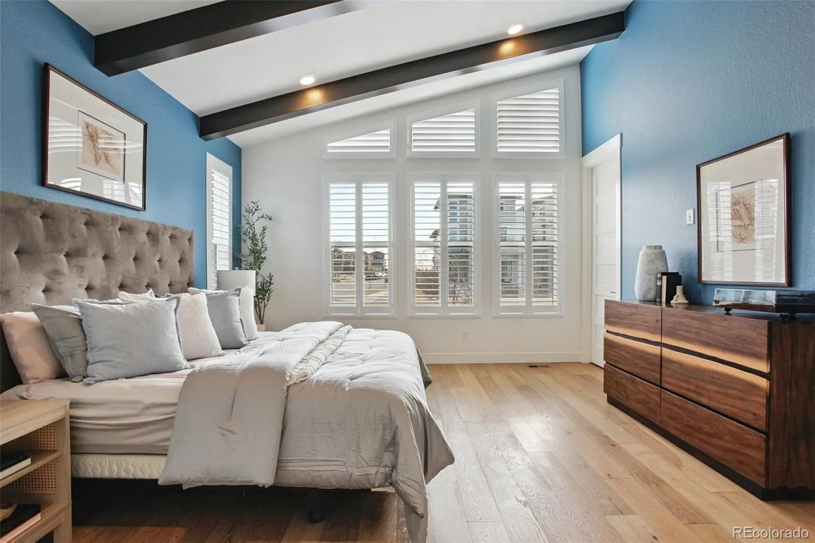 Welcome to this fully upgraded ranch-style home in the North Side neighborhood of Central Park — the community’s newest and final neighborhood. This mid-century modern inspired home from the KB Home Starlight Collection features a beautiful open floor plan with exposed beams, high ceilings, and fresh interior paint on the main floor. The modern chef’s kitchen offers quartz counters, modern lighting, abundant cabinet and counter space, and a large center island. Stainless steel appliances include a gas range, double oven, and wine fridge. The kitchen flows seamlessly into the dining and living areas, highlighted by a double-sided gas fireplace that also warms the covered back patio. The spacious main-floor primary suite features a walk-in closet and a stunning en-suite bathroom with dual sinks and an oversized glass shower. Two additional bedrooms share a stylish 3/4 bathroom with dual sinks and a glass shower. A convenient powder room and main-floor laundry with cabinets and counter space complete the main level. The finished basement offers a large family room with brand-new carpet and an impressive wet bar with wine fridge—perfect for entertaining. A fourth bedroom with walk-in closet and a full bathroom provides a great guest retreat. Egress windows bring in natural light, while partially unfinished space offers room for storage or future customization. Enjoy the backyard with a covered patio, gas fireplace, new hot tub (2025), and a fenced turf area for low-maintenance living. The home also includes an attached 3-car garage. Located just steps from a community playground + splash pad, this home is also near the beautiful open space of the Rocky Mountain Arsenal National Wildlife Refuge, offering trails, fishing, and wildlife viewing. Shopping, dining, and entertainment are minutes away at The Shops at Northfield, and sporting events are close by at Dick’s Sporting Goods Park. Don’t miss this exceptional home and all it has to offer!