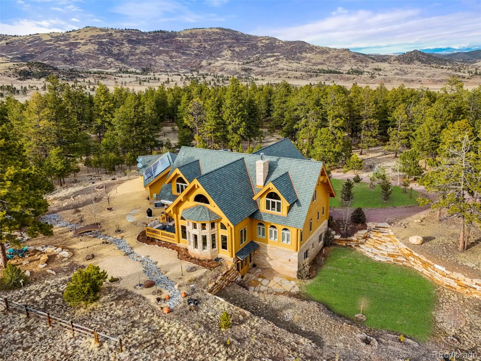 Immerse yourself in the beauty & tranquility of this extraordinary mountain home, tucked away in a gated community only 45 min outside Canon City. Blending sophistication & nature, this stunning sanctuary will leave you in awe! From the moment you enter, the soaring ceilings & striking accent beams create an atmosphere of rustic elegance. This masterpiece is constructed from premium custom-engineered Honka logs, blending timeless charm with modern functionality. In the heart of the home, the adjoined kitchen, dining & living areas are perfect for gathering. The exquisite travertine flooring, enhanced by rich cherry wood inlays enhances the warmth & refinement of the space, while expansive custom windows frame breathtaking panoramic views from every room & seamlessly blending the indoors with your surroundings. The main floor primary bedroom shares a double-sided fireplace with the formal dining & offers a beautifully appointed soaking tub in the connected bath. The refined wrought iron staircase showcases superior architecture and on the upper level you will find a dedicated library (or office) along with vaulted ceiling bedrooms & cozy window nooks. The amenities continue into the walk out basement where you will find endless space for entertaining/hobbies & guest privacy. The 3 car garage & additional parking is perfect for an RV or other storage. No detail has been overlooked extending to the exterior where endless charming landscaping awaits. For those craving adventure, this property grants direct access to pristine BLM land. Explore opportunities for adventure, hiking & the abundant wildlife from majestic elk & deer to other inhabitants right from your backyard! Designed for both year round comfort & self-sufficiency, this home comes equipped with a fully automatic generator, offering seamless convenience & security. With the perfect fusion of refined craftsmanship & back country, this exceptional estate is more than just a home – it’s a lifestyle.