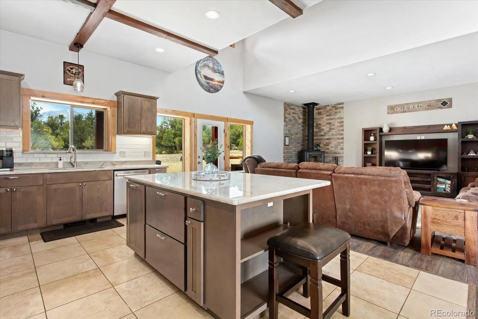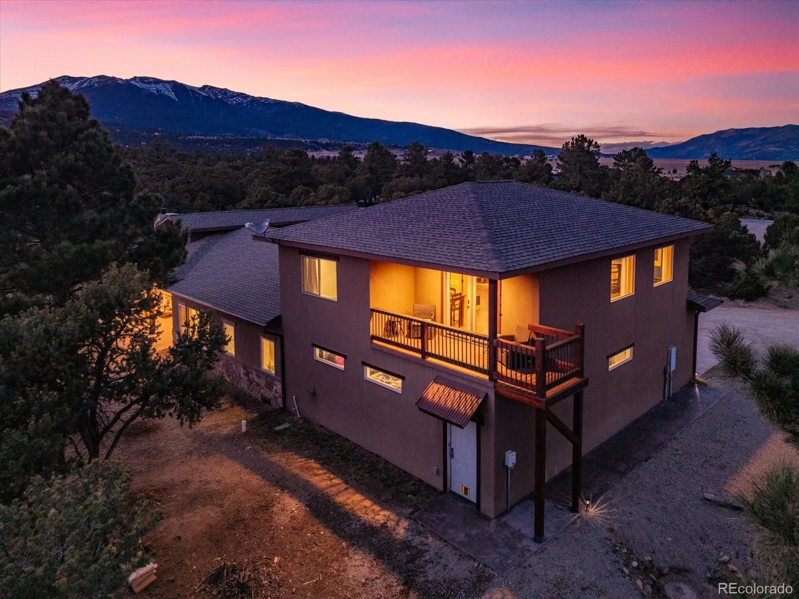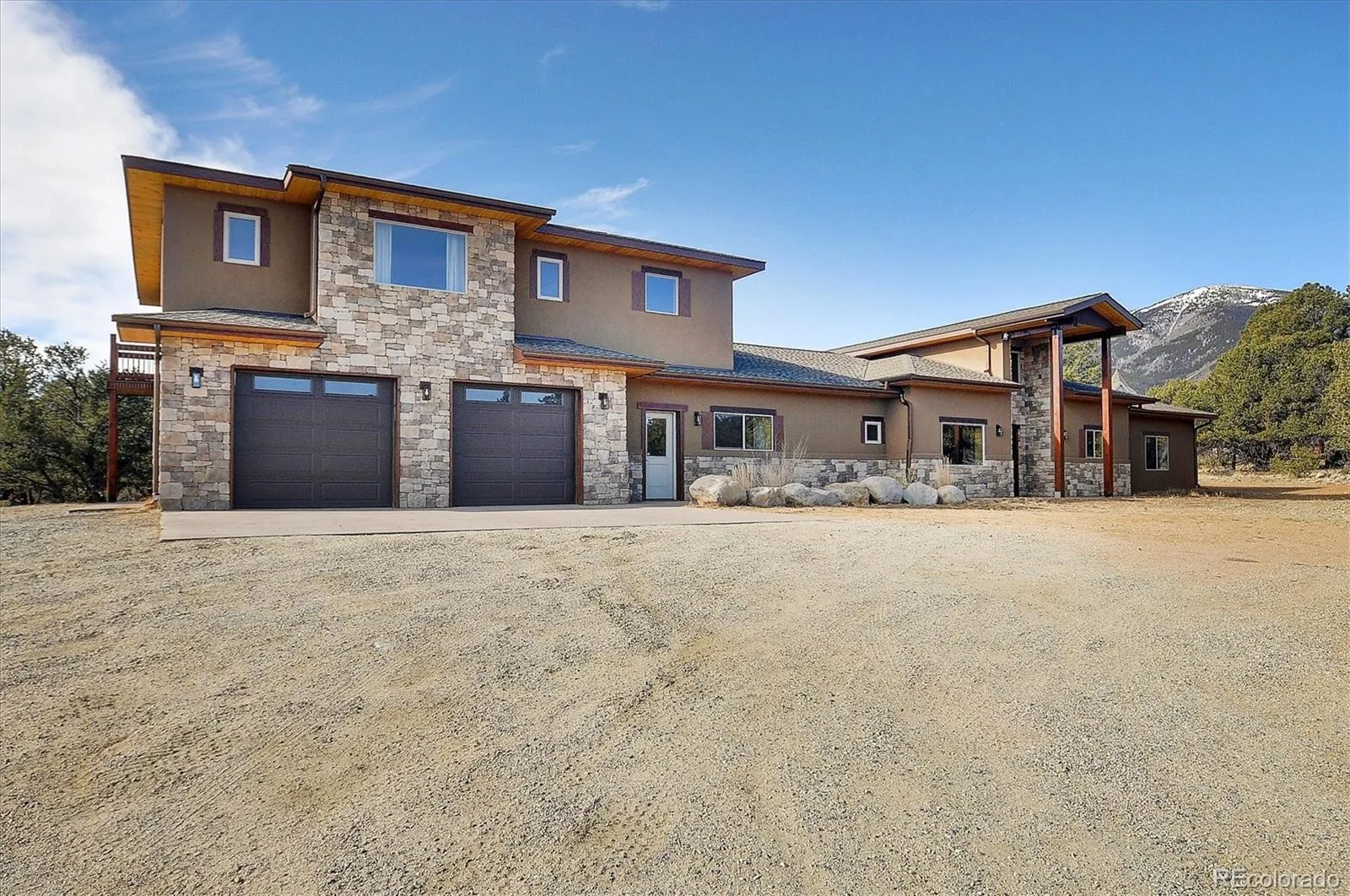 Wake up to this view—Mt Princeton bathed in morning light, the crisp mountain air drifting through your windows. On your private 4.78-acre lot, this 3-bedroom, 3-bath retreat offers 3,606 square feet of inspired mountain living, where every detail—from exposed beams and travertine tile to rich wood doors and stone accents—invites you to slow down, breathe, and savor the extraordinary. The main floor centers on a living room with a stone hearth and freestanding wood stove, a place to gather after a day of adventure or simply watch the mountains change with the light. Doors open to a patio, seamlessly connecting indoor comfort with the outdoors. The kitchen is both beautiful and functional, featuring warm wood cabinetry, quartz countertops, granite window sills, a large pantry, and high-end appliances that make cooking a joy every day and on special occasions. The primary suite is a sanctuary, with huge windows framing the peaks, a spa-like bath with a custom-tiled walk-in shower, double vanity, soaking tub, and a spacious walk-in closet. Two additional bedrooms, a full bath, a half bath, and a spacious laundry complete the main floor of the home. Upstairs, the family room flows onto a deck with panoramic views, perfect for morning coffee, quiet reflection, or working with inspiration from the upstairs office. An oversized attached garage is ideal for storage and vehicle maintenance with an additional door to the outside and a nearby storage shed. Outside, a seasonal stream winds through the large lot, a low-maintenance stucco and stone exterior leaves plenty of time to enjoy the backcountry, and the solar system is the finishing touch for easy mountain living. Tucked off a quiet paved dirt road, the property offers privacy, serenity, and direct access to backcountry trails and endless mountain adventures. Here, each day begins with breathtaking views and ends beneath a sky ablaze with stars—a home designed for living fully, outdoors and in.