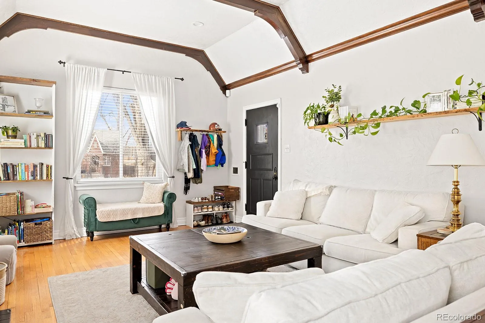 – A living room that stops you in your tracks. Vaulted ceilings with beautiful exposed wood beams, hardwood floors, and a cozy wood-burning fireplace make this space feel warm, and perfect for gathering.