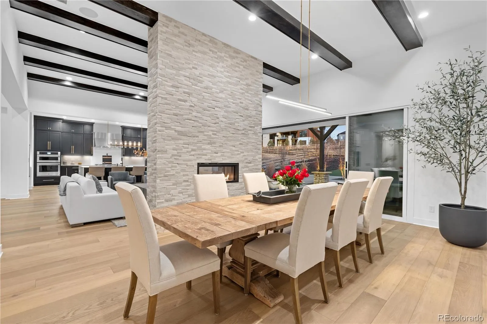 Inside, the meticulously maintained ranch-style residence offers an open, light-filled floor plan accented by extensive 8 ft plank luxury hardwood flooring and custom designer lighting throughout. The great room is anchored by a dramatic 24-foot multi-panel sliding glass door, creating a seamless indoor–outdoor Colorado experience. Vaulted ceilings with exposed beams, a formal dining area, and a striking double-sided floor-to-ceiling stacked stone fireplace add warmth and architectural presence.