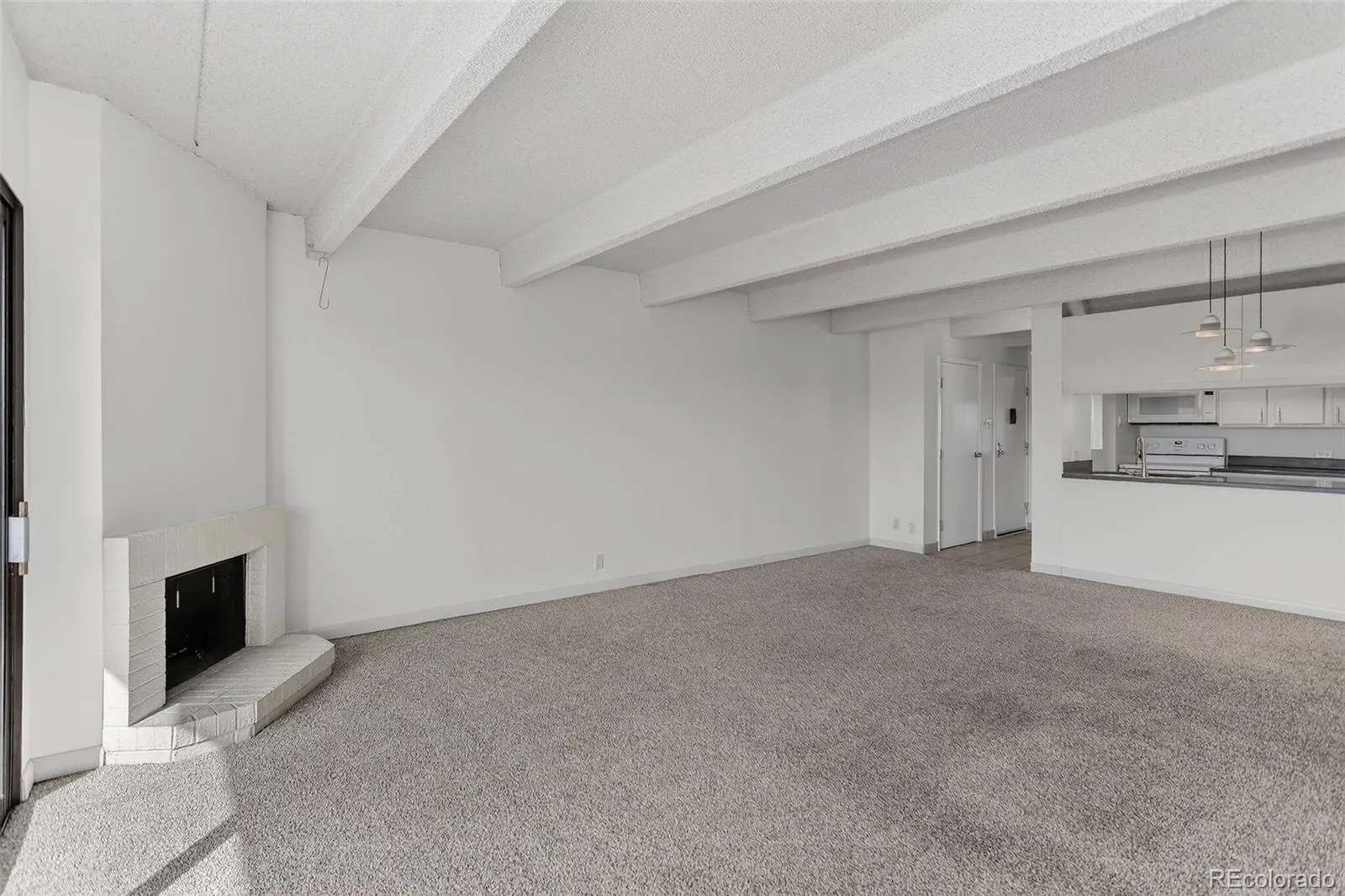 Inside, this well-sized home offers over 1,000 square feet of comfortable living space with a functional layout designed for everyday living and entertaining. One of the home’s standout features is the impressive view, offering sweeping vistas from the Denver skyline to the Rocky Mountains, including views reaching south toward Pikes Peak on clear days. The living room features a cozy wood-burning fireplace and flows into the dining area, creating a welcoming space for relaxing or gathering with guests. The kitchen offers essential appliances and practical workspace, while the primary bedroom includes its own en-suite bathroom. The second bedroom provides flexibility for guests, a home office, or additional living space. A dedicated storage room and reserved garage parking space add everyday convenience.