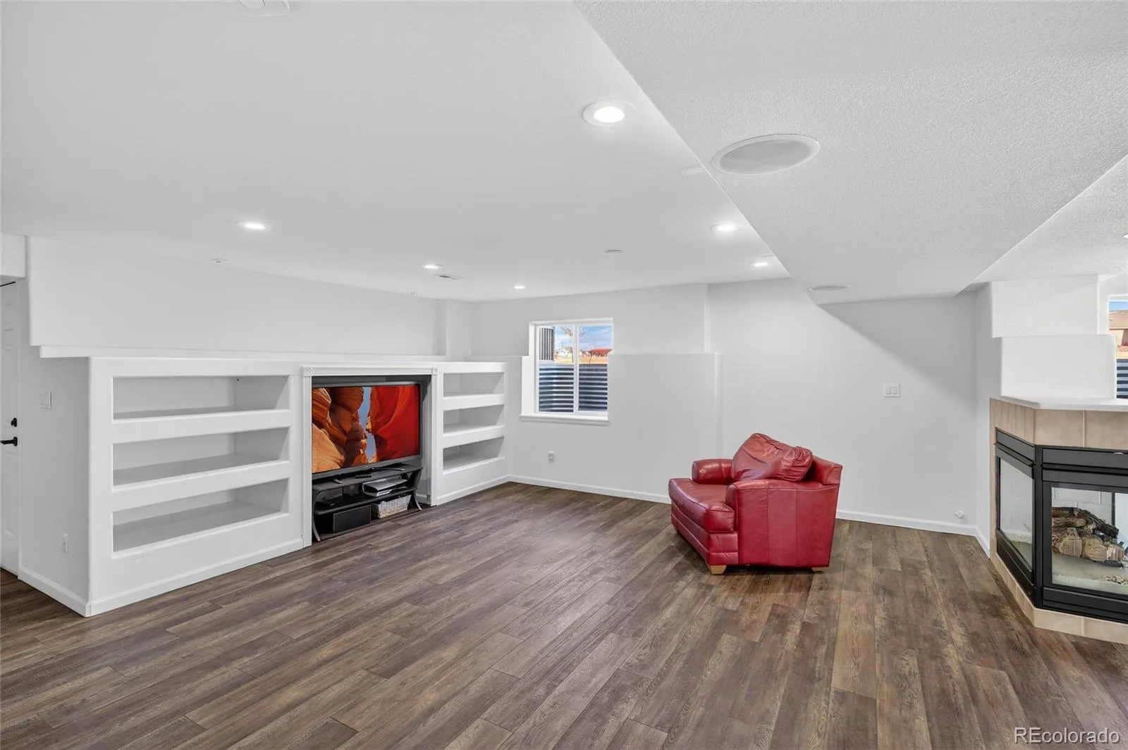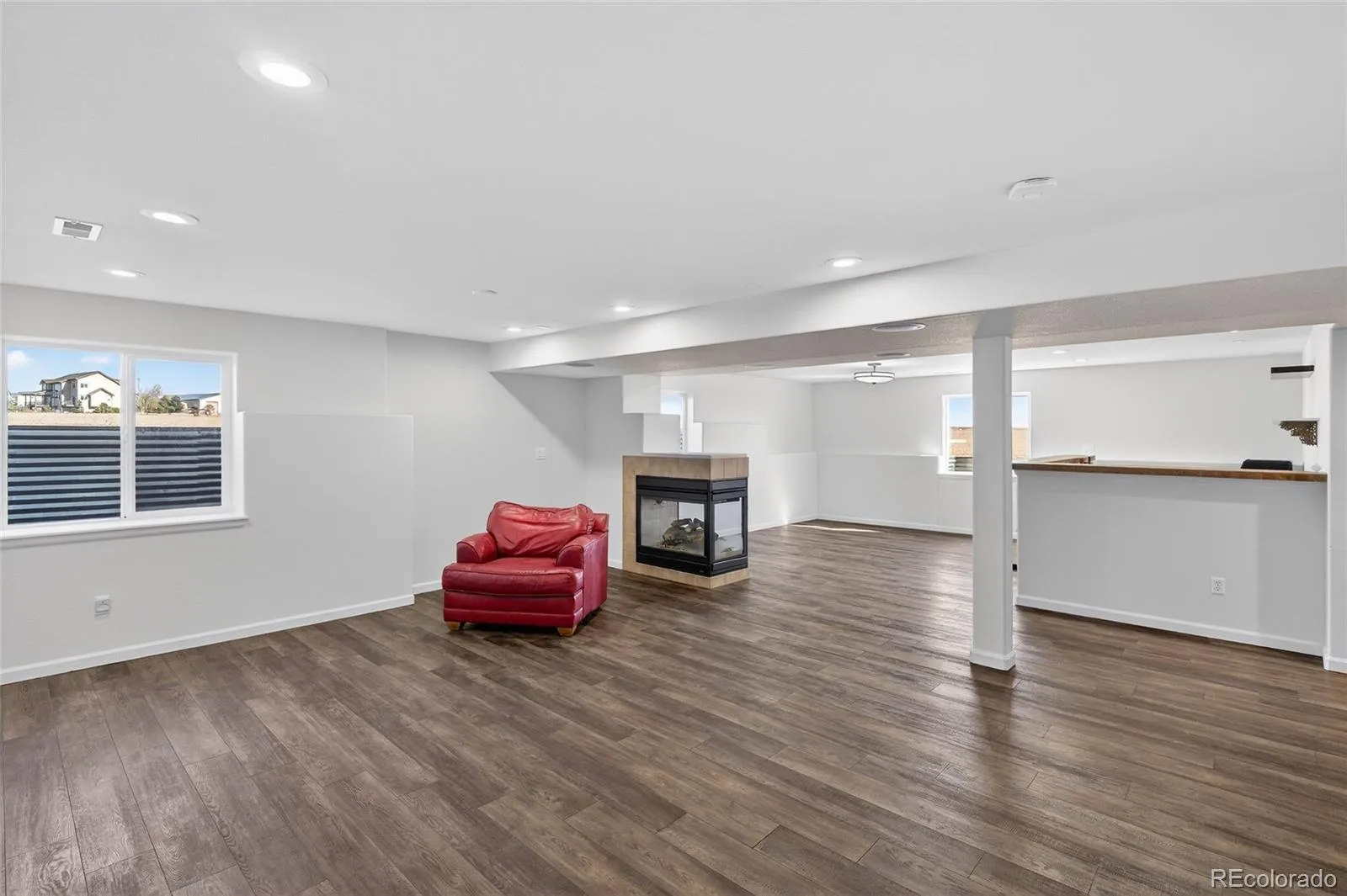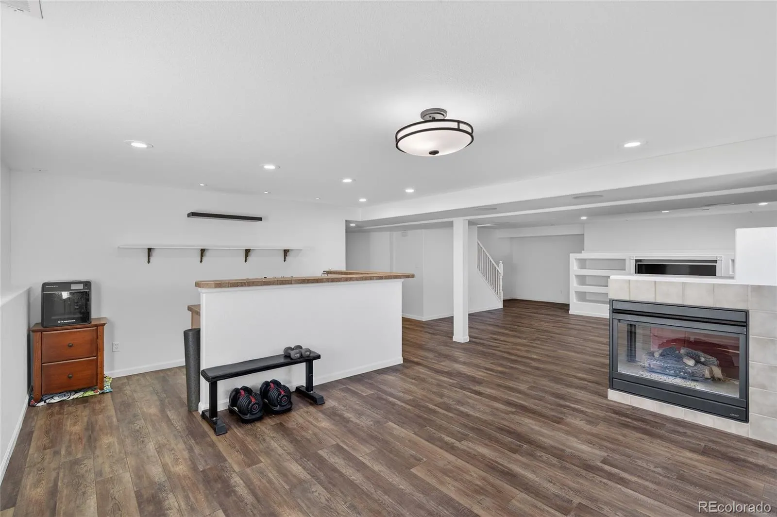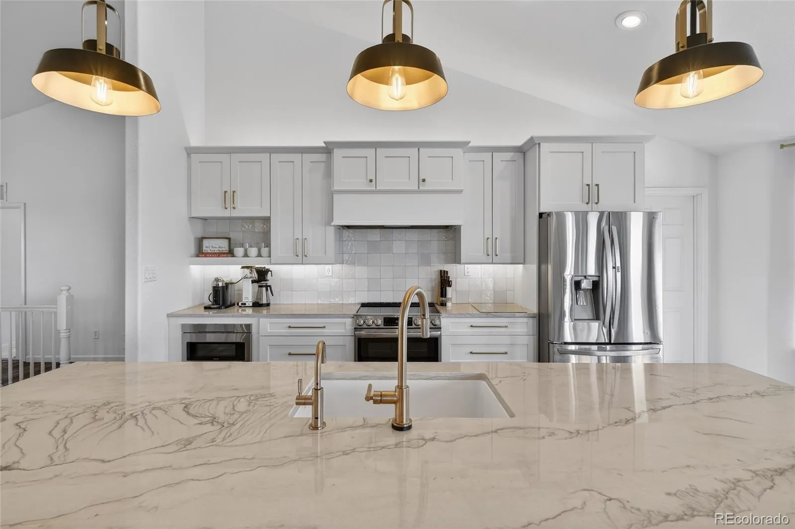 The main level was opened up with a complete 2022 kitchen remodel featuring quartzite counters, a large island with seating, white shaker cabinetry, tile backsplash, designer pendant lighting, warm gold-toned hardware/fixtures, plus a microwave drawer, electric range with hood vent, and stainless appliances (2022). Two gas fireplaces, surround sound, and a wet bar add comfort and entertaining flexibility.