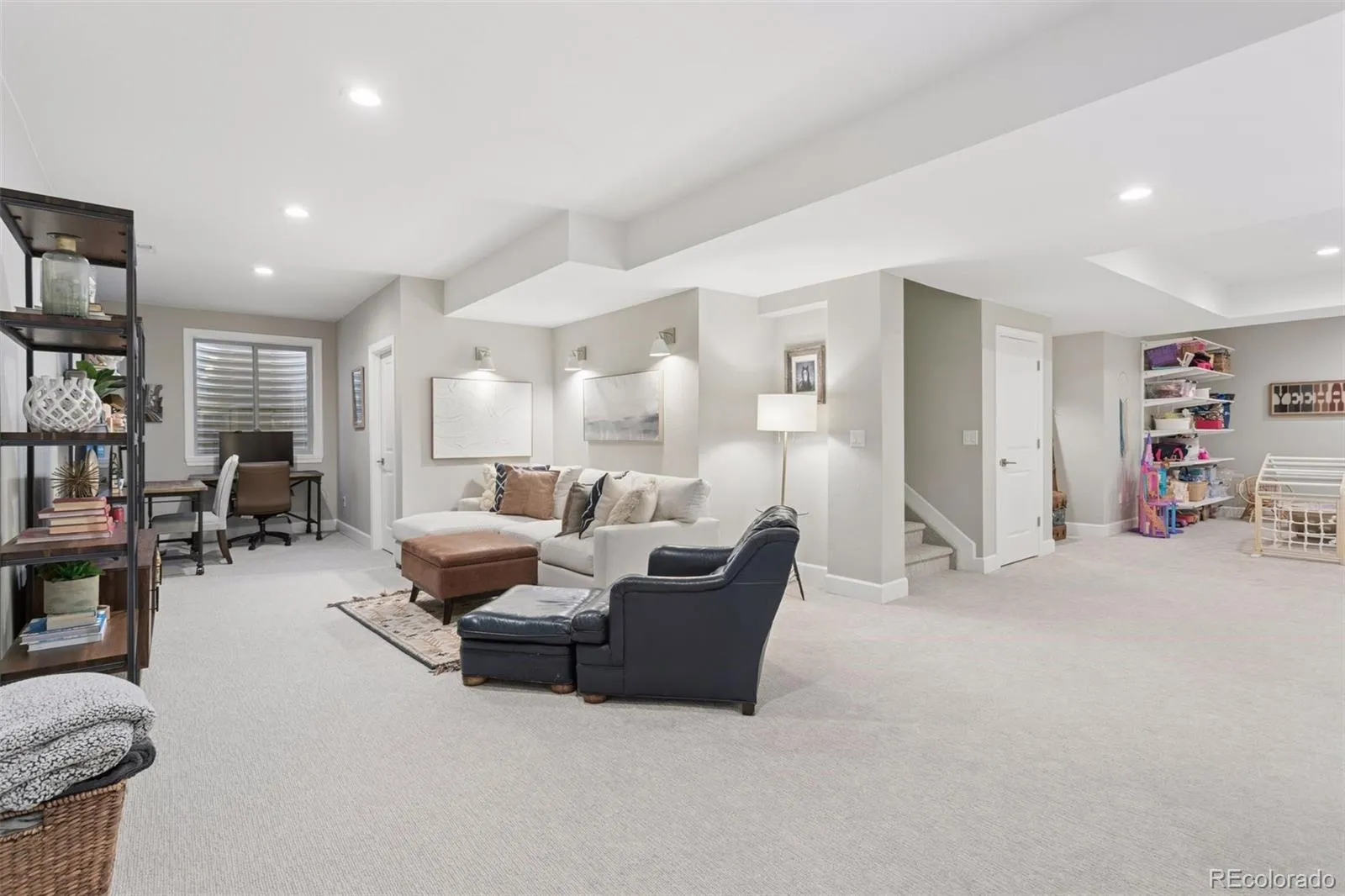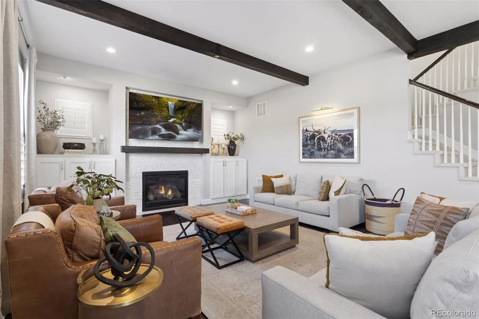 Welcome to 5919 South Olive Circle, an impeccably maintained home in the desirable Marvella community that seamlessly blends modern design with sophisticated warmth. This open-concept home is defined by stunning walnut floors, beautiful light fixtures, and plantation shutters throughout, while custom wood beams on the ceiling add rich architectural texture to the spacious living room with its gorgeous gas fireplace. The gourmet kitchen has been thoughtfully updated, boasting elegant white quartz counters, a classic subway tile backsplash, and a massive center island, walk-in pantry and dining area. Just off the foyer, find a quiet, light-filled home office and an elegant dedicated dining room, plus a main-floor half bath. Coming in from the oversized 3-car tandem garage, a functional mudroom keeps the home organized. The upper level reveals a truly luxurious primary sanctuary, with a recently remodeled ensuite bathroom with vibrant green tile, a deep soaking tub, and a massive walk-in glass shower with dual heads. This retreat is completed by an enormous walk-in closet with a direct connection to the upper-level laundry room for ultimate convenience. This level also features three additional bedrooms, a full bath, and a light-filled loft. The expansive finished basement offers incredible versatility with a wet bar, space for a second office, play area, and storage, plus a flexible fifth bedroom that doubles as a workout room. While the home features a private, fully fenced backyard and patio, the true outdoor living extends far beyond the fence line. Residents enjoy a lifestyle defined by community and activity; with 2 neighborhood parks within a 3-minute walk and an athletic club just across the street, the world is your backyard. Enjoy walking distance to the community pool, clubhouse, and fire pit. Marvella offers a vibrant, low-maintenance lifestyle in the heart of the Cherry Creek School District with quick access to I-25 and light rail.