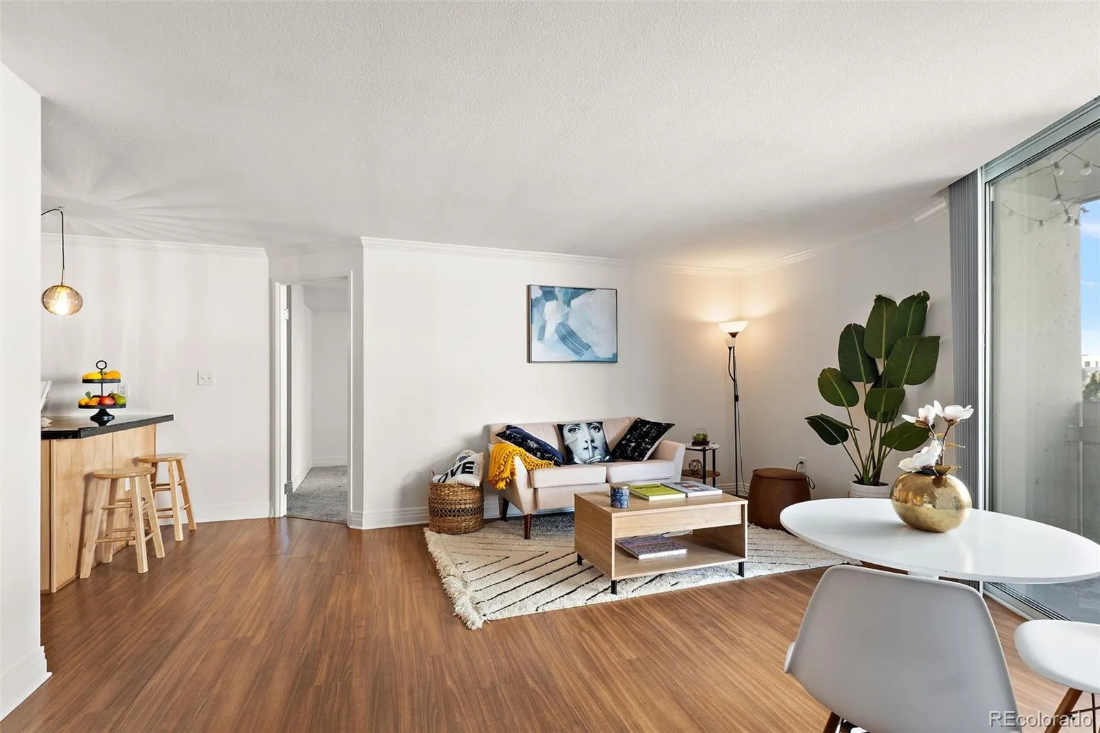 The 873-square-foot layout is thoughtfully arranged to maximize natural light and functionality. Fresh interior paint, updated lighting, and laminate flooring create a clean, contemporary atmosphere throughout the living spaces.