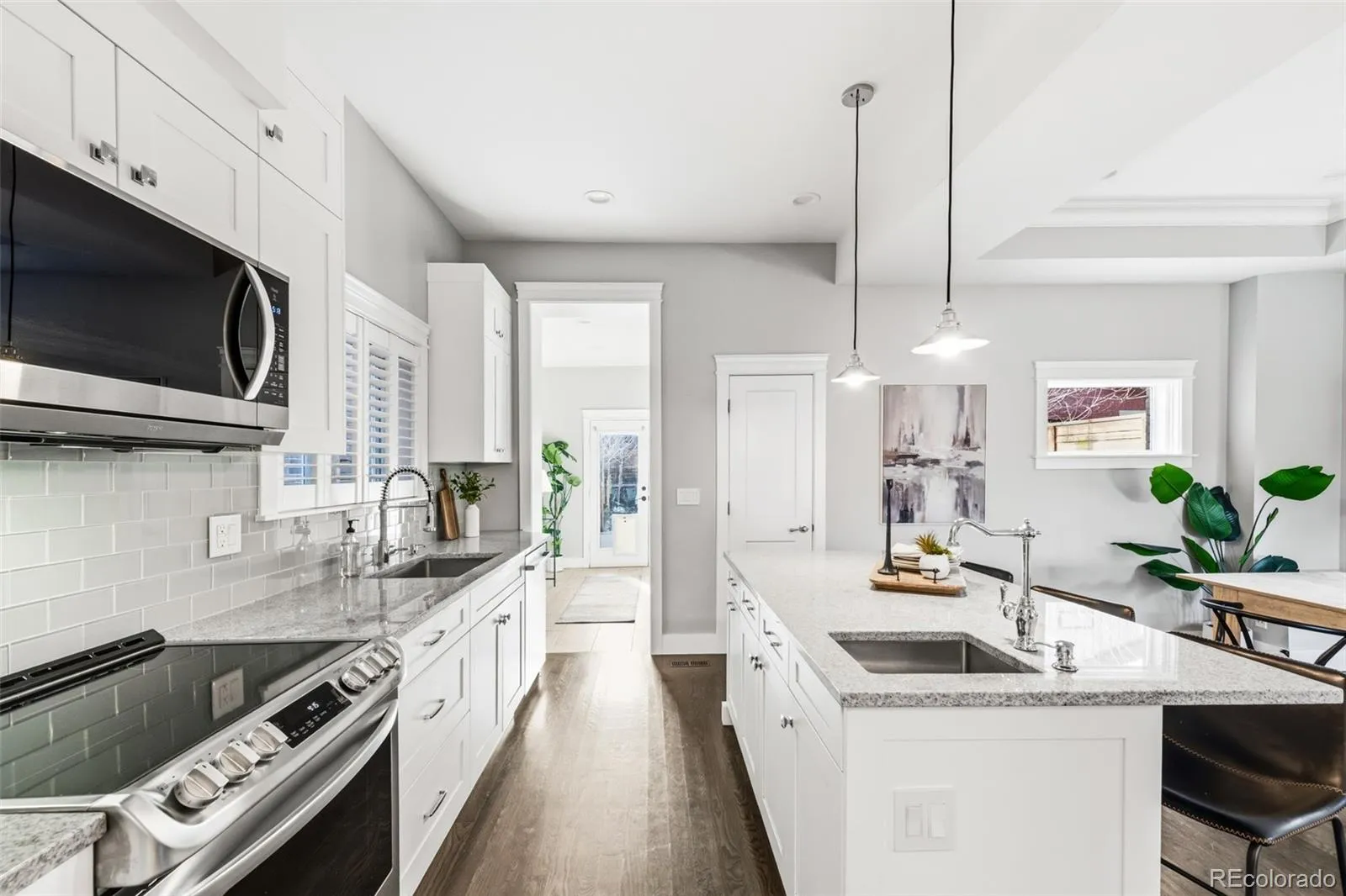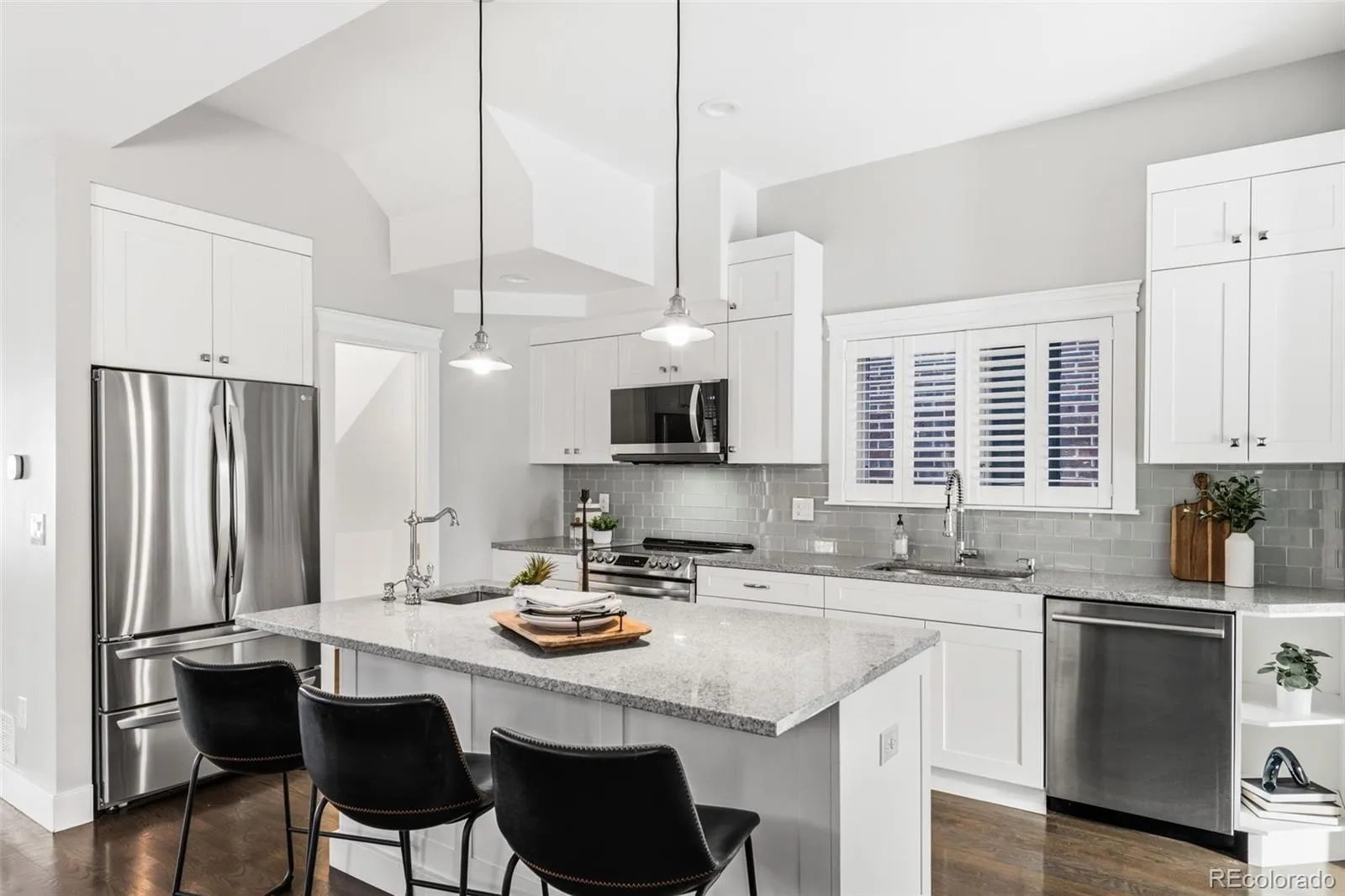 Exceptional price you’ve been waiting for! Timeless character and refined modern living harmonize in this beautifully remodeled Potter Highlands residence. Set on a coveted block, a generous covered front porch welcomes residents to interiors where historic charm blends seamlessly with sophisticated updates. Original architectural details — including large windows with classic molding, rich wood floors and airy 9 foot ceilings— frame elegant living spaces anchored by a contemporary gas fireplace. The thoughtfully designed kitchen is striking and urbane, featuring all-white cabinetry, quartz counters, a center island, dual sinks and a spacious walk-in pantry. The main floor adjoining bath, laundry room and mudroom keep everyday clutter both organized and accessible. Upstairs, two light-filled primary en-suite bedrooms present private retreats with classic finishes and ample closet space. Muted colors, oak wood floors, and intentional tile bathrooms complement the original spirit of this 1895 Victorian. Outdoors, a fully landscaped backyard with a patio and raised garden beds creates a serene city oasis, and the detached garage with EV charger and adjacent off-street parking space offers everyday convenience. The best of Highlands shopping and dining experiences await you, with every neighbor’s favorite organic grocer, Locavore, just 4 blocks away, while on 32nd Avenue you’ll delight in such finds as Wooden Spoon, Duo, Patzcuaros, Kumoya, Tony P’s and so much more. This move-in-ready home offers the perfect balance of historic charm and urban living.