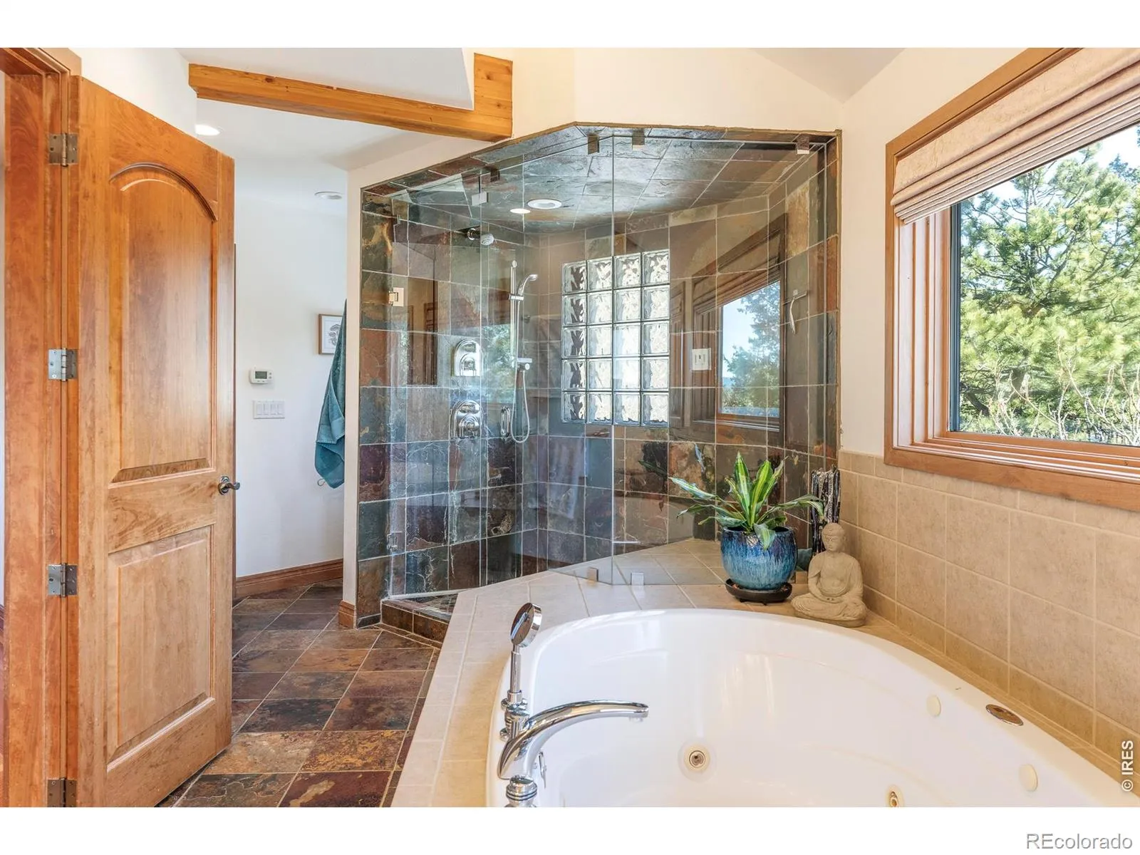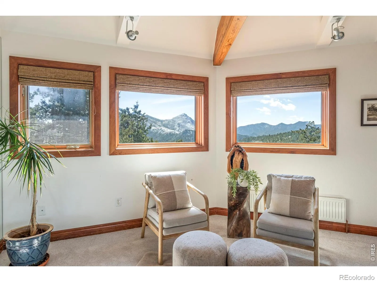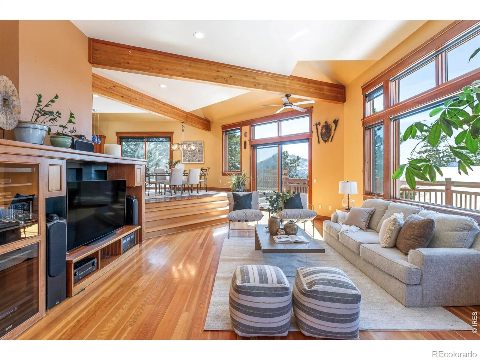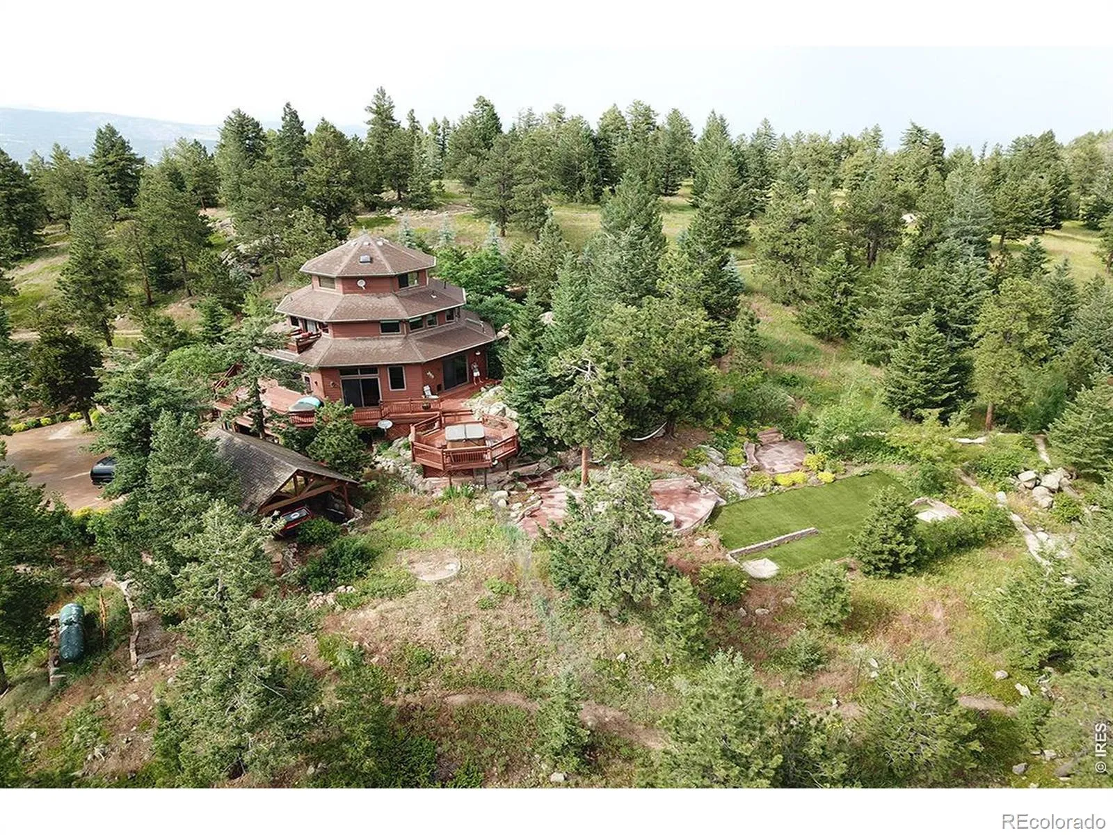 There are homes with views. Then there is 5097 Flagstaff Road.Perched above Boulder at the end of a private dead-end drive, this one-of-a-kind octagon-shaped residence sits on 10.25 forested acres just minutes from downtown Boulder yet completely removed from it. No neighbors in sight. No noise but wind and birds. And a horizon that stops people in their tracks: Longs Peak and the Indian Peaks Wilderness to the west, Boulder’s city lights glittering far below to the east. The Flagstaff Trail begins steps from the back door.Four levels rise through the home, each one a new perspective. The main level great room commands attention with soaring vaulted ceilings, exposed timber beams, and walls of glass framing the ridge. A sunken conversation and dining area anchors the heart of the space. The chef’s kitchen is outfitted with a Viking range, Thermador refrigerator, slate tile backsplash, skylight, and custom cabinetry. The primary suite opens to a SW-facing Juliette deck and includes a soaking tub, walk-in shower, and cedar closet.At the crown of the home, the Birdsnest office is in a category of its own. Wraparound windows frame unobstructed snow-capped peaks in every direction, and the kind of focused quiet that remote work was meant to look like. Step down to the main level and a wraparound deck extends the living space into the trees.Outside, a detached 1,500 sq ft geothermal greenhouse makes year-round food production a reality regardless of season. A fully owned solar array powers the entire home, delivering true energy independence with none of the compromise. A gas fire pit, horseshoe pit, and 2 fenced acres make this a property that lives as well outside as in. 3-car garage plus covered carport.This is what it looks like when Boulder mountain living is done without limits.