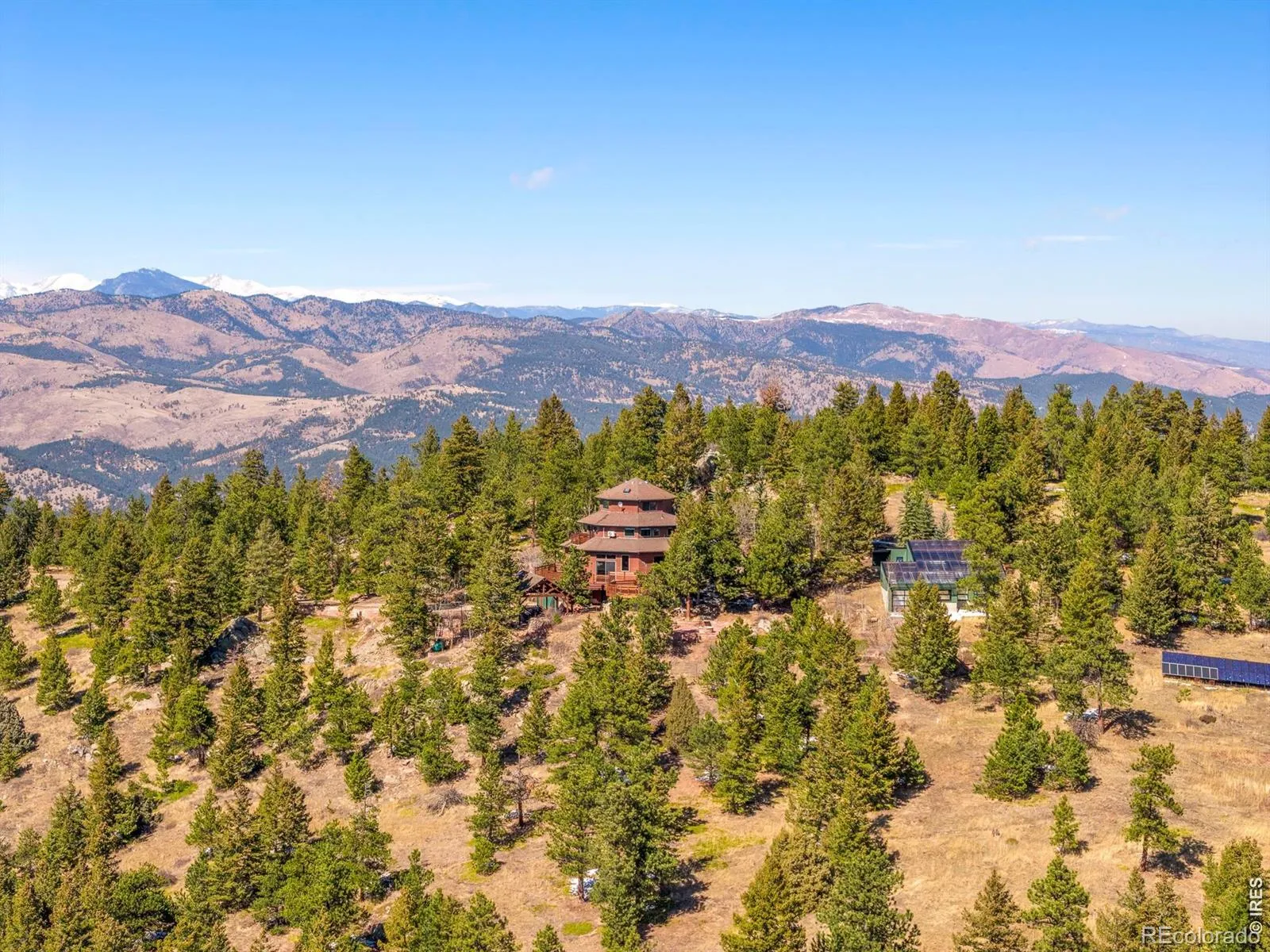 There are homes with views. Then there is 5097 Flagstaff Road. Perched above Boulder at the end of a private dead-end drive, this one-of-a-kind octagon-shaped residence on 10.25 acres delivers a living experience that simply does not exist anywhere else in Boulder County. Tucked into the forest with no neighbors in sight, the property offers true seclusion alongside jaw-dropping scenery, with Longs Peak and the Indian Peaks Wilderness filling the horizon to the west and Boulder’s city lights glittering to the east. The Flagstaff Trail is just steps from the back door.Four levels rise through the home, each one a new perspective. The main level great room commands attention with soaring vaulted ceilings, exposed timber beams, walls of glass, and a sunken conversation and dining area at the heart of the home. The chef’s kitchen features a Viking range, Thermador refrigerator, slate tile backsplash, skylight, custom cabinetry, and an island with sink. The primary suite offers a SW-facing Juliette deck, soaking tub, walk-in shower, and cedar closet.At the crown of the home, the ‘birds nest’ office delivers a work from home experience unlike anything else, with wraparound windows framing unobstructed snow-capped peaks and built-in seating perfect for inspired productivity or quiet reflection. Step down to the main level, where a wraparound deck extends the living space outdoors.Outside, a detached 1,500 square foot geothermal 4-season greenhouse makes year-round food production a reality. A fully owned solar array powers the entire home, making true off-grid living effortless. Gas fire pit, horseshoe pit, 2 fenced acres for dogs. 3-car garage plus covered carport. This is Boulder mountain living at its most extraordinary.