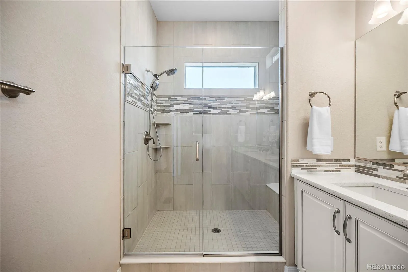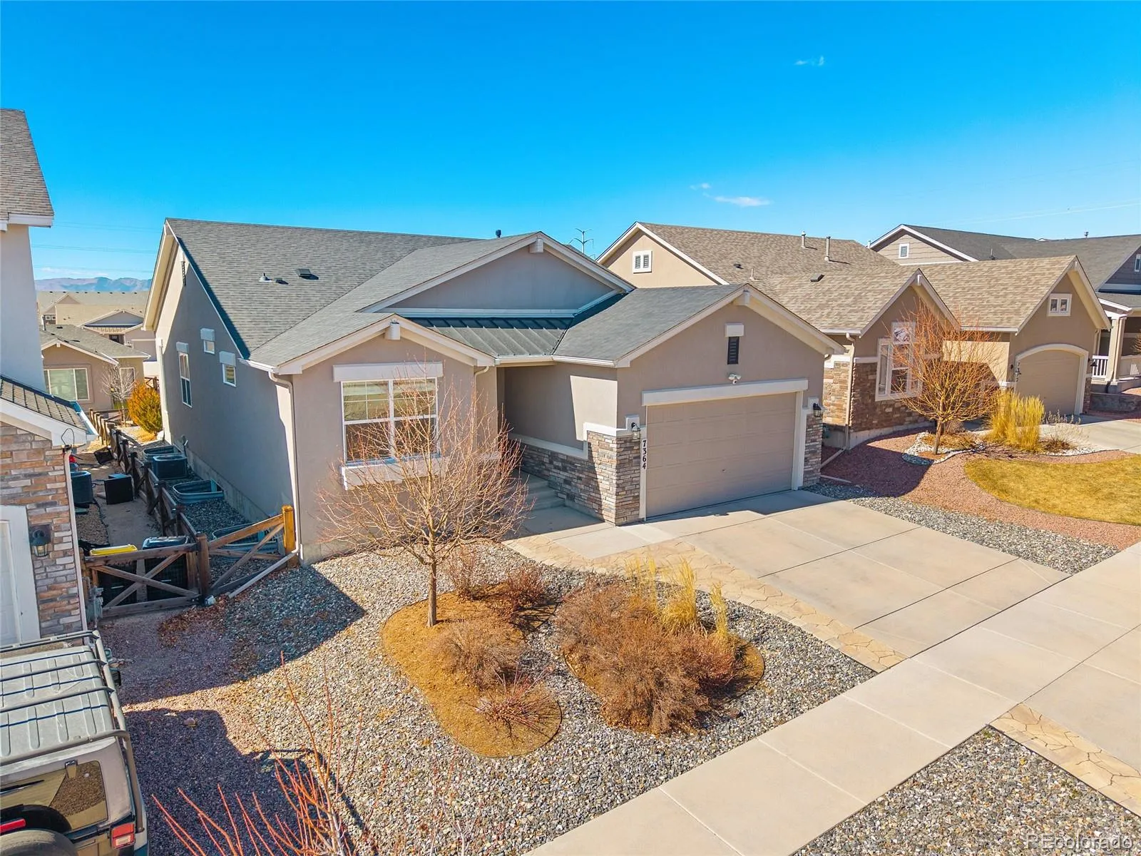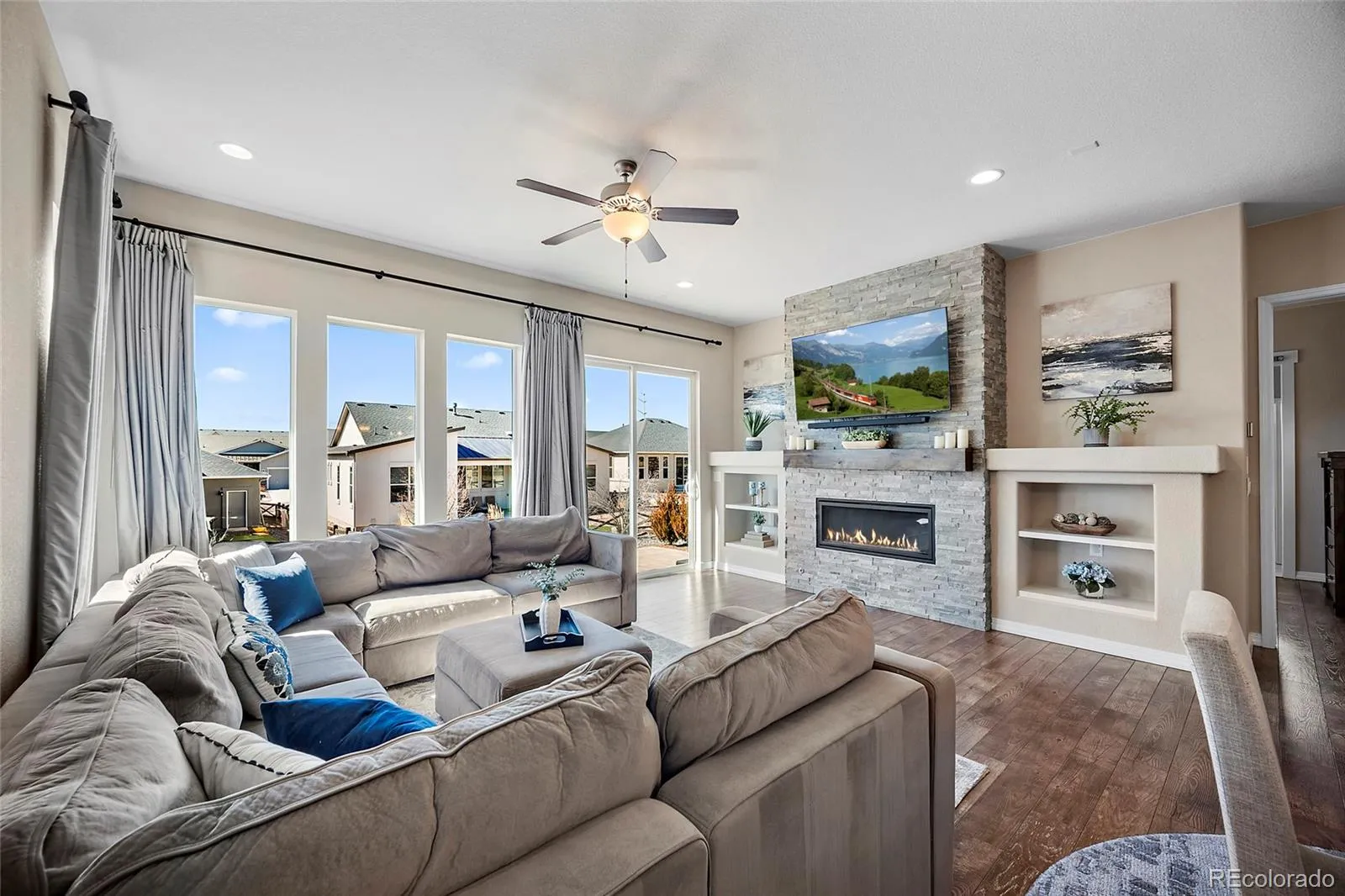 This stunning ranch-style home blends modern design, functionality, and sophistication with high-end finishes and thoughtful upgrades throughout. From the moment you step inside, you’ll notice the attention to detail, highlighted by 9-foot ceilings, a grand entry hallway, and engineered wood flooring throughout the main level. The gourmet kitchen is a true showpiece with 42-inch cabinetry, quartz countertops, large center island, custom tile backsplash, built-in oven, separate gas range with eye-catching hood, coffee station, pantry, and ample prep and storage space. It opens to the dining area and inviting living room, where a floor-to-ceiling gas fireplace with custom mantel and built-in shelving creates a striking focal point, perfect for cozying up on snowy Colorado winter days. Elongated windows flood the space with natural light, complemented by custom draperies and rods. The main-level primary suite offers a spacious walk-in closet with wood shelving and a luxurious spa-like en-suite bath with dual quartz vanities and custom-tiled shower. An additional bedroom and full guest bath are also located on the main level. The laundry room provides direct access to the fully insulated and drywalled garage with extra workspace, storage options, and a dedicated outlet ready for an EV charger. Downstairs, the expansive family room is ideal for movie nights, a kids’ hangout, game room, or ultimate man cave. Two additional bedrooms, including one with a walk-in closet, and a full bath with a relaxing jetted tub complete the lower level, along w/ unfinished storage for seasonal needs. Outside, the landscaping features a custom stone walkway and low-maintenance xeriscaping in front, plus a matching stone patio in the backyard with majestic mountain views. Exterior under-eave lighting adds style and ambiance, and the pre-plumbed gas line on the patio is ready for your BBQ. This home reflects exceptional pride of ownership and attention to detail—schedule your showing today!
