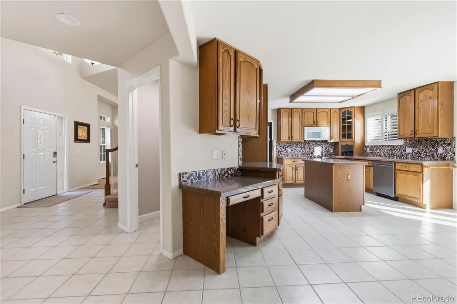 Fresh exterior paint and Tudor-style architecture make a strong first impression — brick accents, wood trim details, a three-car garage, and mature landscaping on a quiet Parker street. Inside, the home delivers 3,634 finished square feet and five bedrooms across three levels. The main level offers a formal living room with vaulted ceilings and gas fireplace, a kitchen with double wall oven, cooktop, center island, and Corian counters open to a breakfast nook and family room with a second gas fireplace, plus a bedroom that makes a great office, full bath, and laundry room. Upstairs, the primary suite has a vaulted ceiling, five-piece bath with soaking tub and separate shower, and a walk-in closet with plenty of room for two. Two secondary bedrooms have their own walk-in closets, and the hall bath has double sinks and a skylight. Then there’s the basement — beautifully finished with a stunning wet bar with shaker cabinets, granite countertops, and a built-in beverage refrigerator. The recreation room runs nearly 30 feet, plus a bedroom with egress window, finished three-quarter bath, and a gym area or storage room. Outside, a pergola-covered deck steps down to a paver patio, also under the pergola, with mature evergreens and a fully fenced yard with front and rear sprinklers. Two-year-old roof. Fresh exterior paint. Radon mitigation system. All appliances included. Clarke Farms is one of Parker’s established neighborhoods, with a community pool, tennis courts, and access to the Cherry Creek Regional Trail. Downtown Parker is minutes away. The Denver Tech Center is under 20 minutes. E-470 makes DIA about 30 minutes away. ** NEW KITCHEN APPLIANCES COMING SOON **