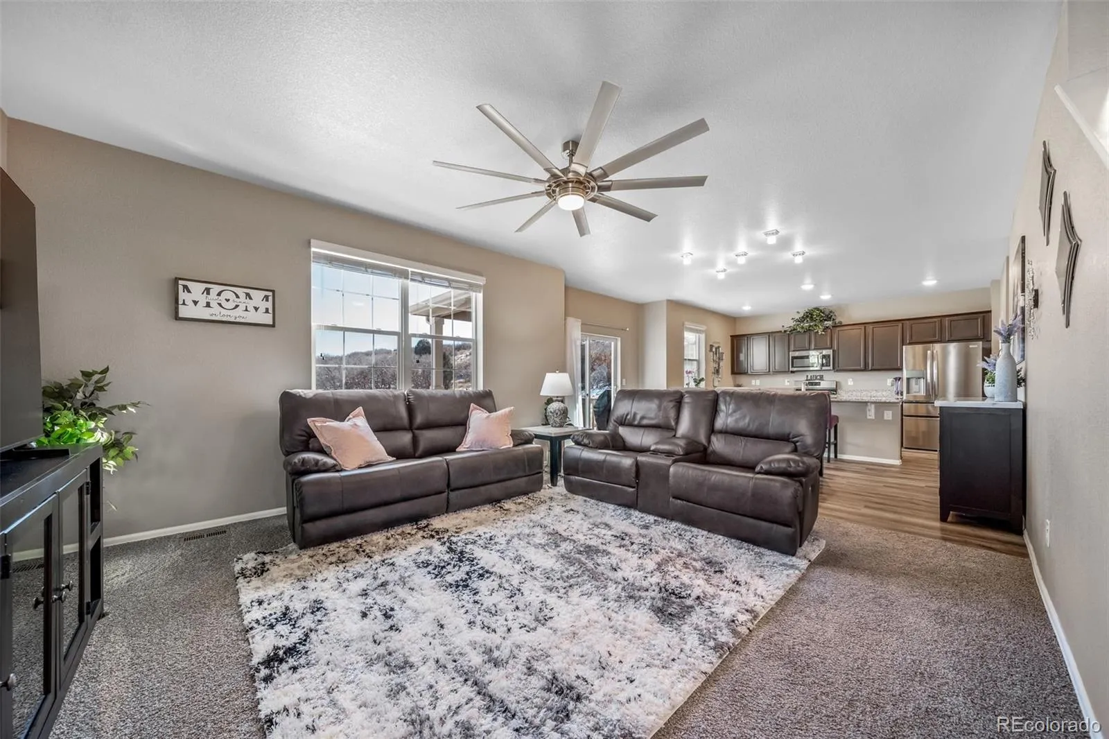 Situated in Crystal Valley Ranch and backing to wide-open space, this beautiful two-story home offers the kind of Colorado views that never get old—rolling meadows, distant hills, and the occasional wildlife sighting that makes you pause and take it all in. A welcoming covered front porch sets the tone before you even step inside. The main level is bright, open, and thoughtfully designed for everyday living and easy entertaining. At the heart of the home, the kitchen features granite countertops, stainless steel appliances, abundant cabinetry, and a generous island with seating. Check out the huge walk-in pantry! Don’t miss the adorable doggie den just inside the garage access, that could also be used as a mudroom or more convenient storage. Upstairs, the primary suite is truly a retreat. In addition to the private ensuite bath and walk-in closet with window, the bedroom includes a separate space currently used as a home office. This flexible area could easily serve as a reading nook, nursery, workout corner, creative studio, meditation space, or cozy sitting area to unwind at the end of the day. Two additional bedrooms, a full bathroom, and an upper-level laundry room complete the second floor with a layout that is both practical and comfortable. The unfinished daylight basement offers excellent potential for future living space or keep as is for plentiful storage. Outside, the deck overlooks the fully fenced backyard and expansive open space beyond. It’s an ideal setting for enjoying Colorado’s big skies and peaceful surroundings. Crystal Valley Ranch amenities include a clubhouse, fitness center, pool, parks, and trails. A new I-25 interchange at Crystal Valley Parkway is currently under construction and expected to be completed in 2027, creating a convenient new connection to the interstate. With its open-space setting and flexible living spaces, this home offers the perfect balance of comfort, views, and long-term livability. Don’t miss out on this gem!