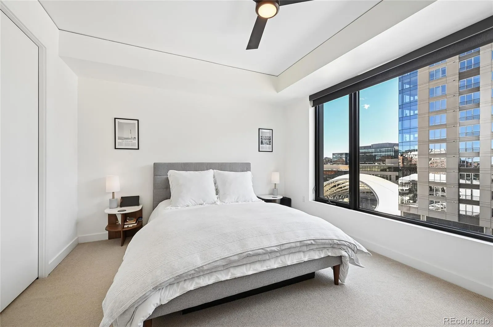 The primary suite includes a walk-in closet and a luxurious ensuite bath with double vanity and glass-enclosed shower. A well-sized second bedroom and full bath provide flexibility for guests, home office, or den. Additional features include in-unit laundry, smart thermostat, and two deeded garage parking spaces — a rare find in downtown Denver.