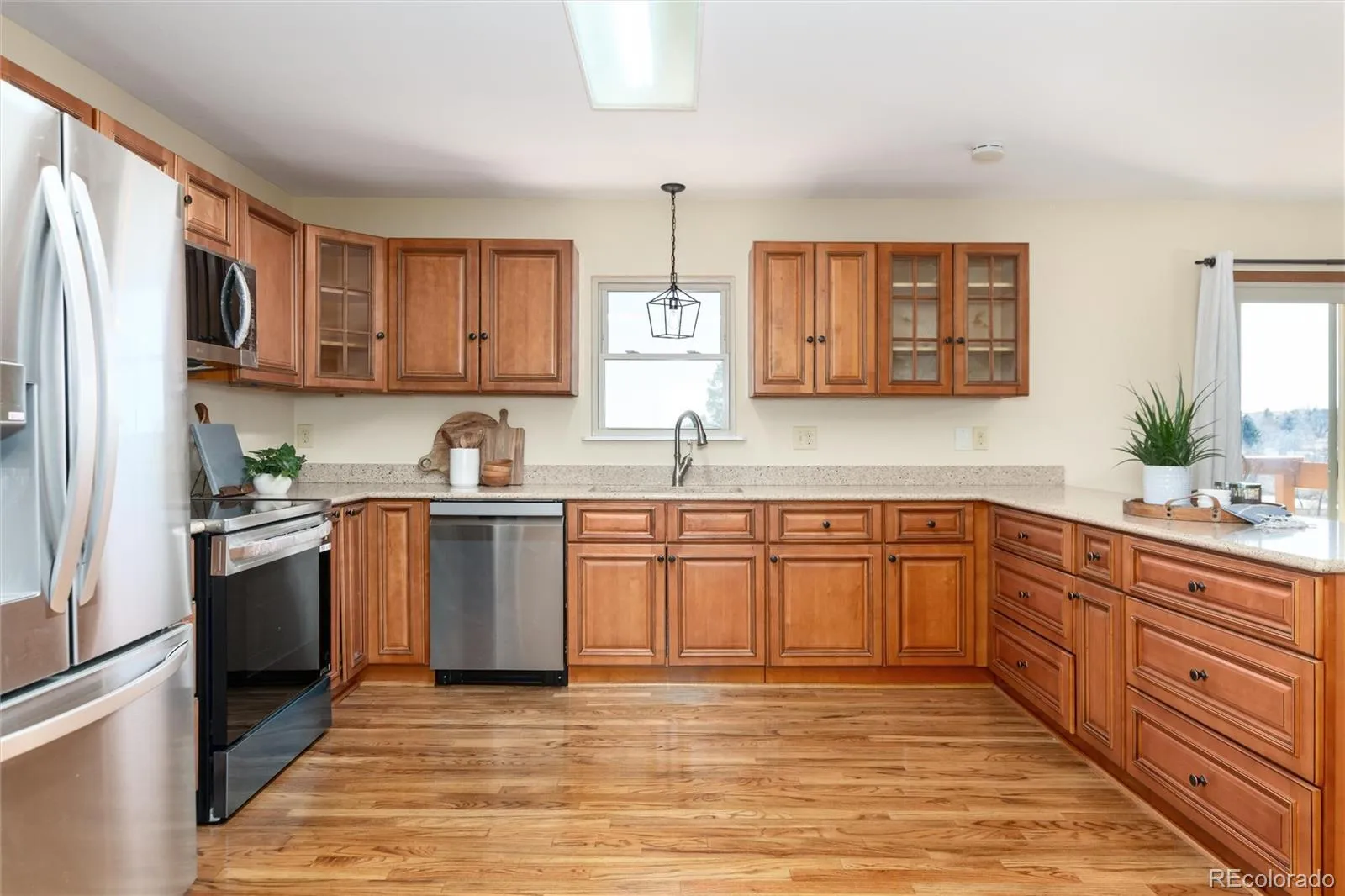The main level features an open and welcoming layout with hardwood flooring, large windows, skylights, and a cozy fireplace that fills the living space with natural light and warmth. The spacious kitchen offers brand new built-in kitchen appliances, quartz countertops, updated cabinetry, and abundant prep space, making it ideal for both everyday living and entertaining. Just off the main living area, a bright sunroom provides the perfect spot to relax and enjoy views of the expansive property year-round.