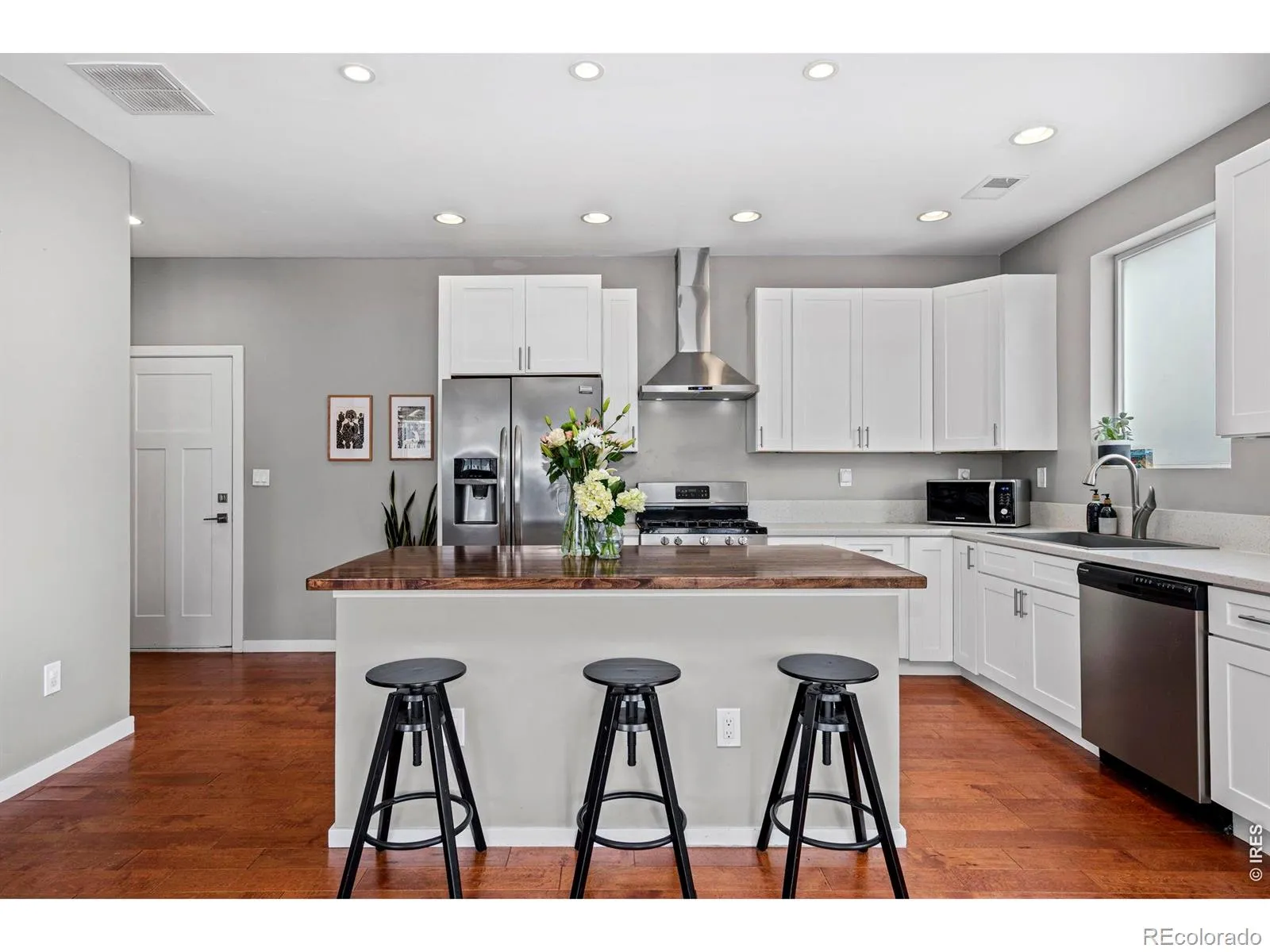 Kittle Real Estate presents modern living in the heart of Fort Collins! Located on a corner lot in the Old Town District, this newer two-story home delivers style, comfort, and a location that puts the best of the city within reach. A beautifully landscaped yard and eye-catching curb appeal create a strong first impression the moment you arrive. Step inside to a light-filled main living area featuring high ceilings, engineered hardwood flooring, and abundant natural light that create a warm and welcoming atmosphere. The open-concept layout allows each space to flow seamlessly together. The kitchen includes stainless steel appliances, quartz countertops, and a center island perfect for meal prep, casual dining, or hosting guests. The upper level features three well-sized bedrooms, including the primary suite with an en-suite bathroom and walk-in closet. Each space offers natural light and flexibility for a variety of uses. The home also includes central A/C for year-round comfort, a valuable feature in the area. Outside, the fenced yard provides a private outdoor setting complete with a concrete patio, ideal for outdoor dining or relaxing evenings. The one-car attached garage features wall to wall heavy 3/4″ rubber flooring, high ceilings which can be used as an extra vertical space for storage, as well as a dedicated split unit with both heating and AC. This highly walkable location places you just minutes from CSU and the vibrant shops, restaurants, and nightlife of Old Town, making it easy to enjoy everything the city has to offer, right outside your door. No HOA!