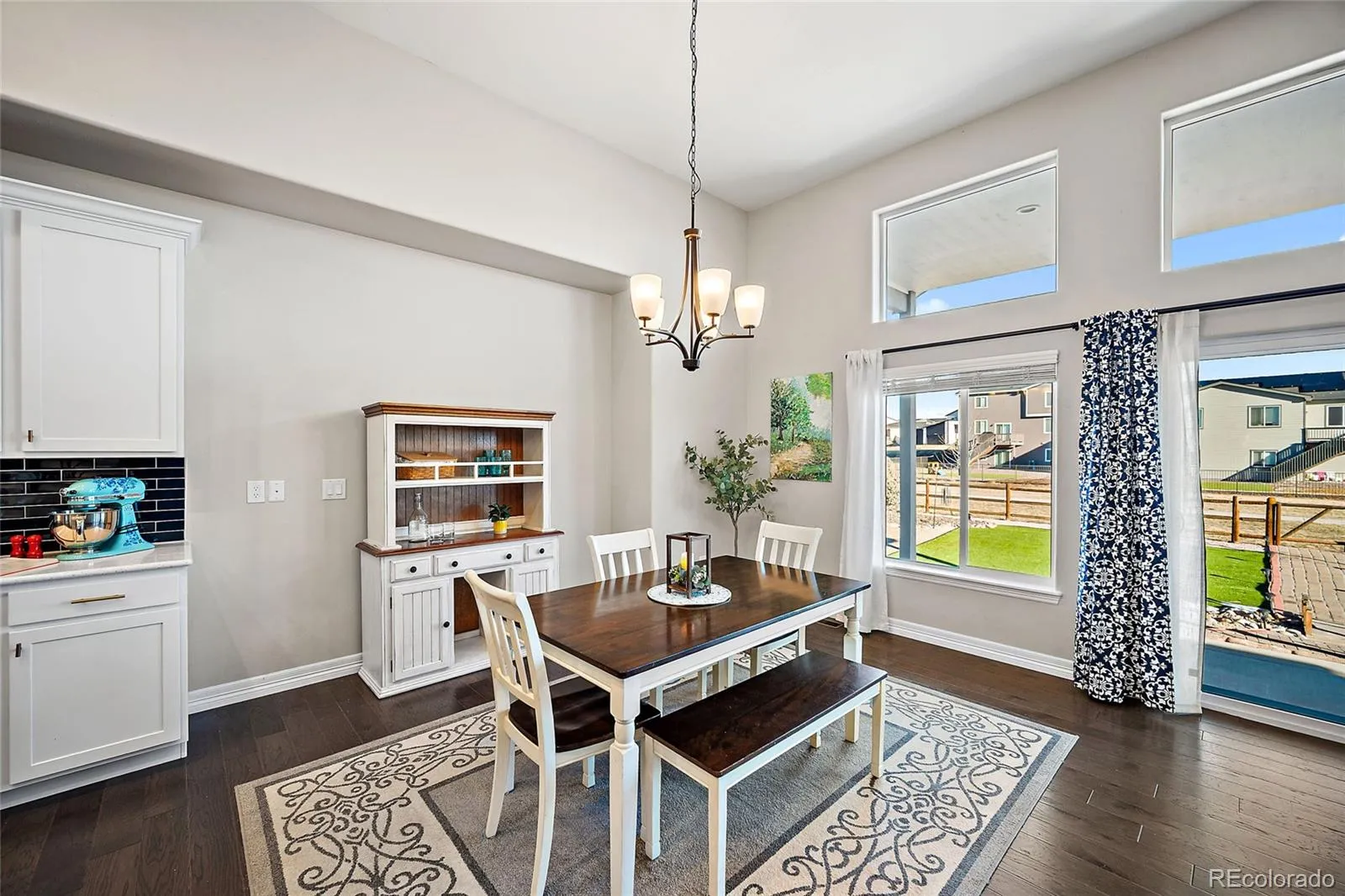 Tucked against open space with private gate access to the community trail system, this exceptional home offers thoughtful design, generous scale, and effortless livability in one of Meridian Ranch’s most sought-after settings. The great room and kitchen feature 12-foot ceilings and large windows that frame open space views and fill the main level with natural light, all flowing together around a stone gas fireplace. The kitchen is outfitted with quartz countertops, a large island with bar seating, stainless appliances, a gas range, dual ovens, walk-in pantry, soft-close cabinetry, and island-integrated outlets. Four bedrooms on the main level include a primary suite with tray ceiling, dimmable lighting, jetted soaking tub, tiled shower with built-in seating, and a custom walk-in closet. A laundry room with sink and cabinetry and a pass-through mudroom add everyday functionality. The finished basement offers a recreation area with built-in surround sound, a wet bar with quartz countertops and generous seating, two bedrooms, a full bath, new LVP flooring, and ample storage. One bedroom’s oversized walk-in closet makes it a natural second primary suite. Outdoor spaces include covered and open patios, recently installed turf, updated landscaping, a Colorado wildflower rock feature, and full fencing, a private, low-maintenance retreat connected to the outdoors. Additional highlights: 8,400-watt solar array, three-car garage, dual water heaters, radon mitigation, new furnace with humidifier (2023), whole-home audio, Ring cameras, programmable dimmable lighting, and hand-troweled wall and ceiling finishes throughout. Residents enjoy full access to the Meridian Ranch Recreation Center, pools, lazy river, fitness facilities, basketball courts, and community events.