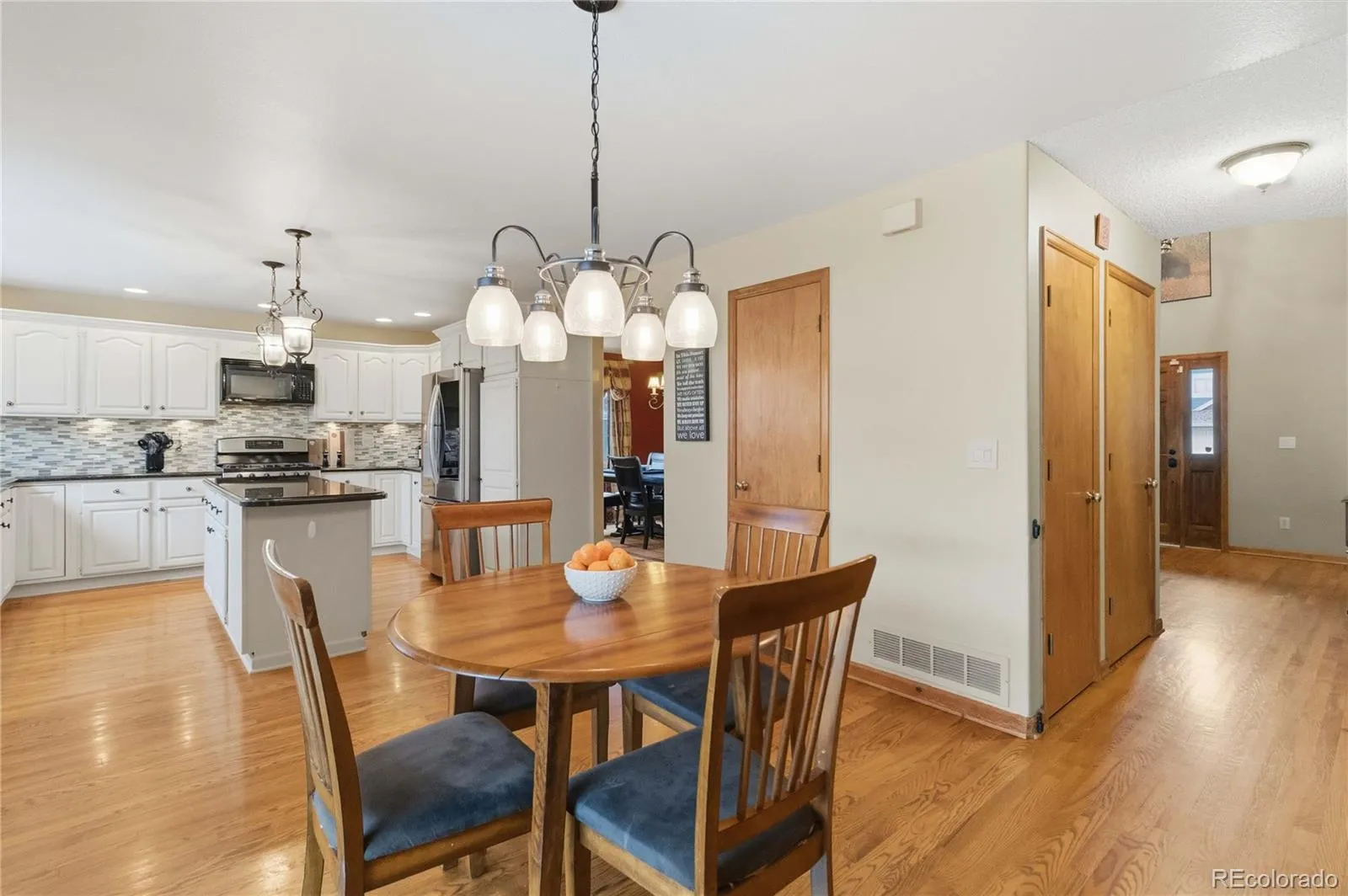 The well-appointed eat-in kitchen boasts an island, pantry, and Stainless Steel appliances, making it perfect for preparing meals and hosting gatherings. Cozy up by the fireplace in the family room, or step outside to relax on your private patio overlooking the backyard, ideal for entertaining or enjoying Colorado sunsets. The main level also includes a dining room, main level bedroom or office, 3/4 bath, and laundry room. Upstairs you will find the fabulous vaulted Primary suite with sleeping quarters, sitting area with built-ins and a 5 piece bath with walk-in shower and walk-in closet. Additional space is found in the finished basement that includes 2 bedrooms, a 3/4 bath, along with additional living space and storage. Don’t miss the storage shed for all of your extra gear.