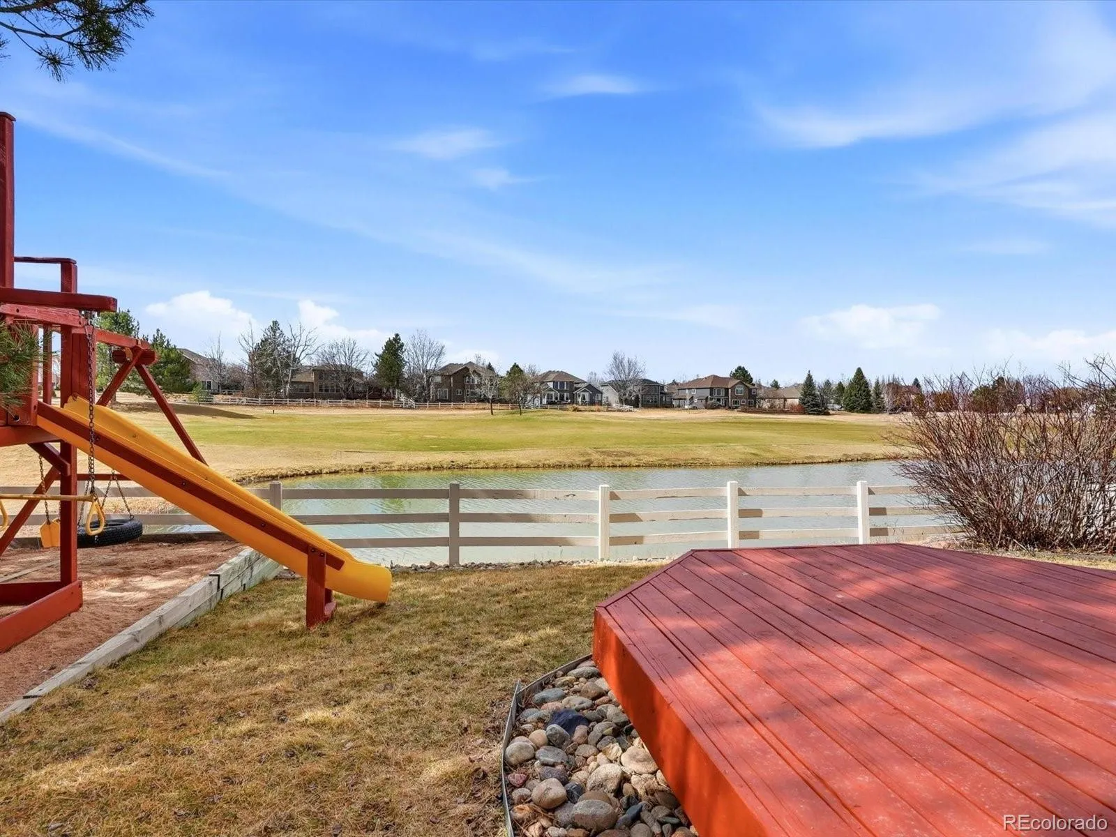 Welcome to 13955 Dogleg Lane, a beautifully refreshed golf-course home in the heart of the Broadlands, where lifestyle, views, and space come together in a truly special setting. This 5-bedroom, 4-bath residence backs to the 8th fairway of the Broadlands Golf Course and overlooks a serene pond, offering peaceful views and rare privacy. The pond attracts local wildlife including turtles, fish, ducks, geese, and the occasional Great Blue Heron, adding to the home’s tranquil outdoor setting. Inside, the home feels light, clean, and move-in ready with brand-new carpet and fresh interior paint throughout, complemented by timeless finishes and an easy, flowing floorplan. The main level features warm wood floors, spacious living and dining areas, and a well-appointed kitchen anchored by a Viking range and cooktop, stainless steel appliances, and ample cabinetry-ideal for both everyday living and entertaining. Large windows throughout frame beautiful golf course and water views, bringing the outdoors in. Upstairs, the generous primary suite offers a relaxing retreat with an en-suite bath and tranquil outlooks, while additional bedrooms provide flexibility for guests, home offices, or multi-generational living. A finished basement adds even more space for recreation, media, or hobbies. The garage is equipped with an EV Charger. Step outside to the recently painted back deck, where mornings begin with coffee overlooking the pond and evenings unwind with spectacular sunset views across the fairway-an ideal Colorado backdrop. Located in the highly desirable Broadlands community, residents enjoy a championship golf course, clubhouse, pools, fitness facilities, miles of trails, parks, and nearby schools and shopping. The home is also less than a five-minute walk to the neighborhood pool and conveniently located between Denver and Boulder.