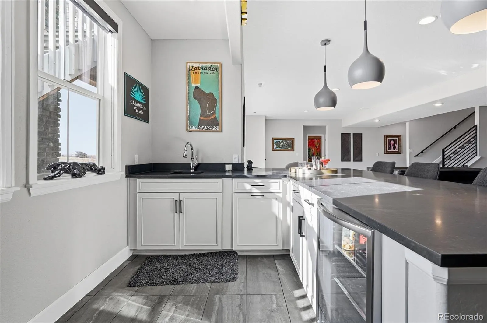 The fully finished basement offers versatile entertainment with high ceilings, abundant daylight via large sliding glass doors to a patio with sweeping views, two spacious bedrooms, two full bathrooms, a dedicated recreation area, and a modern wet bar—ideal for gatherings.