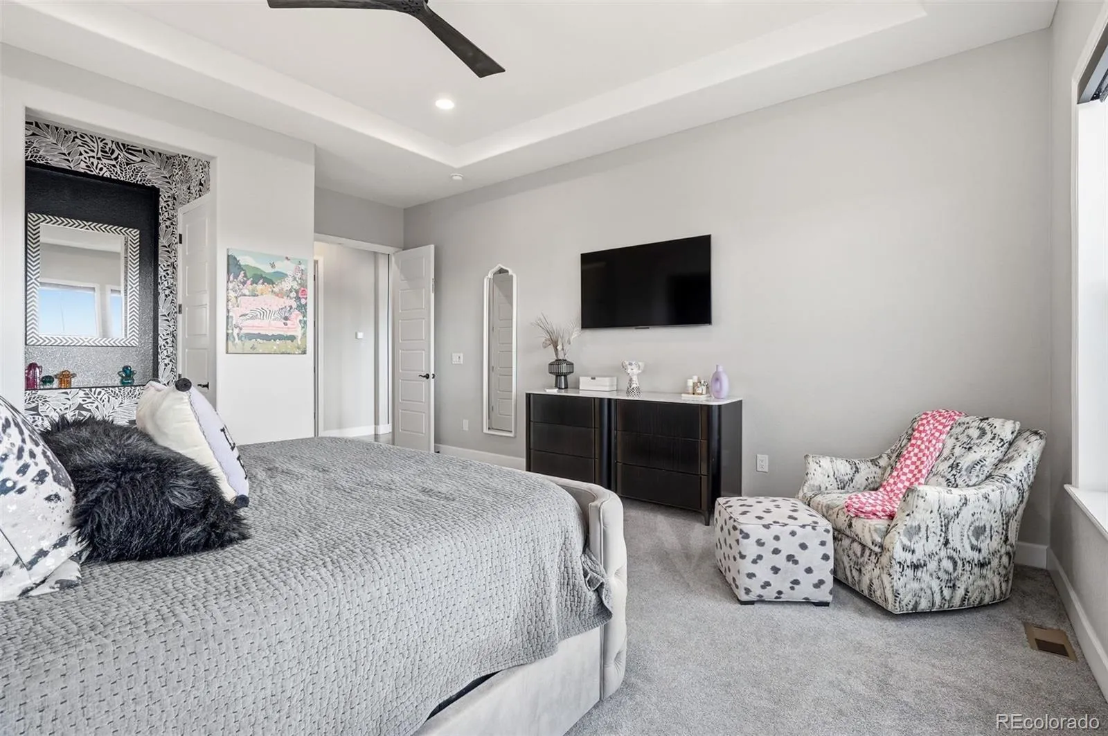 The luxurious primary suite provides serene mountain vistas, high ceilings, and abundant natural light.