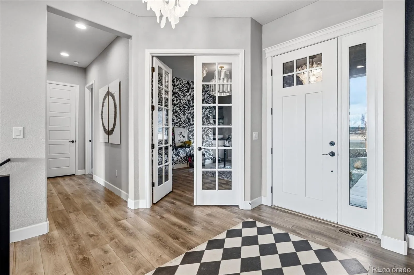 A grand foyer with 10-foot ceilings and LVP flooring sets an elegant tone. To the left lies a sophisticated wine room that doubles as a formal dining space; to the right, a tranquil home office. A private guest suite with full bath ensures comfort and separation for visitors.