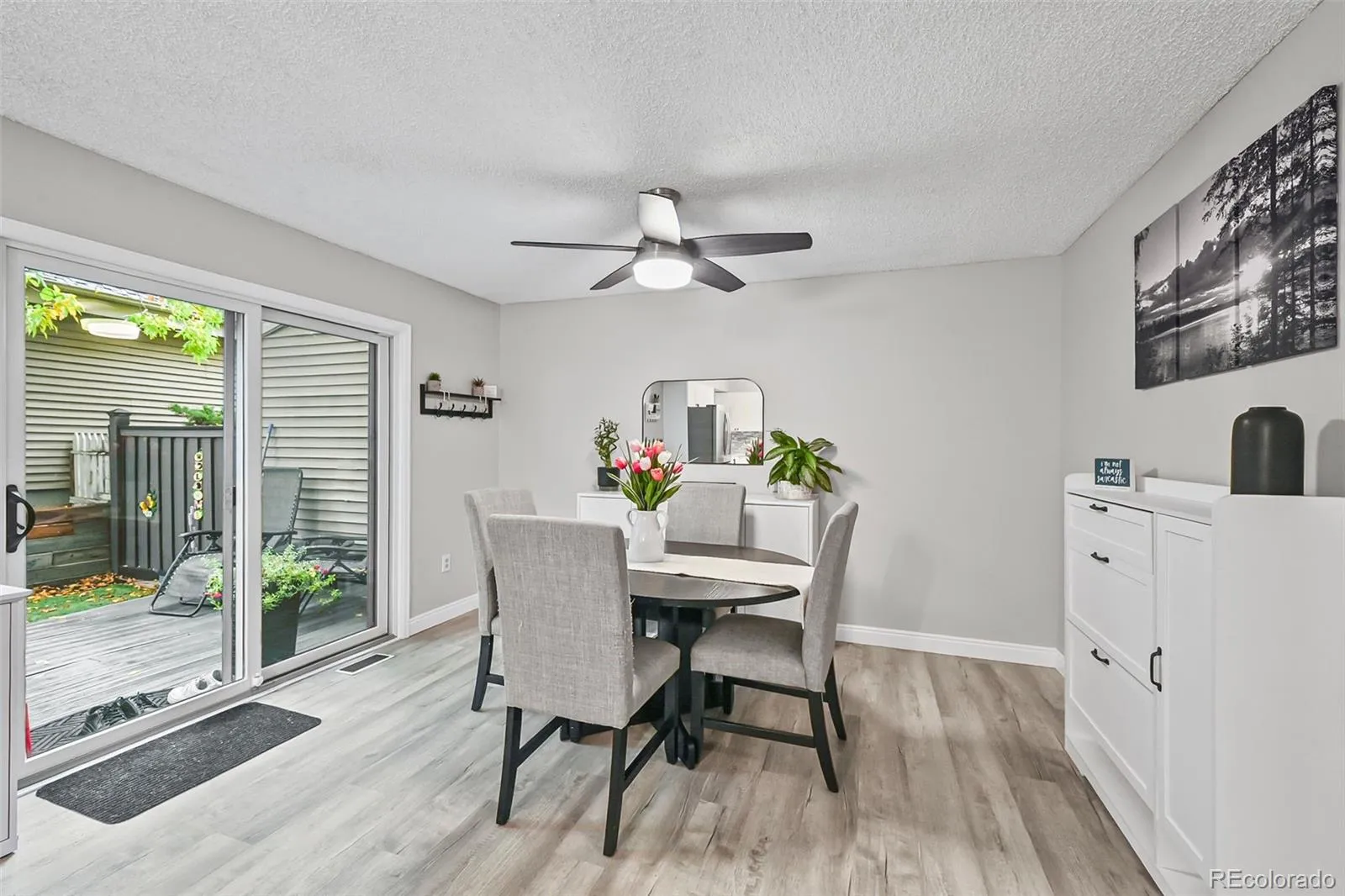 Experience serene living in this beautifully updated condo perfectly situated next to Roxborough Park. Every detail has been refreshed as of November 2024 including a new kitchen, flooring, deck, and fresh paint. Designed for nature lovers, this quiet retreat offers stunning views and a peaceful setting. The vaulted, beamed ceilings in the living room create an airy, open atmosphere centered around a cozy wood-burning fireplace with scenic window views. A versatile main-level office featuring a wet bar can also serve as a formal dining room. The sleek, modern kitchen boasts quartz countertops, abundant cabinetry, a stylish tiled backsplash, and cohesive light fixtures, flowing seamlessly into the dining area and out to a private deck shaded by a mature tree. The deck is perfect for morning coffee or al fresco dining and provides direct access to a detached two-car garage. Upstairs, find two spacious bedrooms including one with a walk-in closet and direct access to a full bathroom. The finished basement adds flexibility, currently serving as a third bedroom or additional living space. This condo combines thoughtful updates, functional spaces, and an unbeatable natural setting making it a perfect retreat for those seeking comfort, style, and tranquility.