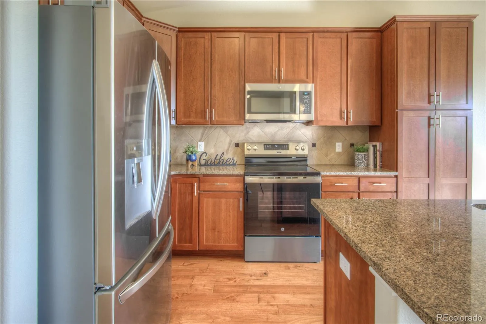 The gourmet kitchen features 42″ cherry cabinets, granite countertops, tile backsplash, and new appliances. The living room is highlighted by a tiled fireplace, creating a warm and inviting focal point. The primary suite includes a walk-in closet and a luxurious 5-piece bath. Additional features include a separate laundry room with extra storage and two versatile bonus spaces perfect for a home office, craft room, or pantry.