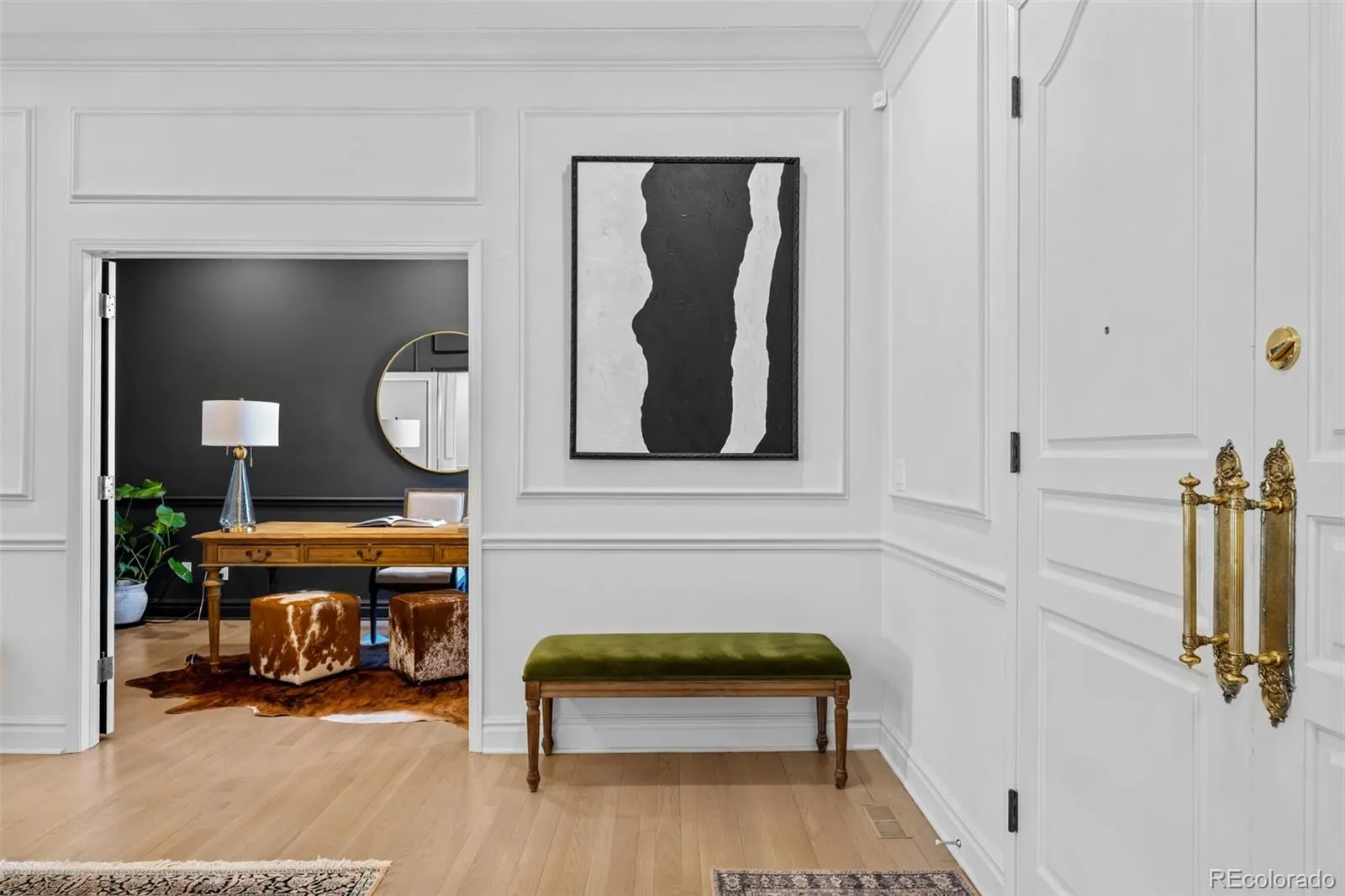 Inside, exquisite craftsmanship is showcased through detailed paneled walls, custom crown molding, and abundant natural light. Just off the foyer, a private office provides a quiet and refined space for work or study. The warm and inviting living room centers around a gas fireplace, creating a cozy atmosphere perfect for relaxing or gathering with guests. Carrara marble and white oak flooring flow seamlessly throughout, adding warmth and refinement to every room.