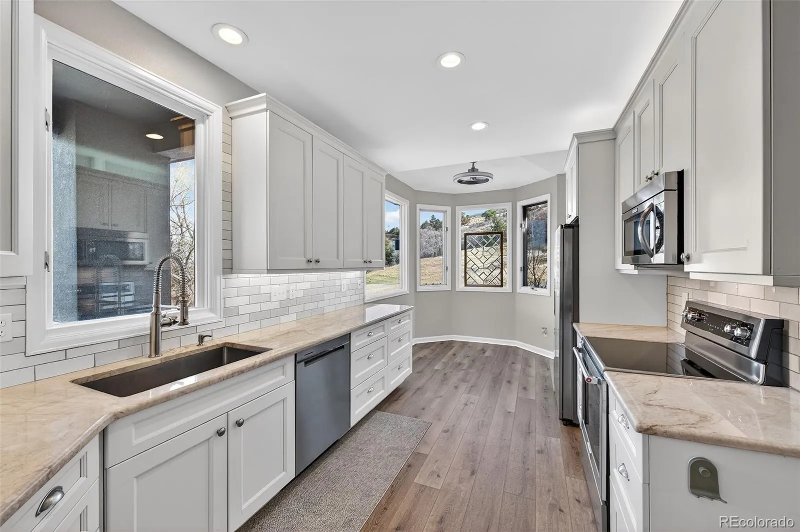The home has been thoughtfully updated throughout, beginning with the remodeled eat-in kitchen featuring stainless steel appliances, soft-close 42-inch cabinetry, quartz countertops, and a stylish tile backsplash.