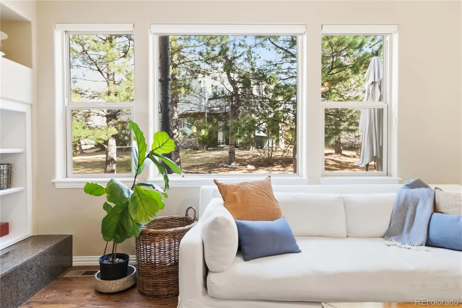 Outside, a peaceful patio overlooks the wooded landscape, creating the perfect setting for quiet mornings or evening gatherings under the Colorado sky.