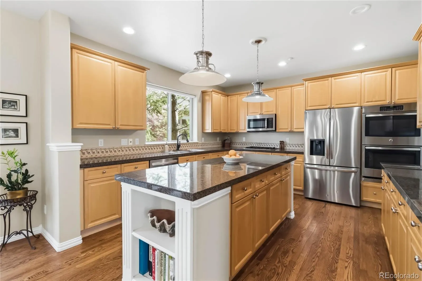 A dramatic entry with soaring ceilings sets the tone for the thoughtfully designed interior. Formal living and dining spaces provide an ideal setting for entertaining, while the private executive office offers a quiet place to work from home. At the heart of the home, the expansive kitchen features an oversized island, abundant counter space, and a sunny breakfast nook that opens to the warm and welcoming family room with fireplace and custom built-ins.