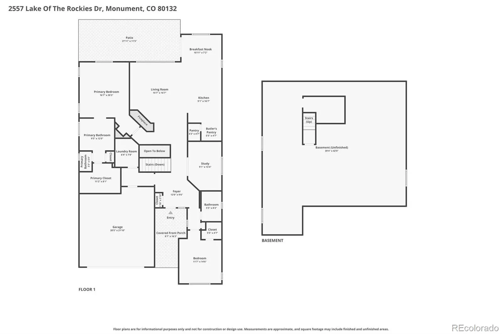 Welcome to this beautiful, well-maintained home in the desirable Lake of the Rockies community in Monument. Situated on a corner lot, this 3-bedroom, 2-bathroom home offers comfort, flexibility, and a fantastic location. Step inside to an open and inviting floor plan featuring a spacious living area with a cozy gas fireplace and a large kitchen designed for both everyday living and entertaining. The kitchen boasts a large center island and a convenient butler’s pantry, providing plenty of space for cooking, storage, and gathering with family and friends. A versatile flex room offers the perfect space for a third bedroom, home office, or nursery—easily adapting to your needs. Should you need extra space, the unfinished basement showcases 1,500 square feet of a blank canvas to expand in any way you see fit! Step out onto the back patio to take in beautiful mountain views and enjoy peaceful Colorado evenings. Located within walking distance to Monument Lake and the charming shops and restaurants of Downtown Monument, with easy access to nearby trails for hiking, biking, and outdoor recreation, this home offers the perfect blend of scenic beauty, small-town charm, and modern convenience.