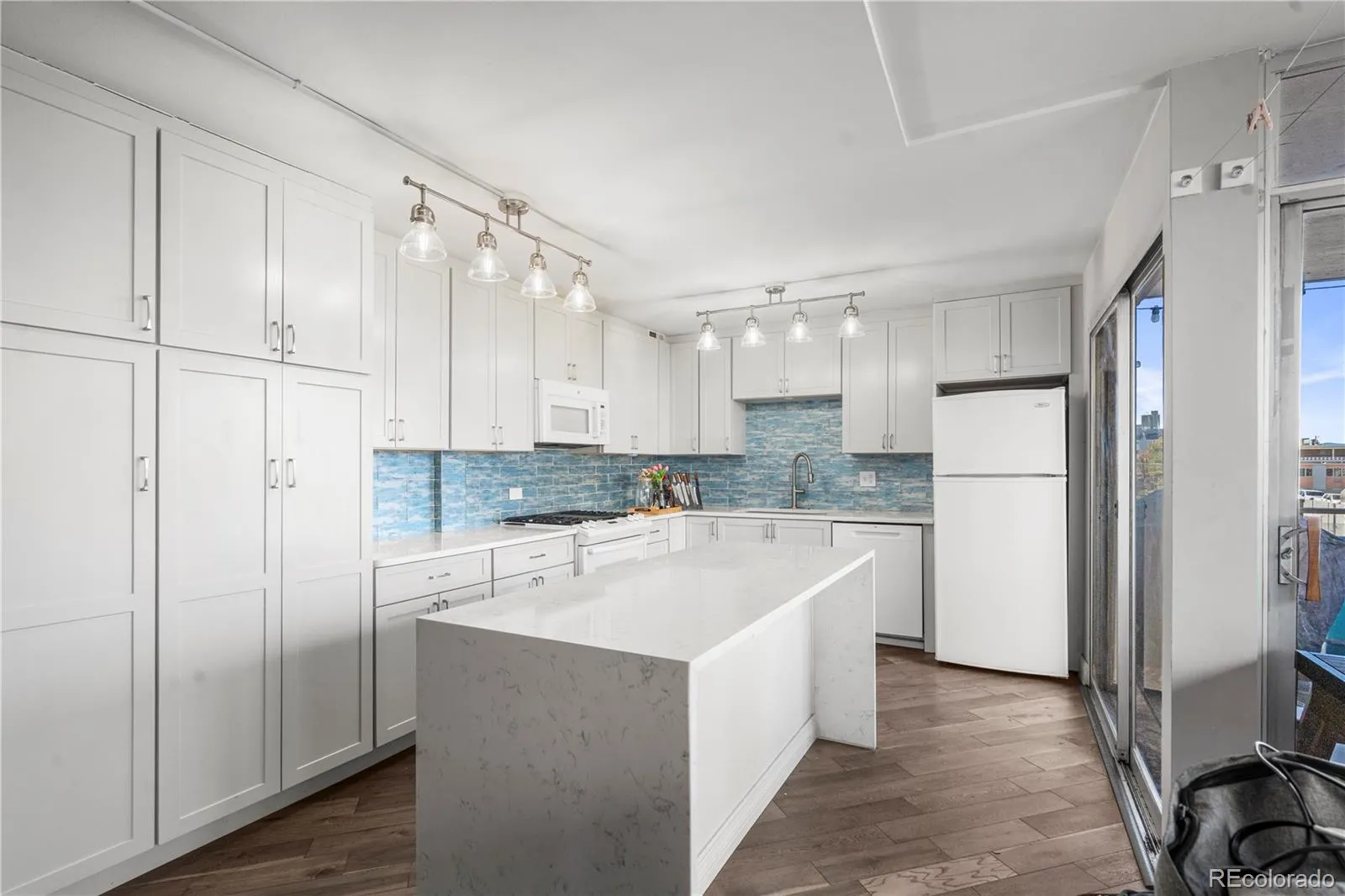 Located on the 4th floor, this spacious home features a bright open layout filled with natural light and views of the southern Colorado sky. The kitchen features granite countertops, generous counter space, and a cook-prep island/breakfast bar that opens to the living area, creating an ideal space for entertaining or everyday living. Gleaming hardwood floors add warmth and character throughout the main living space.