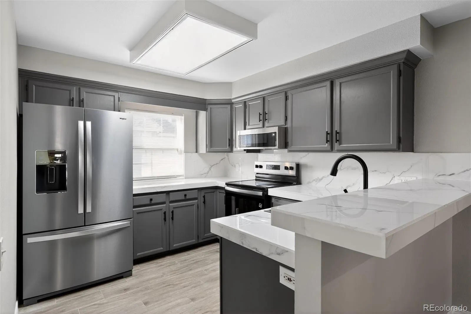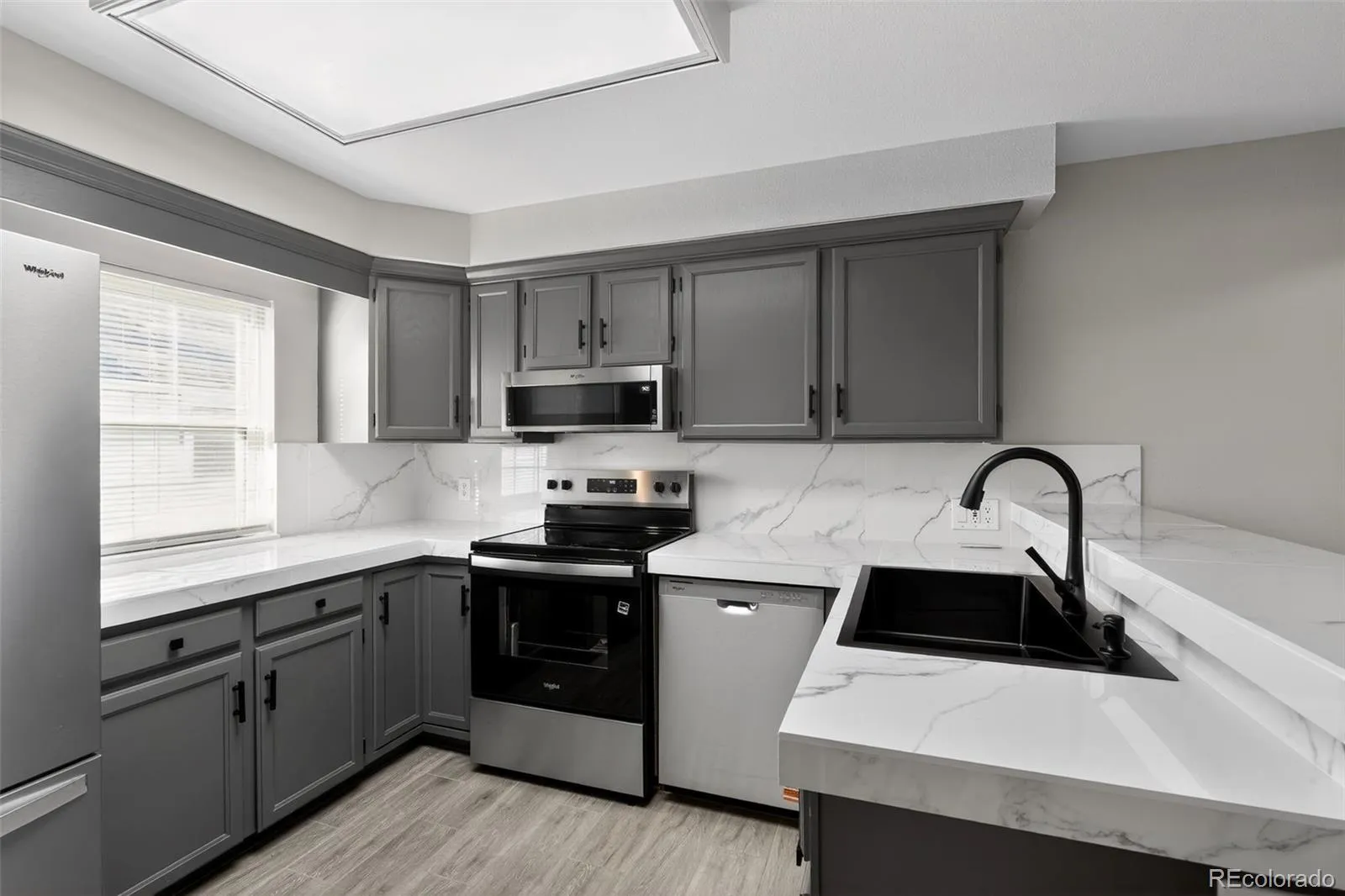 The upgraded kitchen stands out with matching stainless steel appliances, updated cabinetry, a deep black stainless sink with coordinating faucet, and elegant Carrara-style countertops, backsplash, and breakfast bar—perfect for everyday living and entertaining.