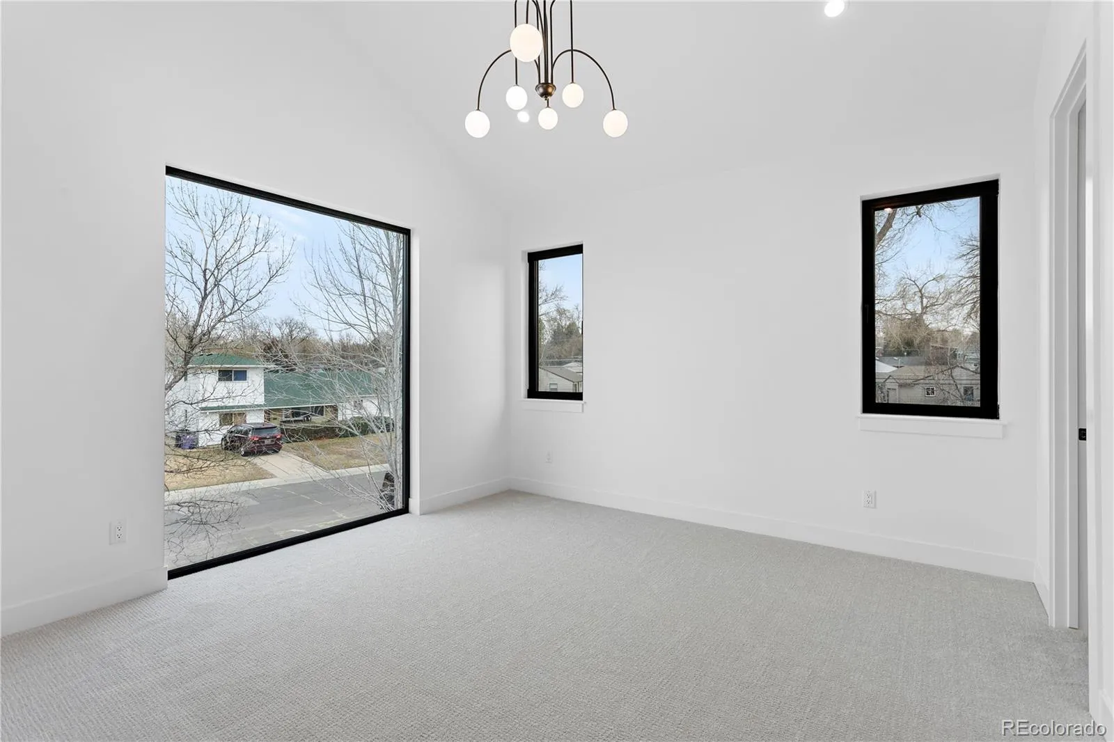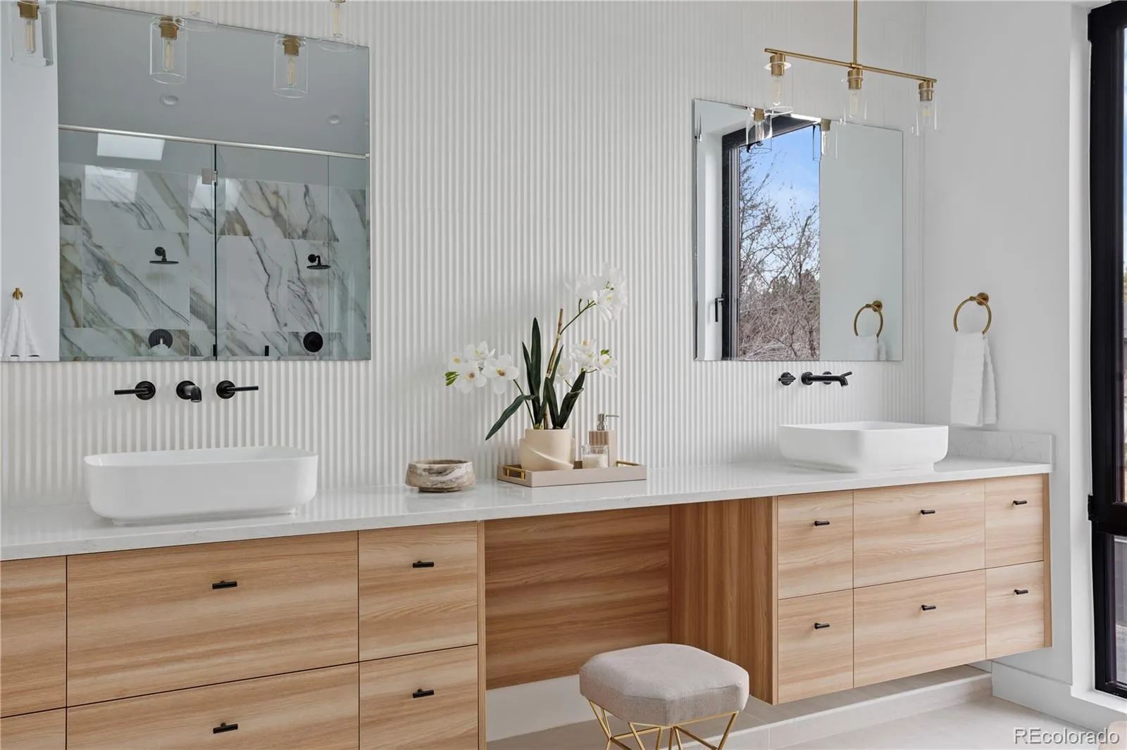 Up the custom floating staircase, the large primary suite showcases vaulted ceilings, him/her closets, gas fireplace (unfinished currently), and a spa-inspired bathroom with skylights highlighted by an oversized shower lined with magnifica encore porcelain. Two ensuite bedrooms and a laundry room fill the second floor.
