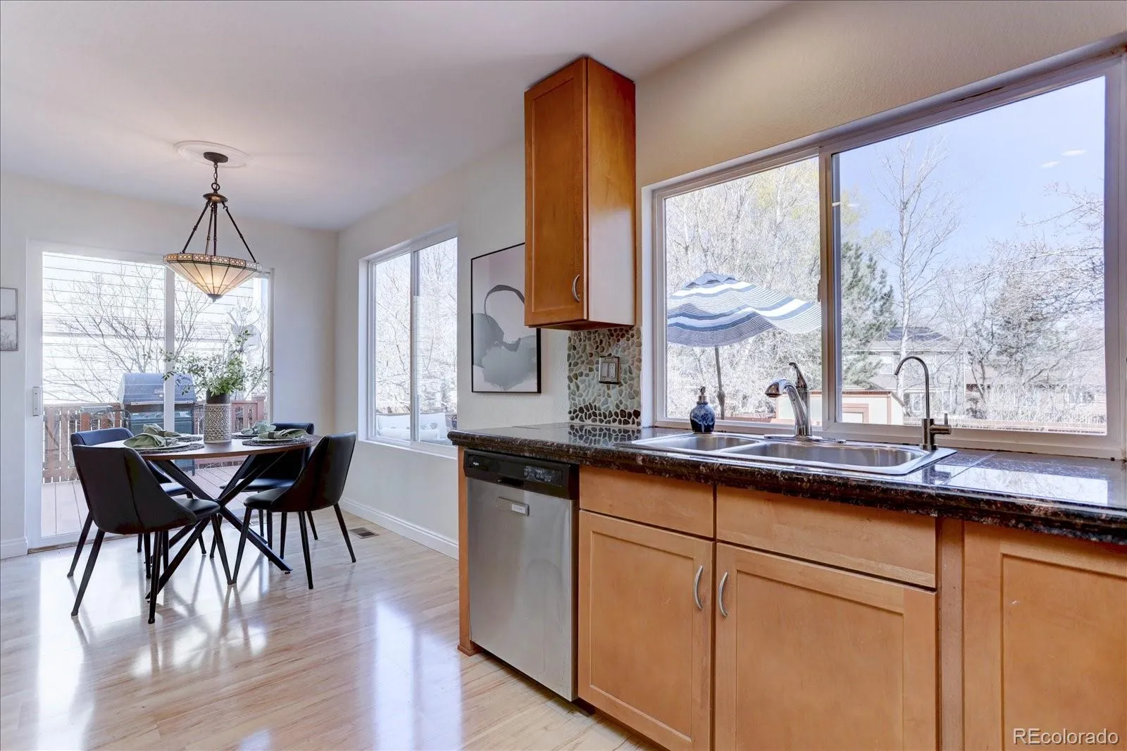 Welcome to this stunning retreat on a private lot where refined finishes, timeless design, and oasis like backyard come together in coveted Arapahoe Ridge. Upon arrival, this SW facing home radiates warmth and intention. Modern paint scheme, LVP and engineered wood floors signal attention to detaiL Step inside to a bright, expansive living room anchored by a classic wood-burning stove – a charming and functional centerpiece. The seamless flow leads into a well appointed eat-in kitchen, designed for daily living and entertaining. Rich wood cabinetry, ample granite tile countertops, and stainless appliances frame practicability and elegance. Kitchen sink and window overlook a private yard transforming simple daily tasks into a pleasure. Convenient laundry and half bath. Ascend upstairs to discover a home that lives larger than it looks with engineered hardwoods. No carpet in the home, delivering a clean cohesiveness, easy to maintain as it is beautiful to behold. Generous loft is ideal for an office, yoga, or creative studio. Dbl doors lead to a primary suite flooded in natural light. Luxurious 5pc bath, dual granite vanities, deep tub, and a glass-enclosed shower. Two guest bedrooms with closet built-ins and updated full bath complete the 2nd level. Additional living space in the basement offering a versatile great room, flex room, and updated three-quarter bath finished in the same quality found throughout the home. The backyard and wrap around deck extend off the kitchen giving an indoor-outdoor connection for simply relaxing or entertaining. Fenced and exceptionally spacious sets this property apart. Privacy, greenery, and room to breathe. Extensive trail system connects Erie and neighboring Lafayette, inviting that active lifestyle. Super amenities. Community pool, clubhouse, park, playgrounds, and sport courts, Enjoy Old Town Lafayette and its acclaimed dining, coffee shops, and vibrant lifestyle. Close to HWY7, I25, and NW PKWY. Once in a lifetime opportunity!