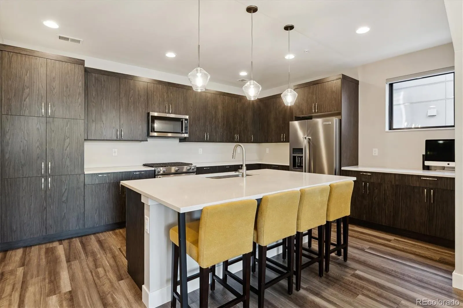 Enjoy urban contemporary, low maintenance living in the up and coming Regis neighborhood; conveniently located off Federal Blvd between I-76 and I-70. This beautiful 3 bd + office/4 bath home has many thoughtful upgrades throughout. Pull into your main level 2 car garage with 220V EV charger. Step into a spacious main floor entry foyer with upgraded low maintenance LVP flooring. The main floor features a bonus room with en-suite bath that can be used for an office, guests quarters or extra storage for all your toys. The 2nd floor boasts a large open floor plan with plenty of light and a view of the mountains to the west. Enjoy cooking in your spacious kitchen with quartz counter tops, upgraded stainless steel appliances, and large kitchen island. The living room features a cozy gas fireplace, framed television (included), and an adjoining dining space. The third floor boasts a sunny primary suite with en-suite bathroom, quartz double vanity and large walk-in closet. There are two additional bedrooms with a full bathroom and laundry closet to round out the third floor. Imagine all the entertaining you will do on your very own private, rooftop deck with mountain views. Madeira Row is just a couple blocks from Regis University, close to light rail and the bus for easy access to Downtown Denver, Lo-Hi, and trendy Tennyson St. Enjoy quiet carefree living in close proximity to the city.