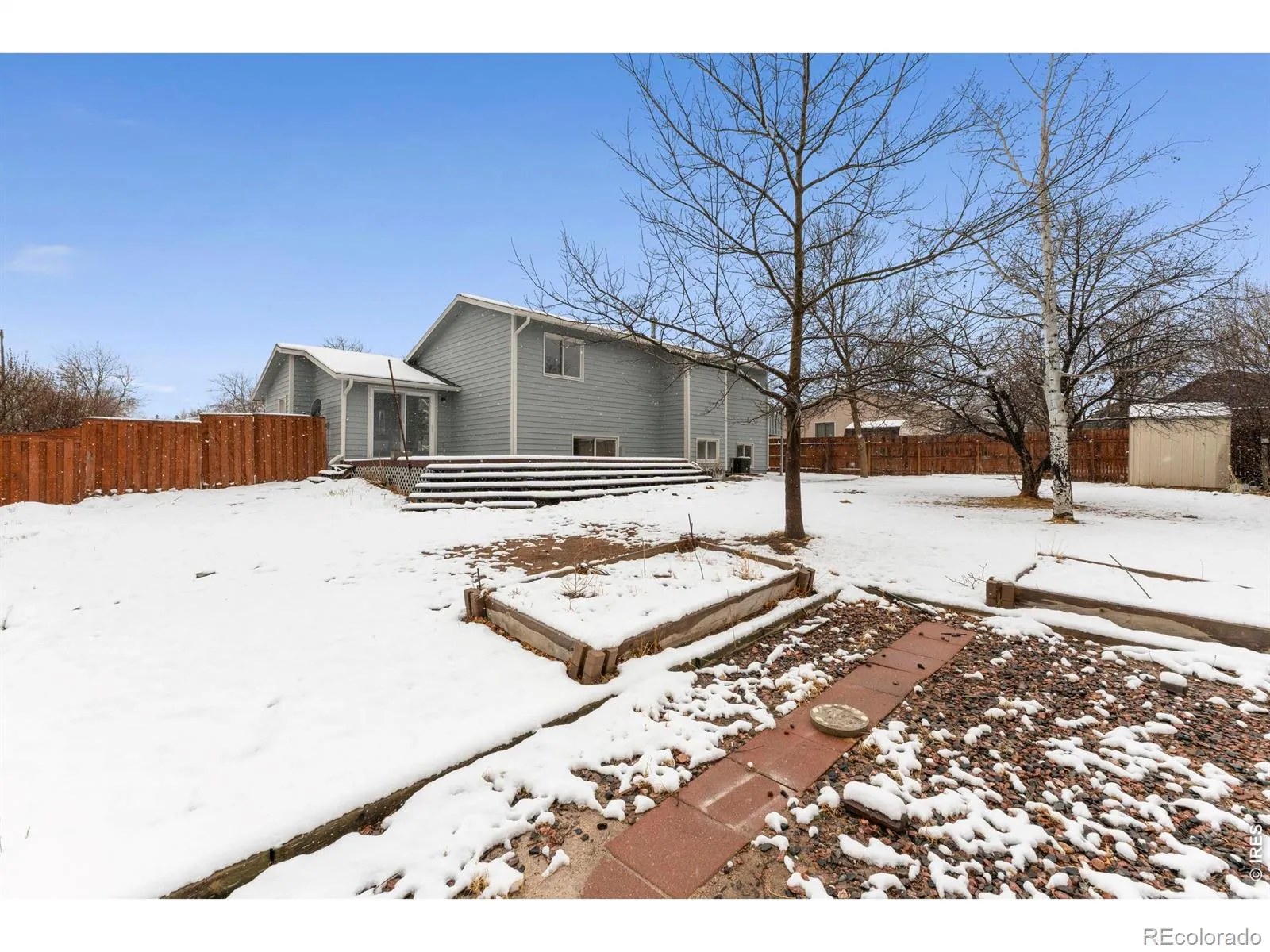 Welcome to this charming three-bedroom, two-bath home on a corner lot in the popular Brown Farm neighborhood of west Fort Collins. Enjoy beautiful foothills views and a thoughtfully designed multi-level layout that offers both comfortable living and great entertaining spaces. Step into the spacious main-level great room featuring vaulted ceilings and a wood-burning fireplace, creating a warm and inviting gathering space. The kitchen offers tile flooring and countertops, abundant cabinetry, and plenty of storage, with both an eat-in dining area and a separate formal dining space that provides direct access to the outdoor deck. Freshly painted inside and out, and featuring brand-new carpet throughout, this home is bright, clean, and move-in ready. The upper level boasts two bedrooms, including the primary suite, along with a full bathroom. The lower level expands your living space with a large family room, additional bedroom, a bathroom, and a convenient laundry area. Step outside to a private backyard designed for relaxing or entertaining, complete with a deck, patio, raised garden beds, mature trees, and a storage shed. Fruit bearing peach tree in the front yard! With its great location, comfortable layout, and inviting outdoor space, this Brown Farm home is a wonderful opportunity to enjoy all that west Fort Collins living has to offer.
