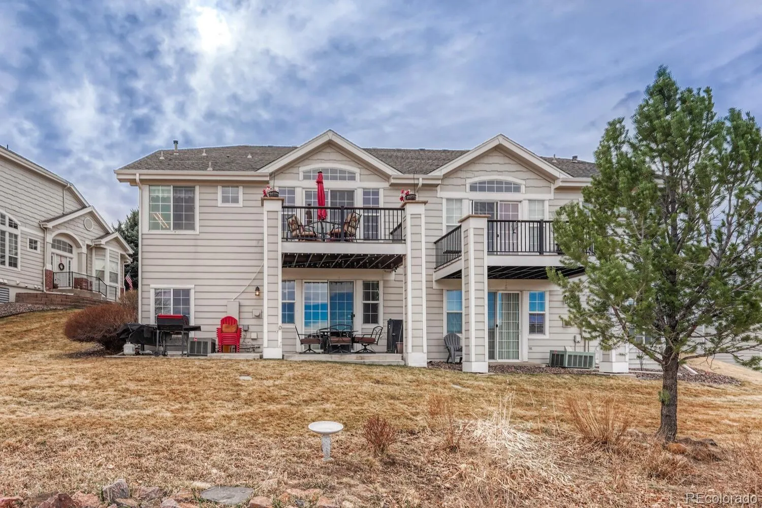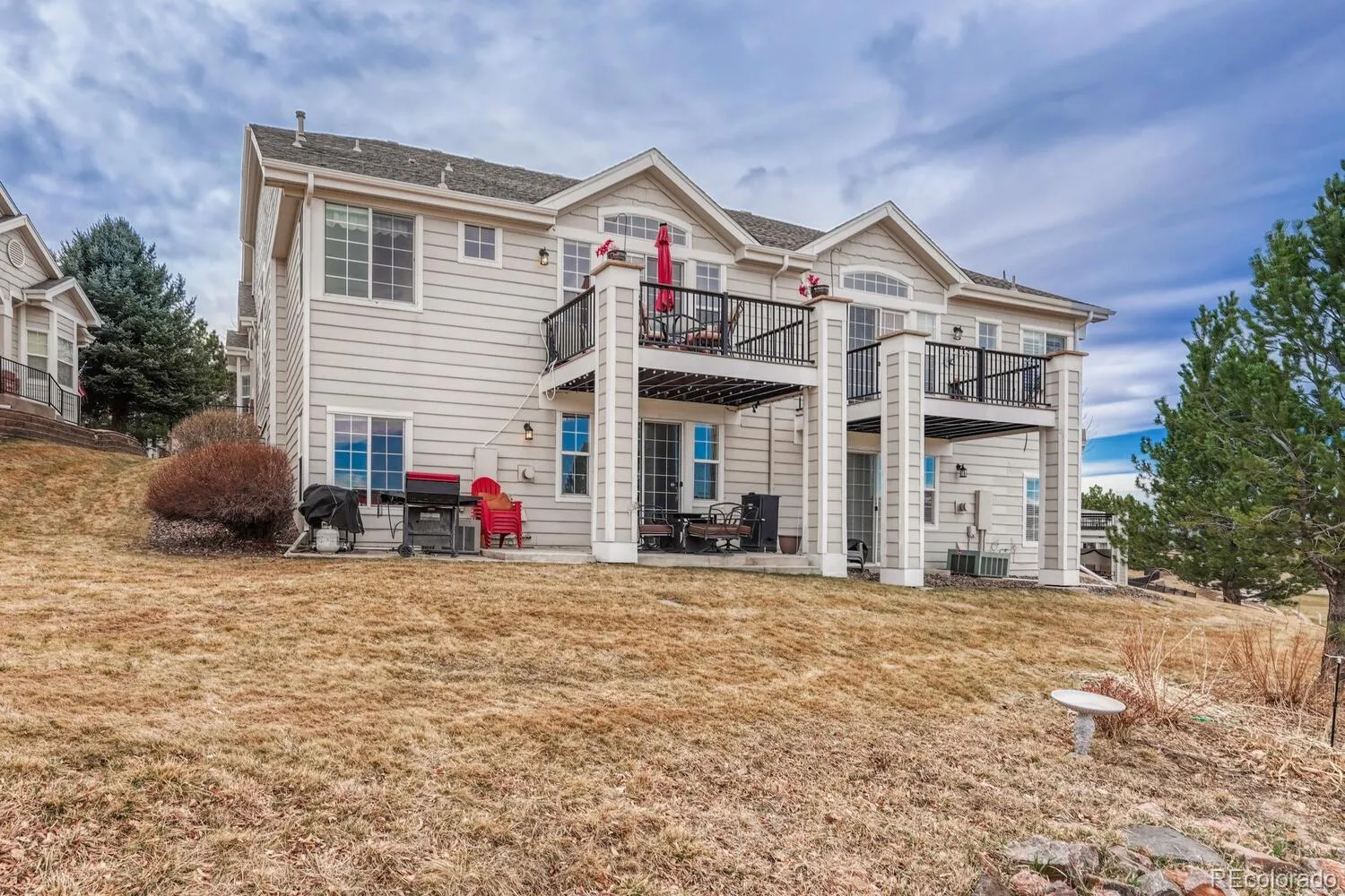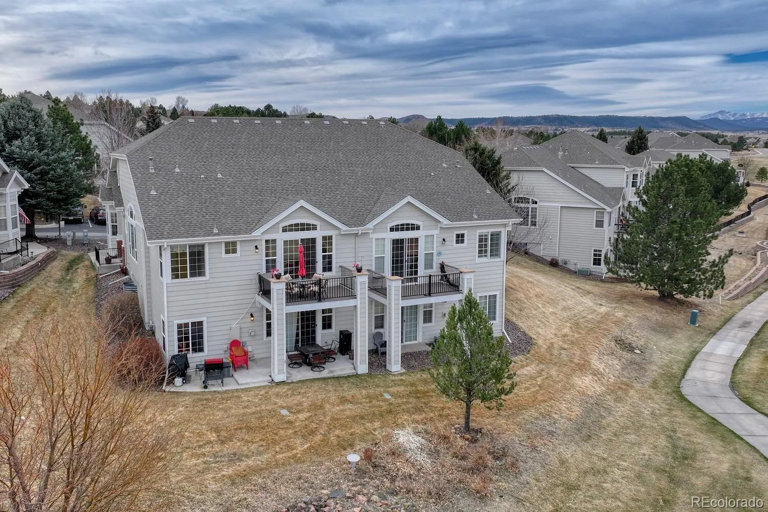 Golf course living in Plum Creek with mountain views and lock-and-leave convenience in the heart of Castle Rock. This beautifully maintained 3-bedroom townhome backs to the 6th Fairway of Plum Creek Golf Course, offering stunning golf course views, Colorado sunsets, and low-maintenance living in one of Castle Rock’s most desirable communities. The open main level features vaulted ceilings, abundant natural light, warm wood flooring, and a cozy gas fireplace, creating an inviting space for everyday living and entertaining. The updated kitchen includes slab granite countertops, newer appliances, ample cabinetry, and generous prep space. The main floor primary suite provides true main-level living with a private deck overlooking the golf course and a spacious 5-piece en-suite bath with updated shower and tub surround. A main floor office offers flexibility for remote work or a quiet retreat. The walkout basement expands the living space with a large family room, two additional bedrooms, and an updated full bath—ideal for guests or multi-generational living. Enjoy outdoor living on the extended patio backing to the golf course, perfect for relaxing and taking in Colorado sunsets. Additional features include a 2-car attached garage, extra storage, and a brand-new water heater. Located in the sought-after Plum Creek community, just minutes to Plum Creek Golf Club, trails, parks, and I-25. Enjoy nearby dining at Great Divide Brewery & Roadhouse and Union An American Bistro, coffee at Lost Coffee, and shopping at the Outlets at Castle Rock. Golf course views, main floor primary suite, walkout basement, and low-maintenance living—this Plum Creek townhome has it all.