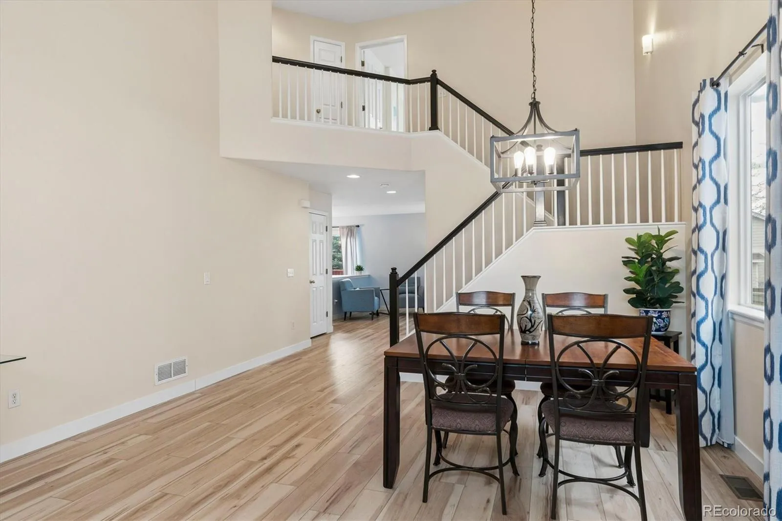 Welcome to this inviting home ideally located in the heart of Highlands Ranch, offering a thoughtful layout, bright living spaces, and room to grow. Large windows fill the main level with natural light, creating a warm and welcoming atmosphere throughout. Newer luxury vinyl plank flooring adds both durability and modern style while complementing the home’s neutral finishes. The main level offers a flexible floor plan designed for both everyday living and entertaining, featuring formal living and dining areas along with a comfortable family room anchored by a cozy gas fireplace and built-in shelving. The kitchen blends classic design with functionality, showcasing stainless steel appliances, granite countertops, timeless oak cabinetry, and a center island that provides additional prep space and room for casual dining. Upstairs, all four bedrooms are conveniently located on the same level, including a spacious primary suite designed as a peaceful retreat. The primary bath features dual sinks, a soaking tub, separate shower, and a generous walk-in closet. Step outside to enjoy Colorado’s sunshine from the redwood deck overlooking the large, flat, fully fenced backyard—perfect for outdoor dining, entertaining, gardening, or play. The unfinished basement offers excellent future potential with plumbing already roughed in, providing the opportunity to create additional living space such as a recreation room, home gym, guest suite, or office. Ideally situated near neighborhood parks, miles of scenic trails, shopping, dining, and top-rated schools, residents also enjoy access to Highlands Ranch Community Association amenities including four recreation centers, pools, fitness facilities, tennis and pickleball courts, and year-round community activities.