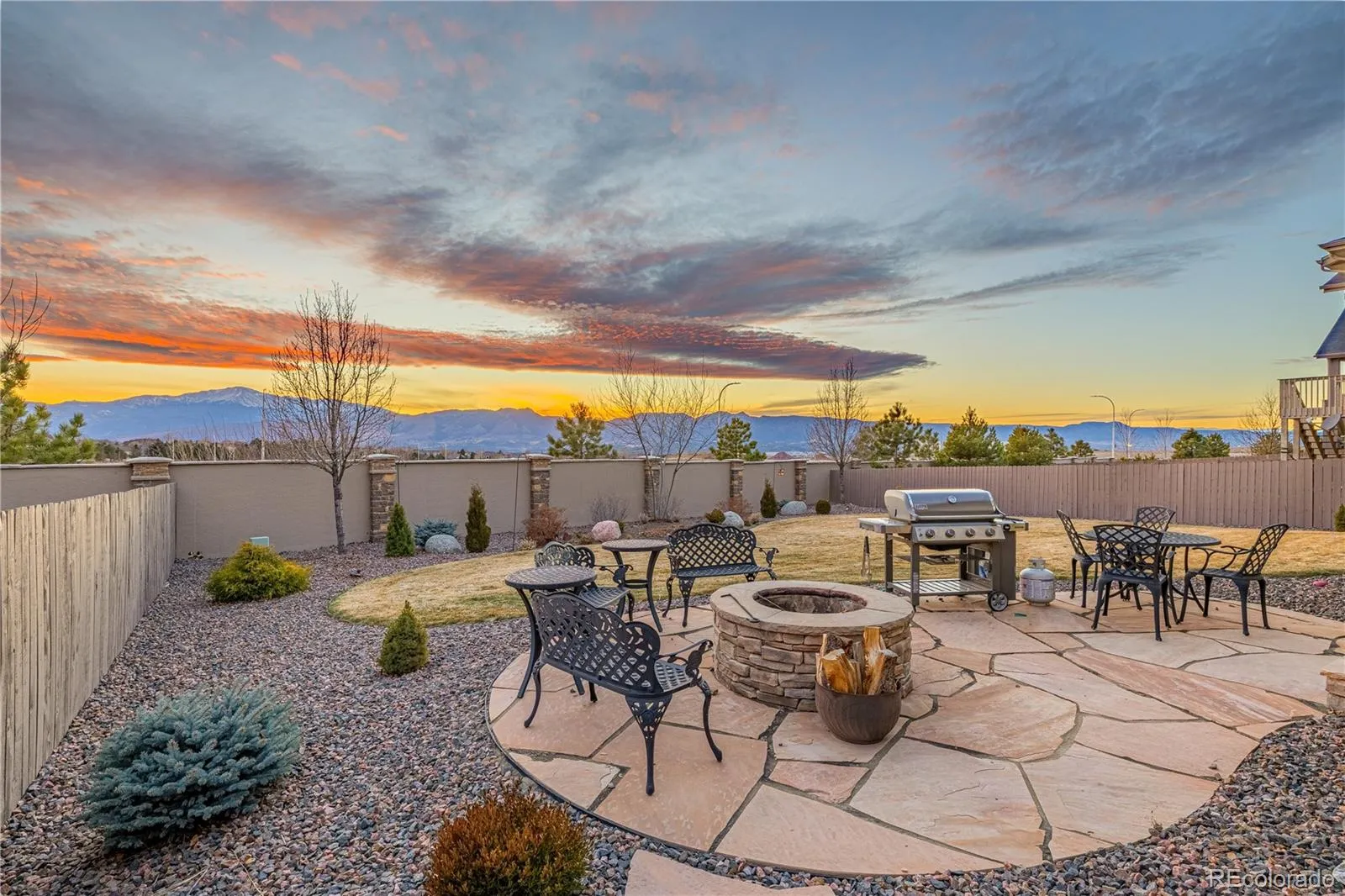 Sweeping MAJESTIC VIEWS plus a 4 CAR GARAGE, and located on a flat culdesac! This stunning semi-custom Campbell home built in 2018 is perfectly positioned to capture breathtaking Pikes Peak and Front Range views, sitting on what is possibly the best lot in Cordera for views and location! Gorgeous hardwood flooring across the main level, with a welcoming Great Room with built-ins and an impressive fireplace * The chef-inspired kitchen features granite countertops, and premium stainless KitchenAid appliances, including gas cooktop, fridge, wall oven & vent hood * Kitchen pantry, bonus seating at the center island, a Breakfast Nook for casual dining, and extended counters and cabinets the entire length of the kitchen area * Walkout from the kitchen to the large covered deck to grilling out or just enjoy a moment of peace with the scenery * Formal Dining Room on the main level, plus main level laundry room with bonus cabinets & storage, and a private guest bedroom and full bath tucked around the corner at the front of the home * The deluxe Primary Suite offers beautifully framed mountain views, a luxurious 5 piece ensuite bath, and TWO spacious walk-in closets (no sharing required!) * Garden-level basement is filled with natural light and designed with entertaining in mind, featuring a large wet bar and a high-end surround sound system * BONUS office or hobby area with built-in workspaces, 2 additional bedrooms & full bath, plus HUGE storage room (could be a 5th bedroom) are also on the lower level * Central A/C * STUNNING landscaped backyard oasis with vibrant perennials, drip irrigation, and colorful tulips and daffodils carefully selected and planted from the Netherlands that return year after year * Custom fire pit and all the room you hoped to find to run & play in the fenced backyard with NO BACK NEIGHBORS * Located in the upscale Cordera community with nearby award-winning D-20 schools, parks & playgrounds, and just a minute’s drive to Target & shopping/dining!