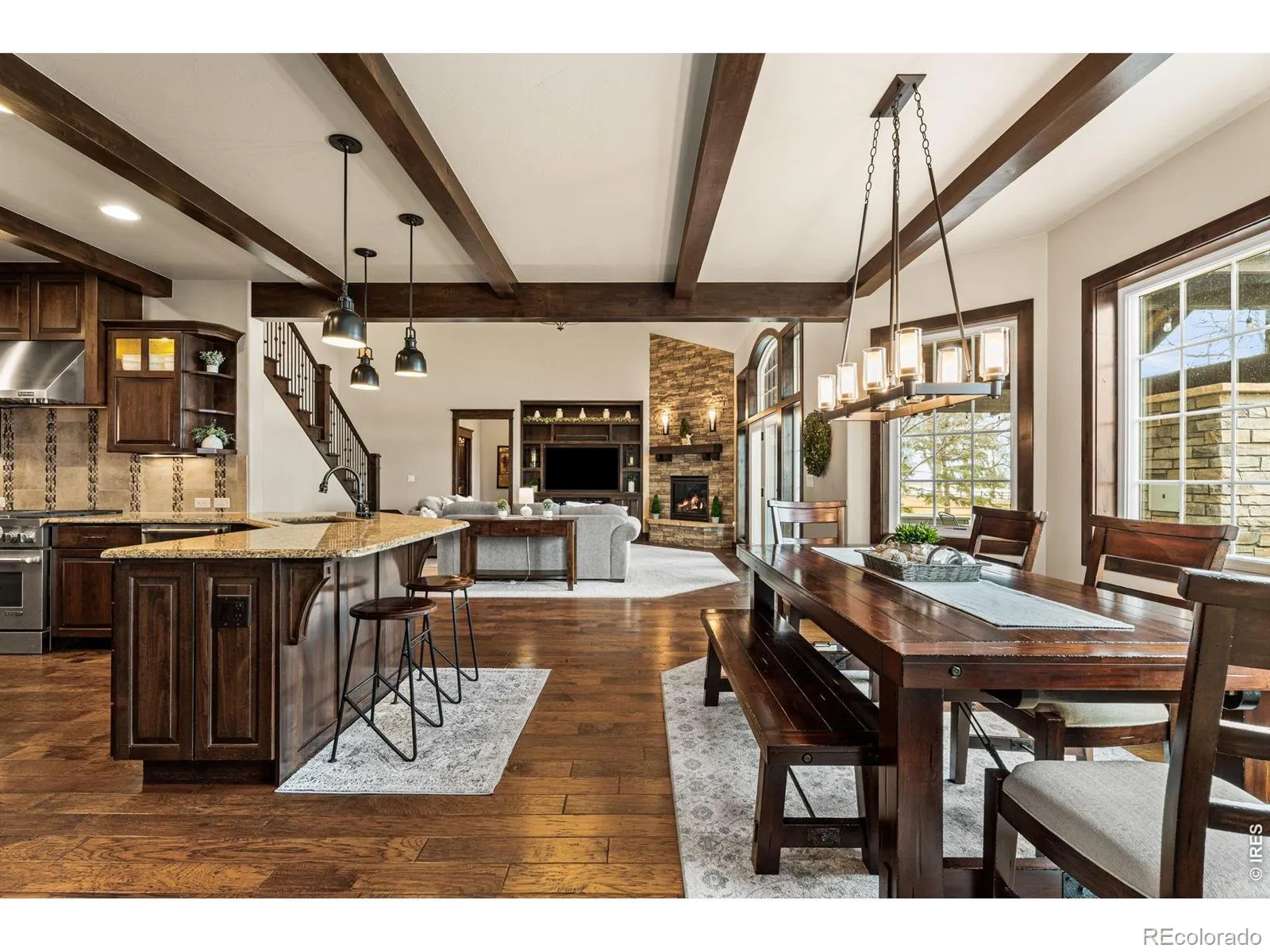 Lakefront living at its finest on coveted Donath Lake. Nestled on 2.28 private acres along one of Northern Colorado’s few private ski lakes, this exceptional property offers the ultimate Colorado lifestyle with a sandy beach, boat dock, boat lift, sand volleyball court, and ample space for the future outbuilding you’ve always envisioned. This charming home welcomes you with an inviting front porch and fresh exterior paint, while the interior showcases distinctive custom finishes throughout. Rich wood floors, knotty alder doors and trim, beamed ceilings, bayed windows, custom built-ins, and brick flooring create character at every turn.The chef’s kitchen is designed for both entertaining and everyday, featuring gourmet appliances, custom cabinetry with pullouts, seeded glass accents, thick raw-edge countertops, and a generous breakfast bar. Nearly every room captures beautiful lake views, including the vaulted family room with dramatic stone fireplace and walls of windows overlooking the water. Step outside to the expansive covered patio with vaulted tongue-and-groove ceiling and a stunning stone fireplace-an ideal setting for lakeside gatherings or peaceful evenings watching the sunset. The spacious main-floor primary retreat enjoys private patio access and features a luxurious five-piece bath and dual walk-in closets. The main level also includes a dedicated study with custom built-ins and glass doors, along with a formal dining room. Upstairs, oversized bedrooms feature large windows and abundant natural light, including one with a charming bay window and window seat overlooking the lake. A versatile upper-level recreation room offers a built-in desk with lake views, Murphy bed, generous storage, and plenty of space to relax and recline. An oversized garage provides ample room for all your gear/toys. With breathtaking lake views, exceptional amenities, and a rare private ski lake setting, this property offers a lifestyle that truly must be experienced in person.
