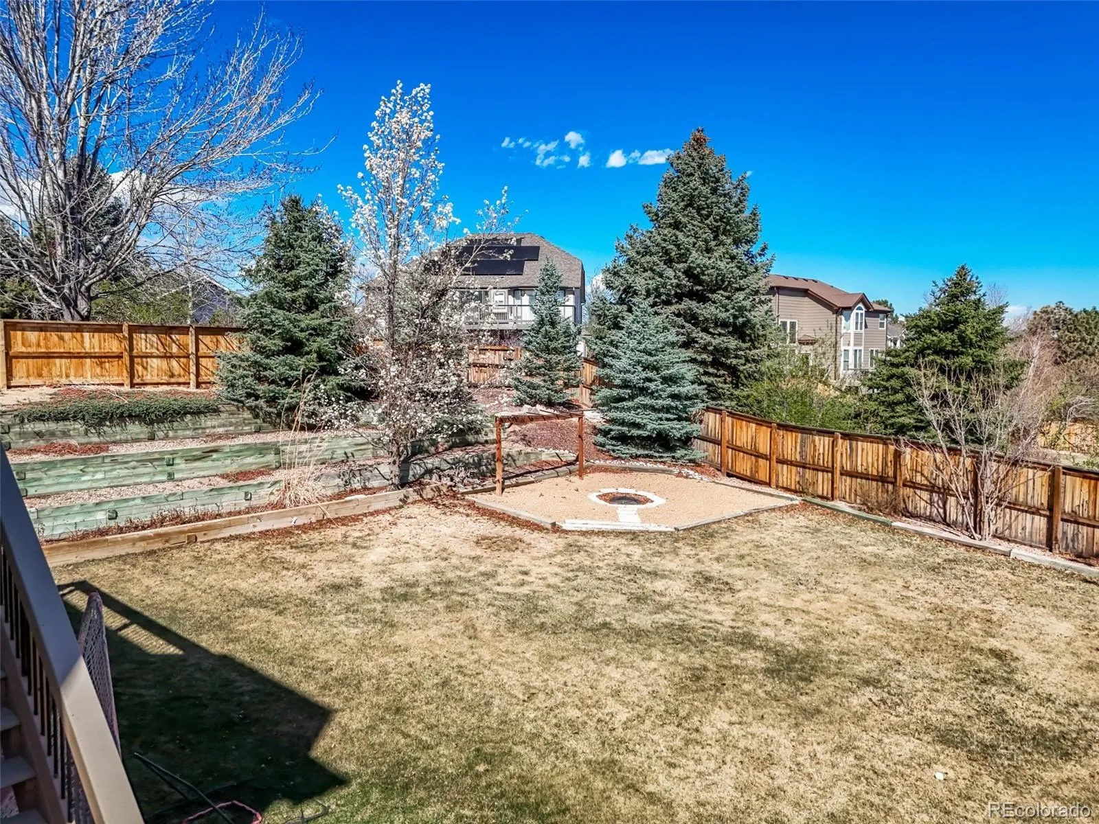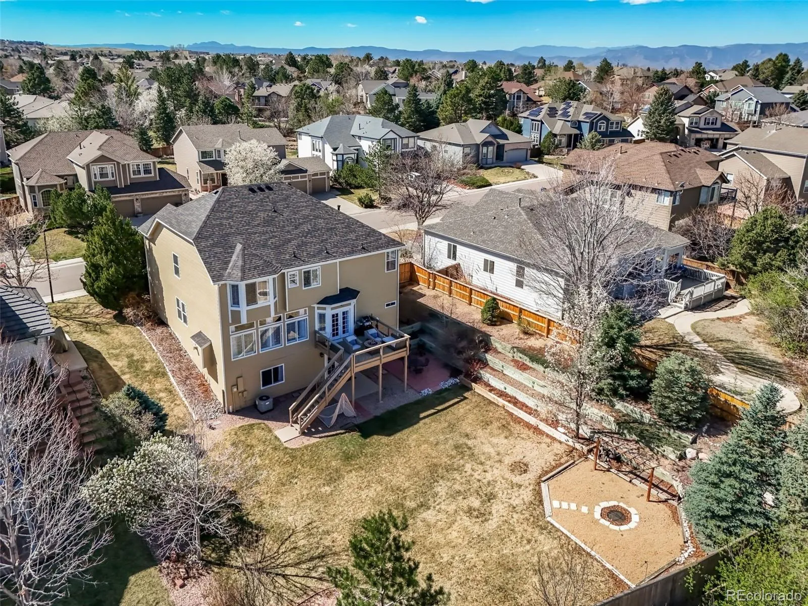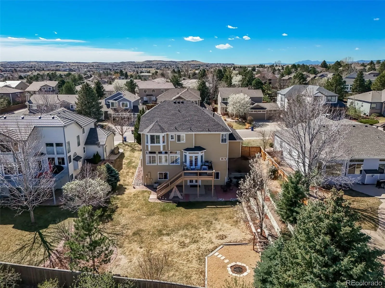 You will fall in love with this beautiful oasis in the highly sought after Highlands Ranch neighborhood! This amazing open floor plan has 5 bedrooms and 3 full baths and one-half bath. Located in a private neighborhood with 4431 total sq feet & a large lot with 11456 square feet featuring a lovely deck, patio, and a fire-pit area surrounded by mature trees and a large flat grassy area. New roof in 2023. You will enjoy lavish entertaining in the spacious great room that is located next to the nook, and the gourmet kitchen with new Cafe appliances, sleek granite counter tops, a cook top, an island, and a seating area. The patio is off the kitchen with double french doors overlooking the backyard. On the main floor there is a dining room, living room, powder bathroom, and laundry room. The upstairs leads to an elegant master suite with a 5-piece bathroom. Three more oversized bedrooms with walk-in-closets. The upstairs also has a spacious loft/office area. The walkout basement features a family room, bedroom, full bathroom, and double french doors that lead to a covered patio and an extended seating area. A second sitting area with a fire-pit is located in the backyard, surrounded by grass and trees for an extremely private yard. The home is located steps away from Dad Clark Park Trailhead. There is access to Digger Dog Park, and Potato Patch Garden. There is 11.2 miles of paved trails and a 25 single-track backcountry trail system that connects to the Highline Canal, S Platte River, Chatfield Reservoir, the Bluffs, and Cherry Creek Reservoir.