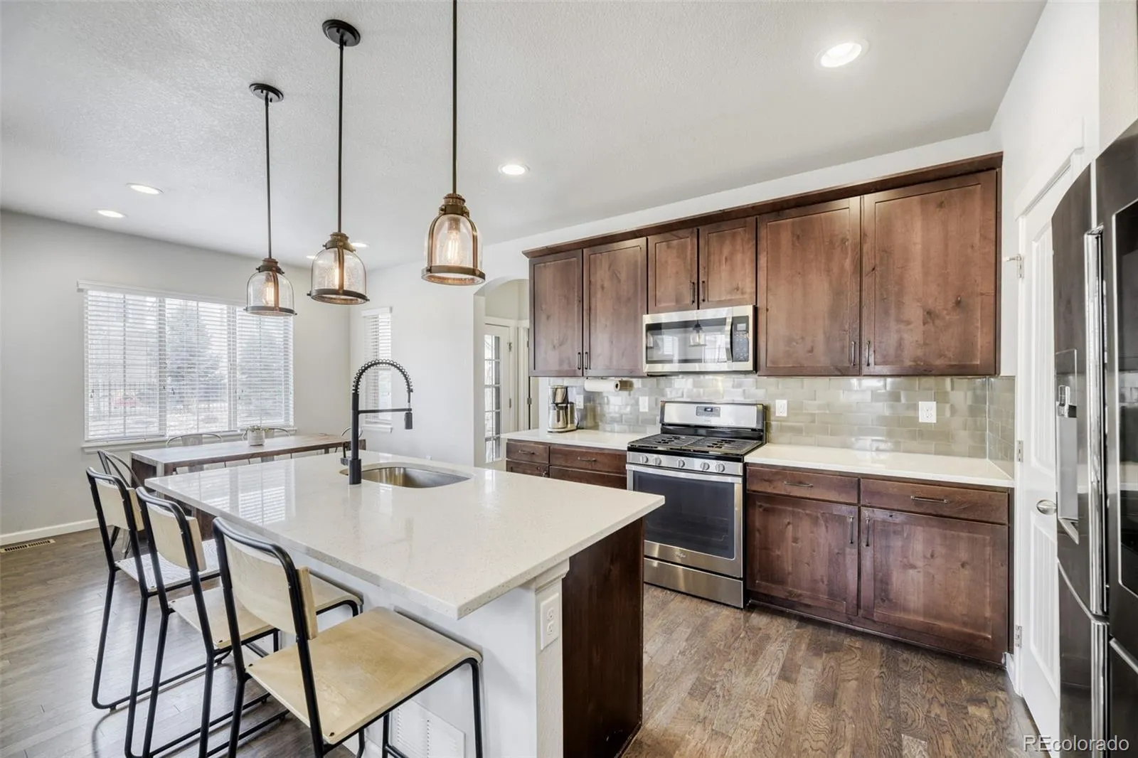 Situated within the highly sought-after Solterra Neighborhood of Lakewood, this spacious residence offers over 3,000-sq-ft of beautifully designed living space and thoughtful storage solutions. Cast in natural light, the main-floor begins with an inviting home office concealed by a pair of French doors for focused work or study, and an alluring living room showcasing a gas fireplace for cozy nights in with family and friends. The sophisticated eat-in kitchen boasts stainless-steel appliances, a coveted pantry and center island with seating. Near the kitchen is a private hallway lending access to a convenient powder room, an oversized two-car garage complete with dedicated storage and epoxy flooring, and a covered back patio outside with stamped concrete extension and meticulously manicured yard beyond. Upstairs, a second-story landing unveils a laundry room with adjacent and admirable linen closet, as well as three secondary bedrooms – one with a full-bath ensuite and walk-in closet. The brilliant primary suite at the end of the hall is a sanctuary devoted to personal space with a dreamy walk-in closet and chic ¾-ensuite with a glass-enclosed shower, dual vanity and a private water closet. Glistening with natural light and posh modern finishes, including luxury vinyl flooring and floating shelves, the polished basement features a sizable family room equipped with a wet bar and clever hidden entrance leading to the utility room. An additional bedroom with a walk-in closet and a refined ¾-bathroom enhance the space. The Solterra Neighborhood provides a vibrant community lifestyle with organized events throughout the year and features a clubhouse, an infinity pool and tennis courts. Outdoor enthusiasts will love the idyllic location established near Green Mountain, Dinosaur Ridge and the scenic Red Rocks Park and Amphitheatre. Close proximity to C-470 and I-70 make it easy to get out and explore the stunning Rocky Mountains and the vibrant Mile High City.