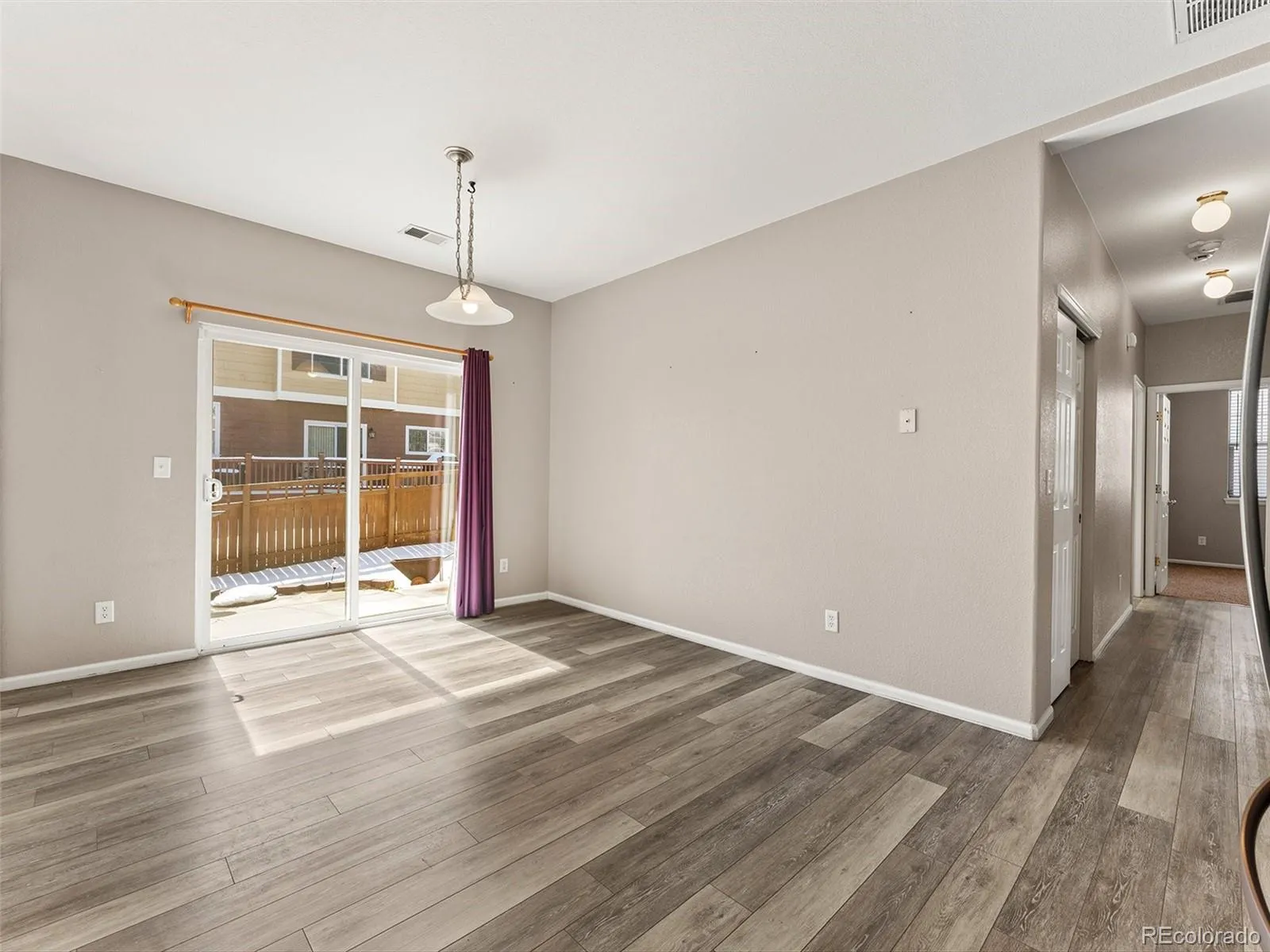 The kitchen with dining nook opens directly to a large backyard deck, ideal for entertaining, relaxing, or enjoying Colorado’s beautiful weather. The private and flat backyard includes a storage shed and plenty of room to enjoy outdoor living.